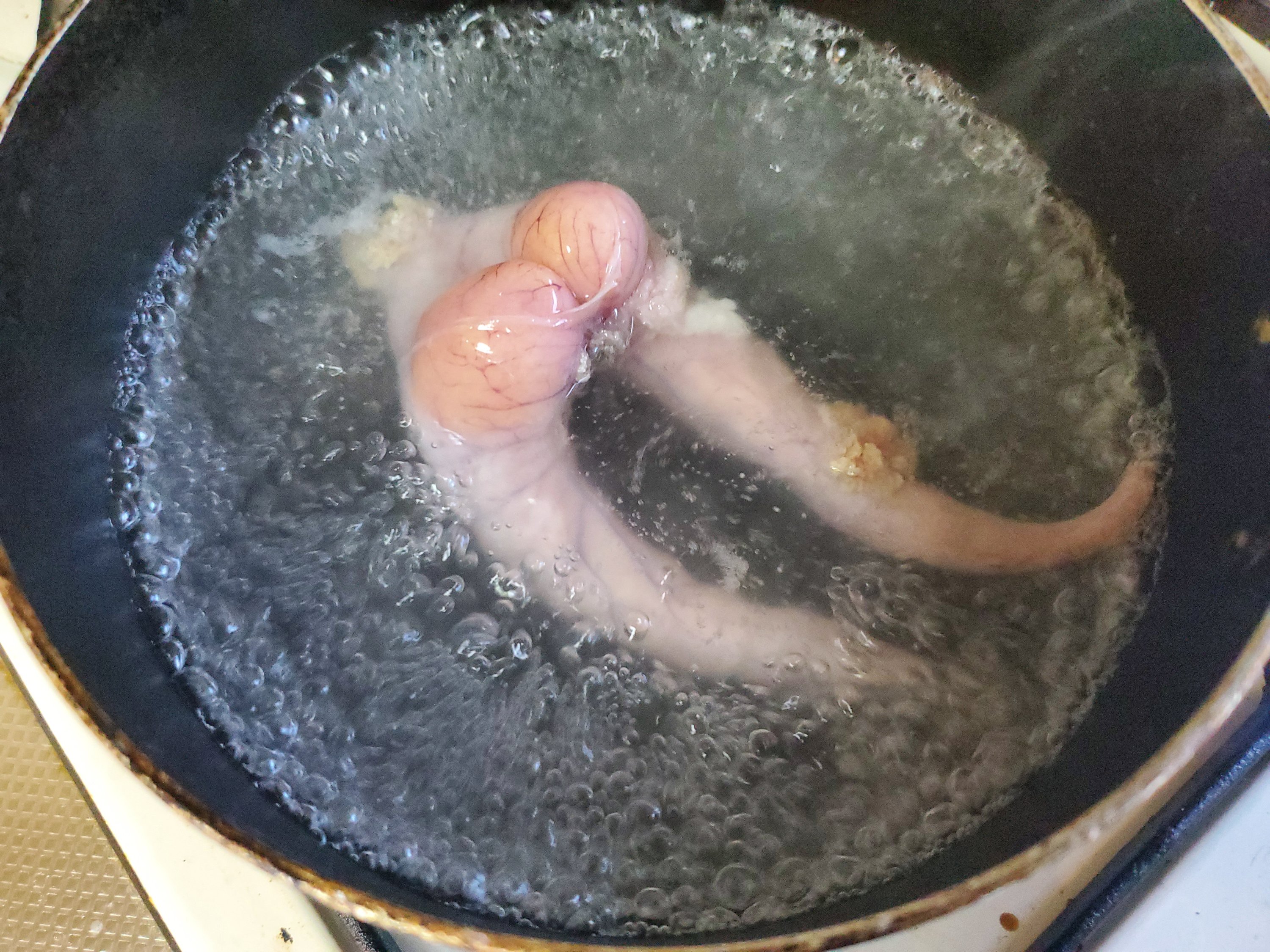くさみを取るのが目的ですが、それ以外に縁側の皮についているウロコも、下茹でをしてから水で洗い流すときれいにとることができるのがポイント。