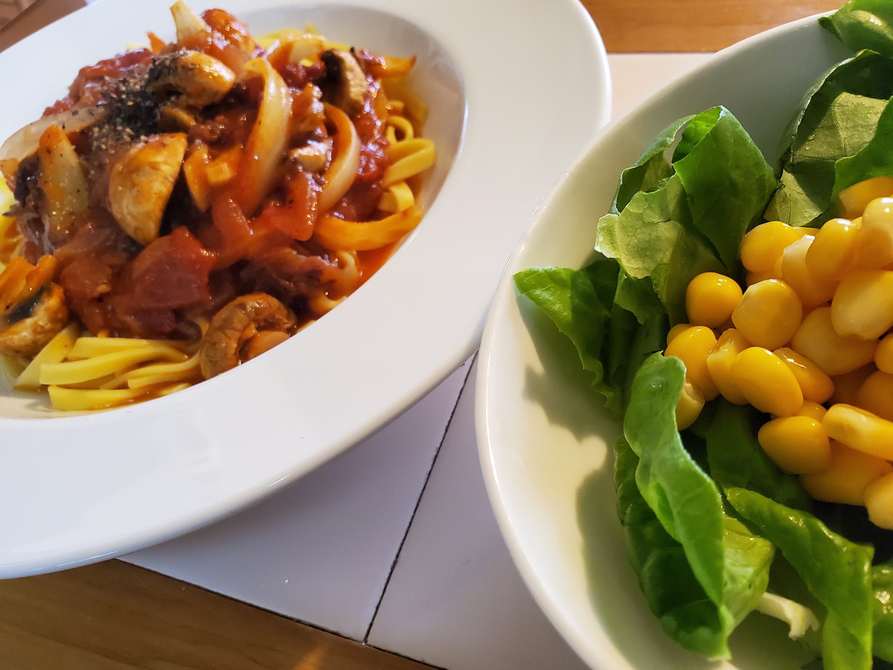 コーンたっぷりのサラダを添えて。