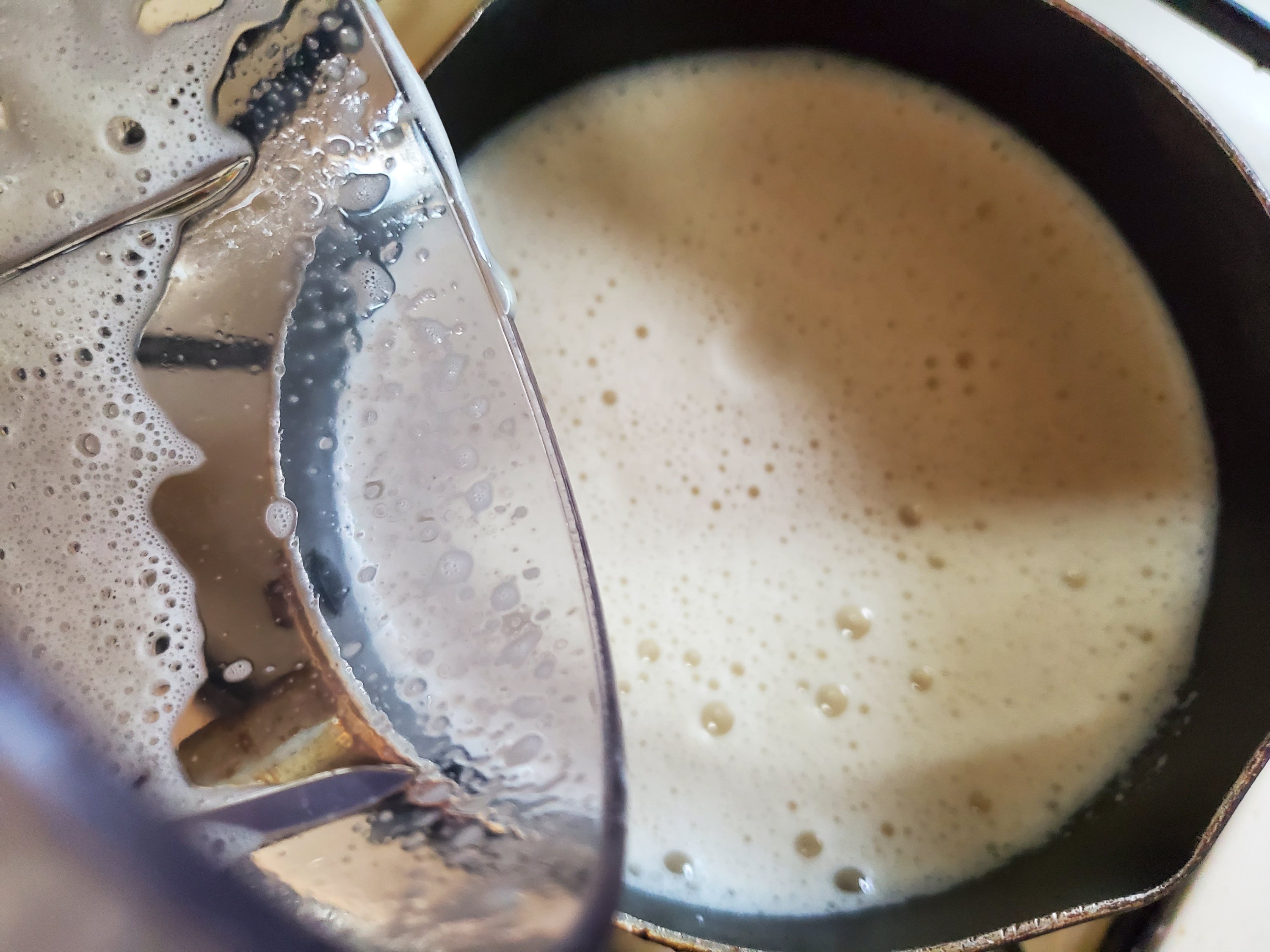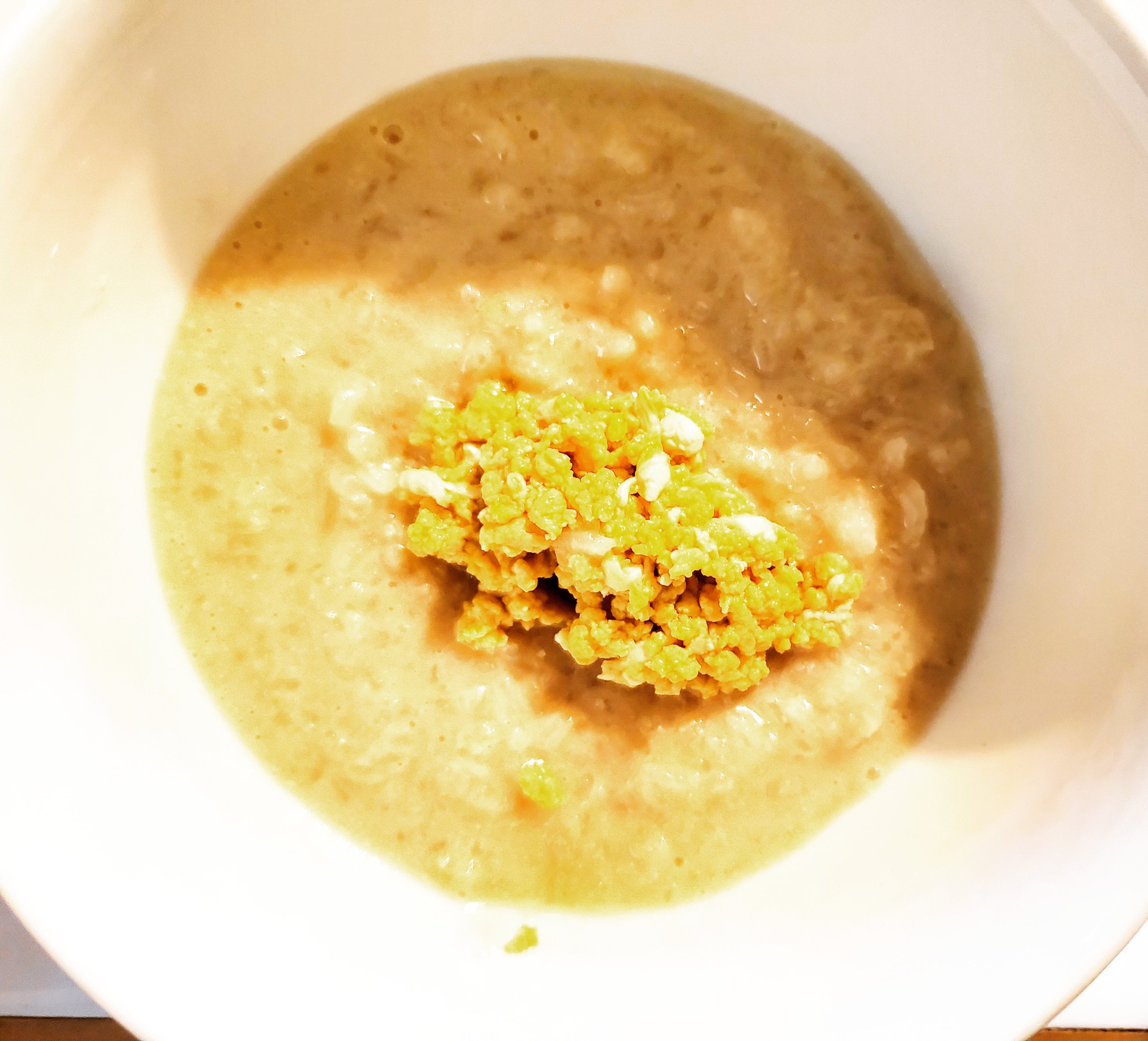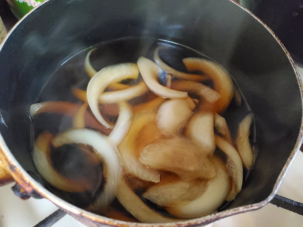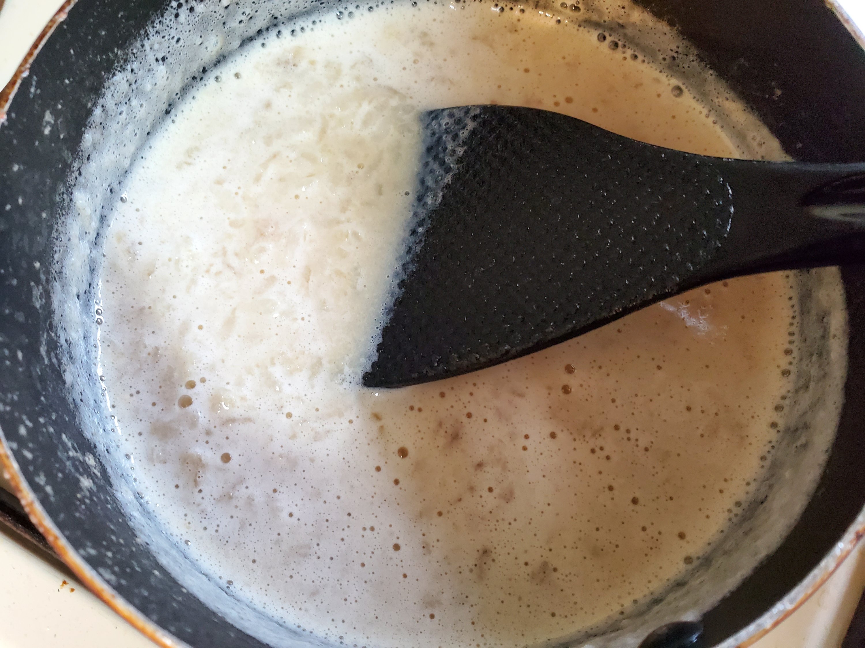 ご飯とオニオンスープが一体になって、ふつふつと泡が立つくらいにとろみがついたらできあがり。