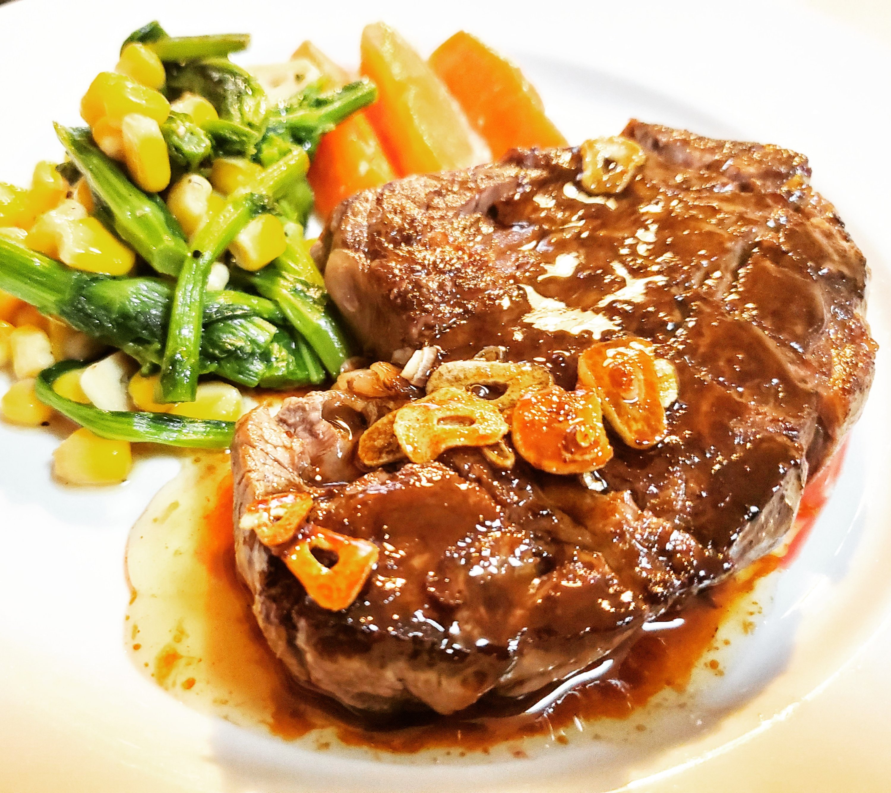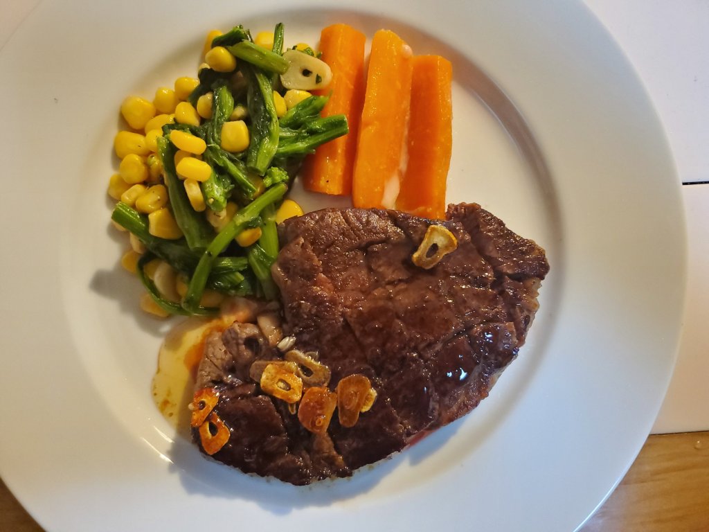 今回の付け合わせはにんじんのグラッセに、青菜とコーンのバターソテー。