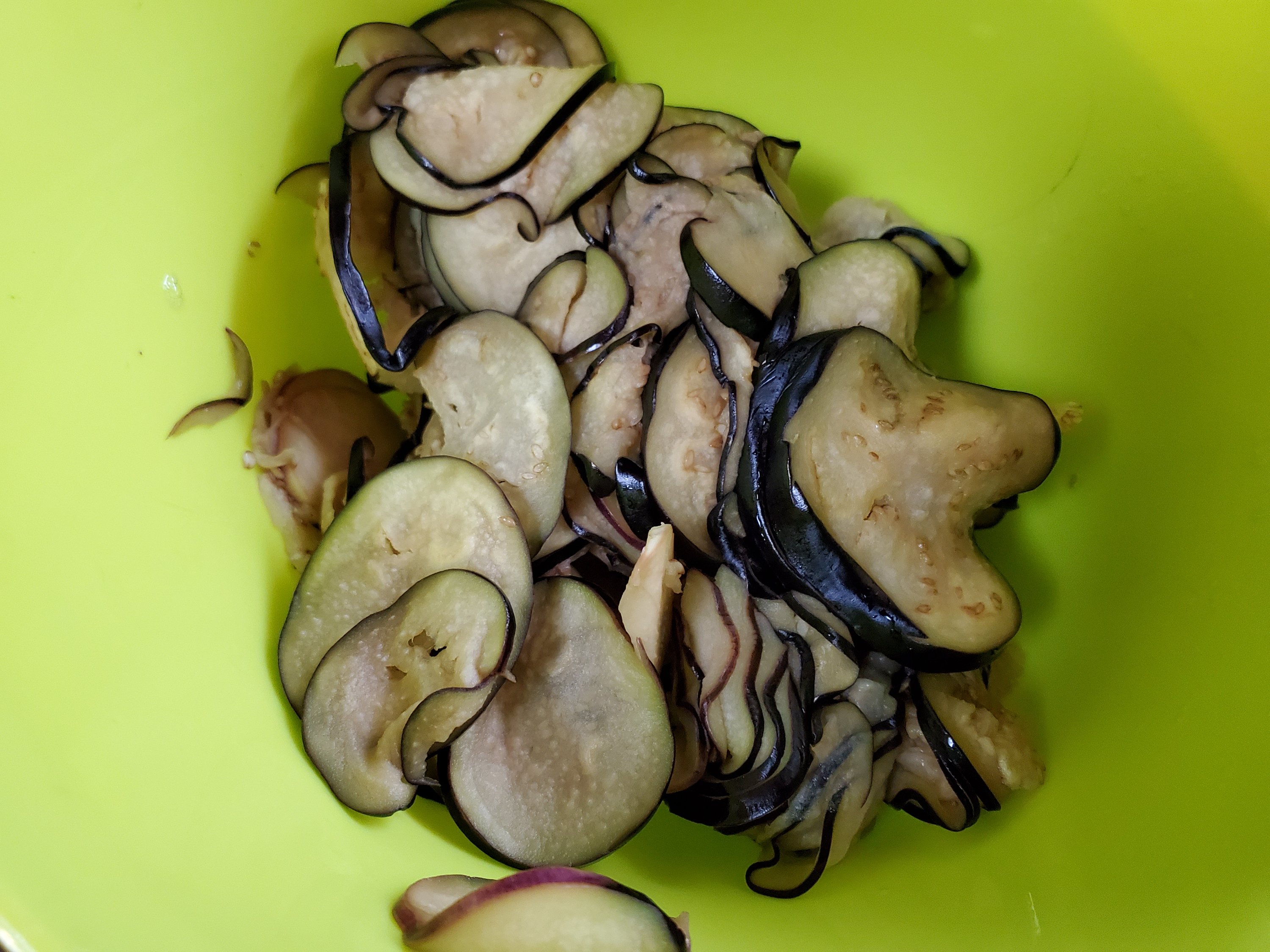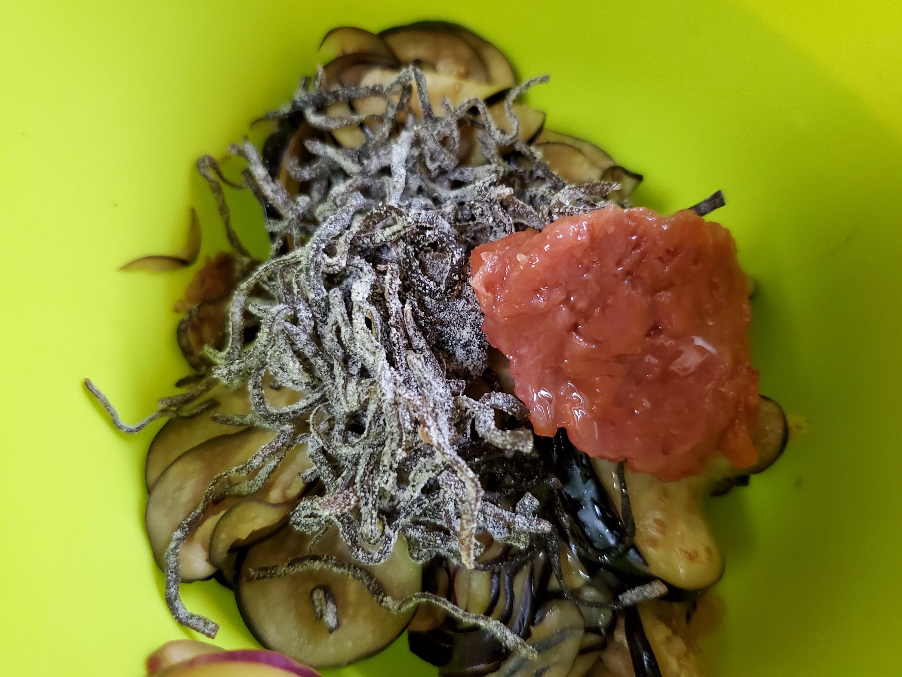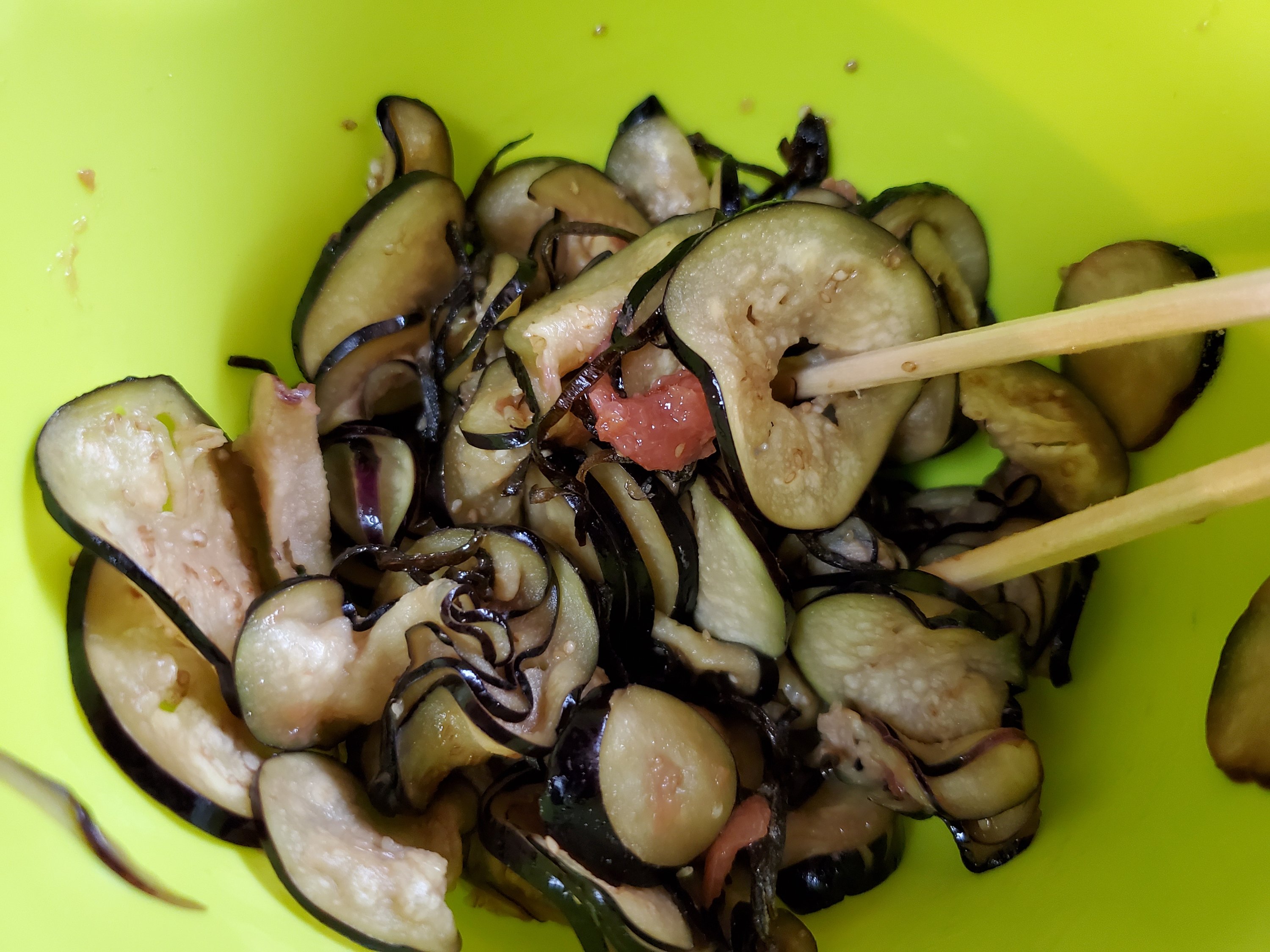ボウルに茄子と塩昆布、梅干しを入れます。