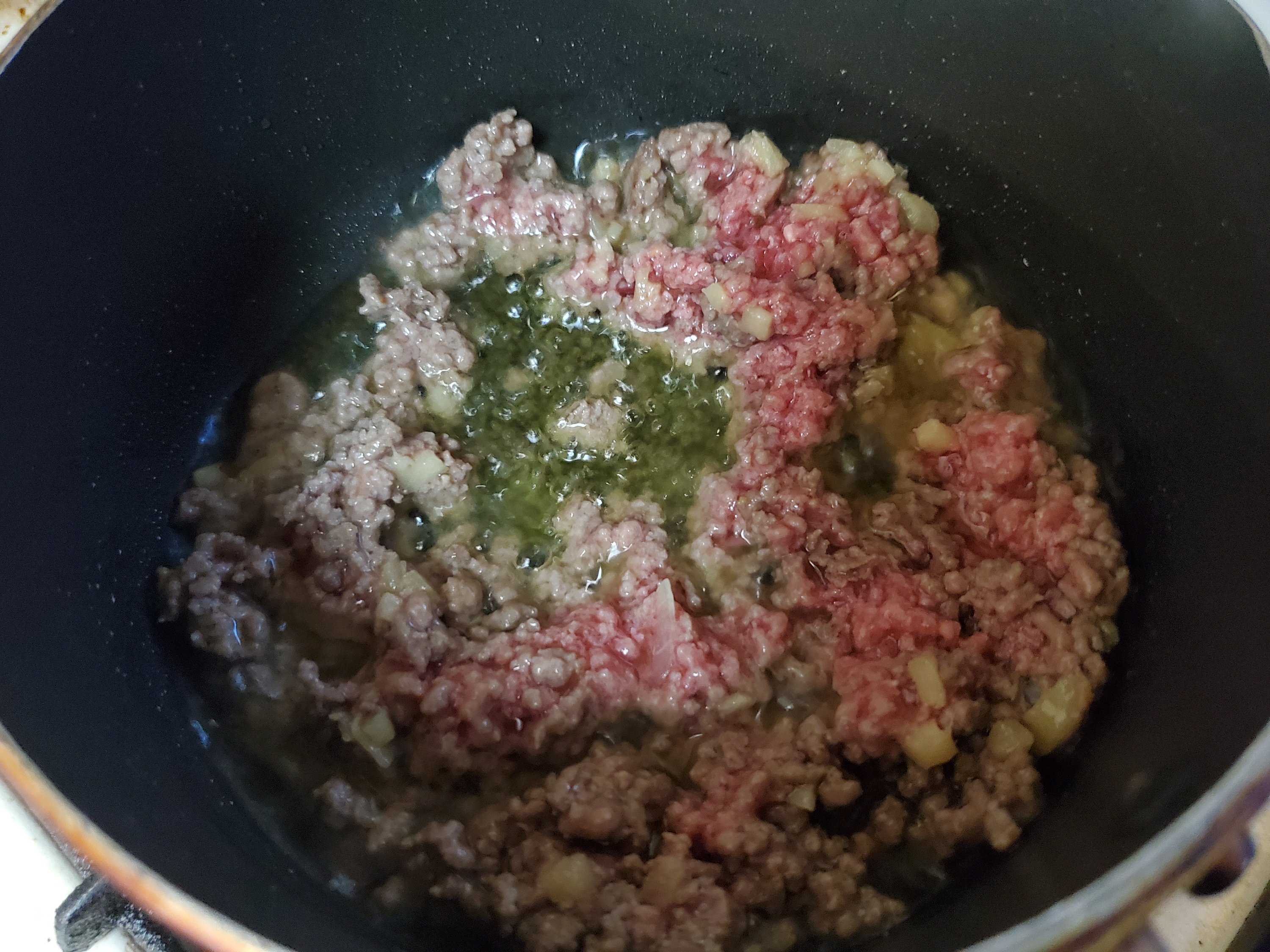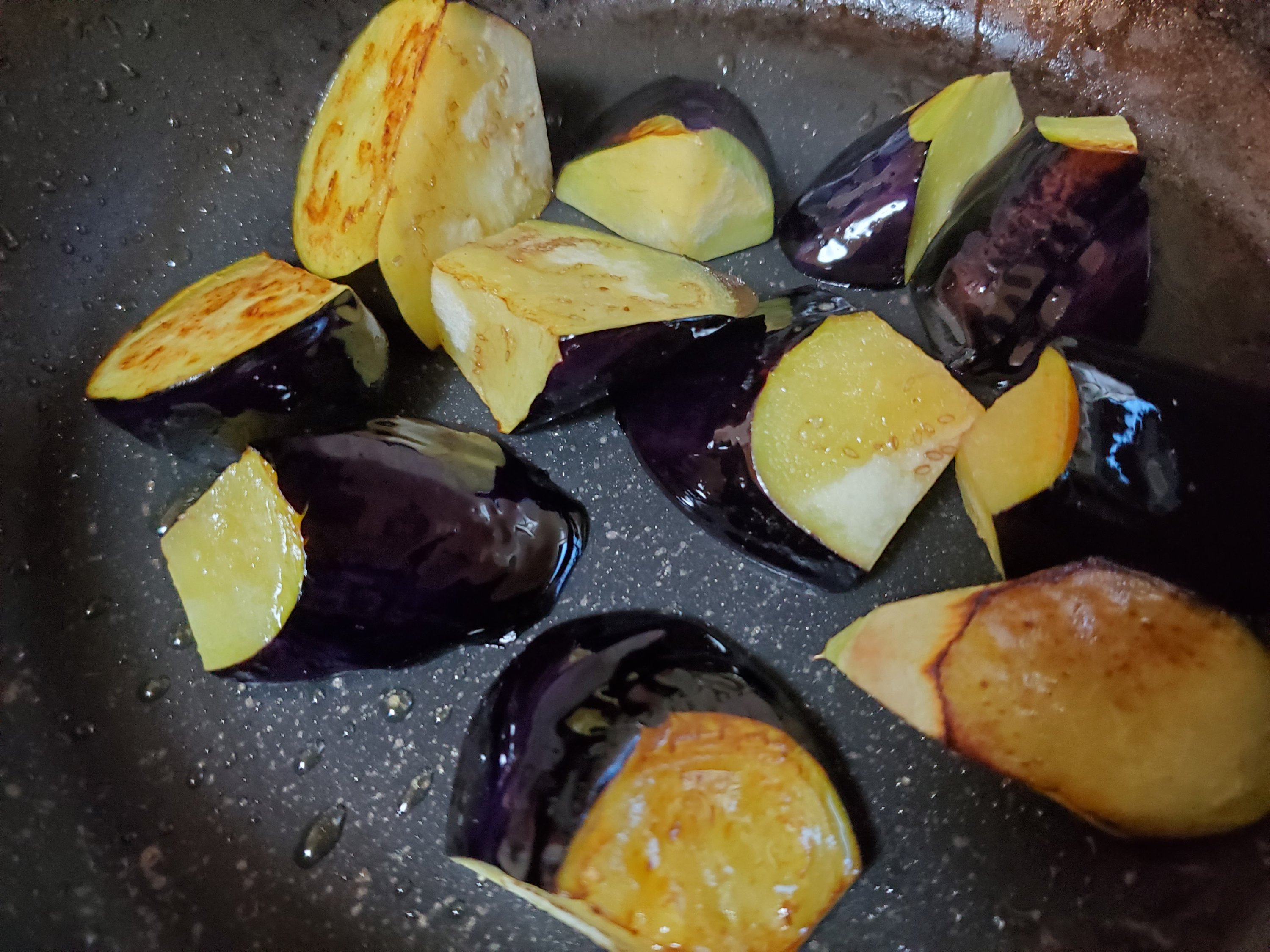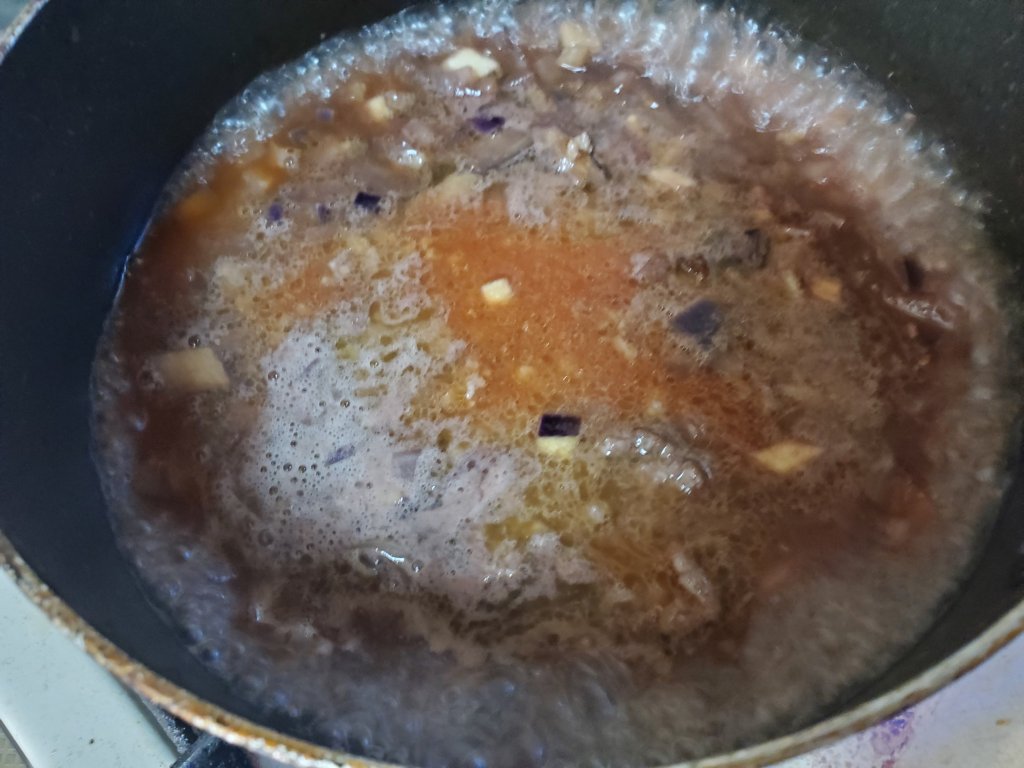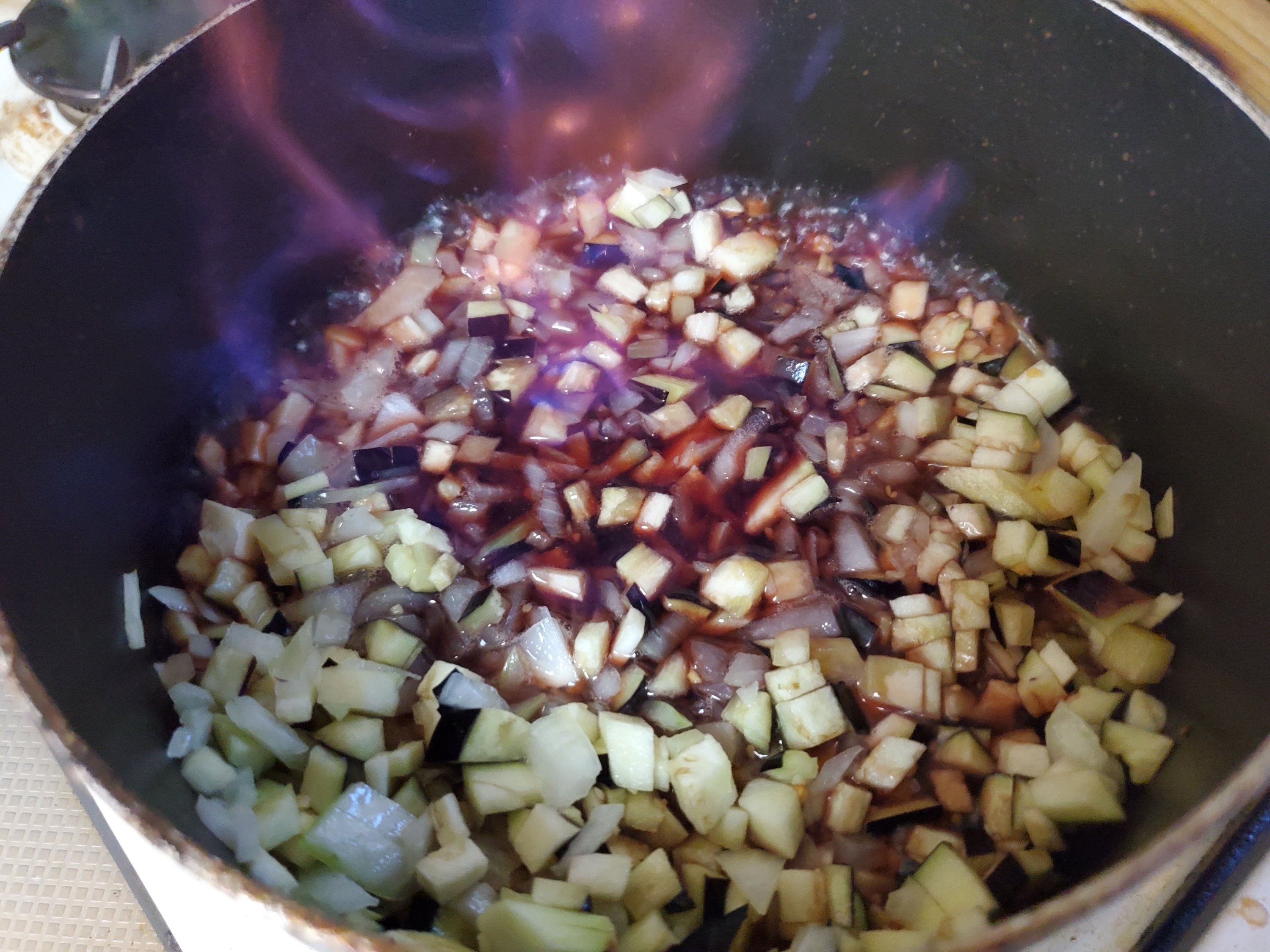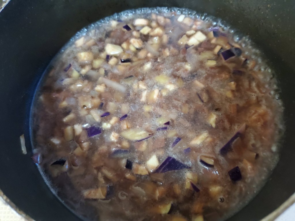ひき肉の色が変わったら、なすの鍋に合わせて、コンソメを注ぎます。