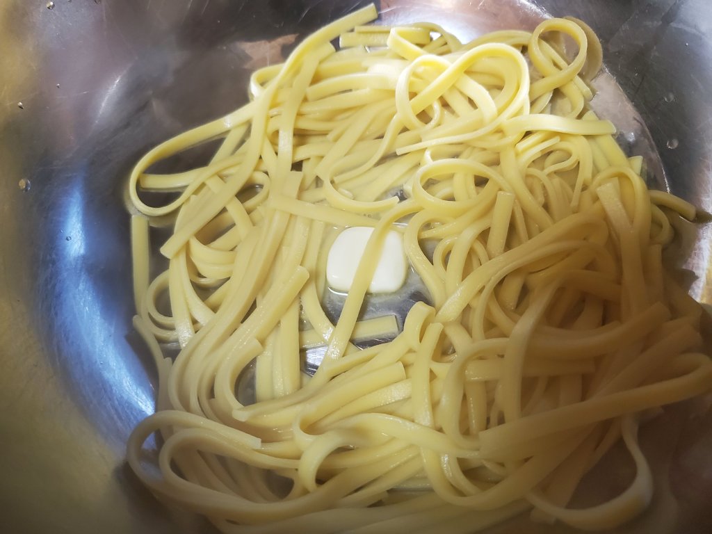 今回は平打ち麺のフェットチーネを使いますが、お好みでスパゲティなどでも大丈夫です。