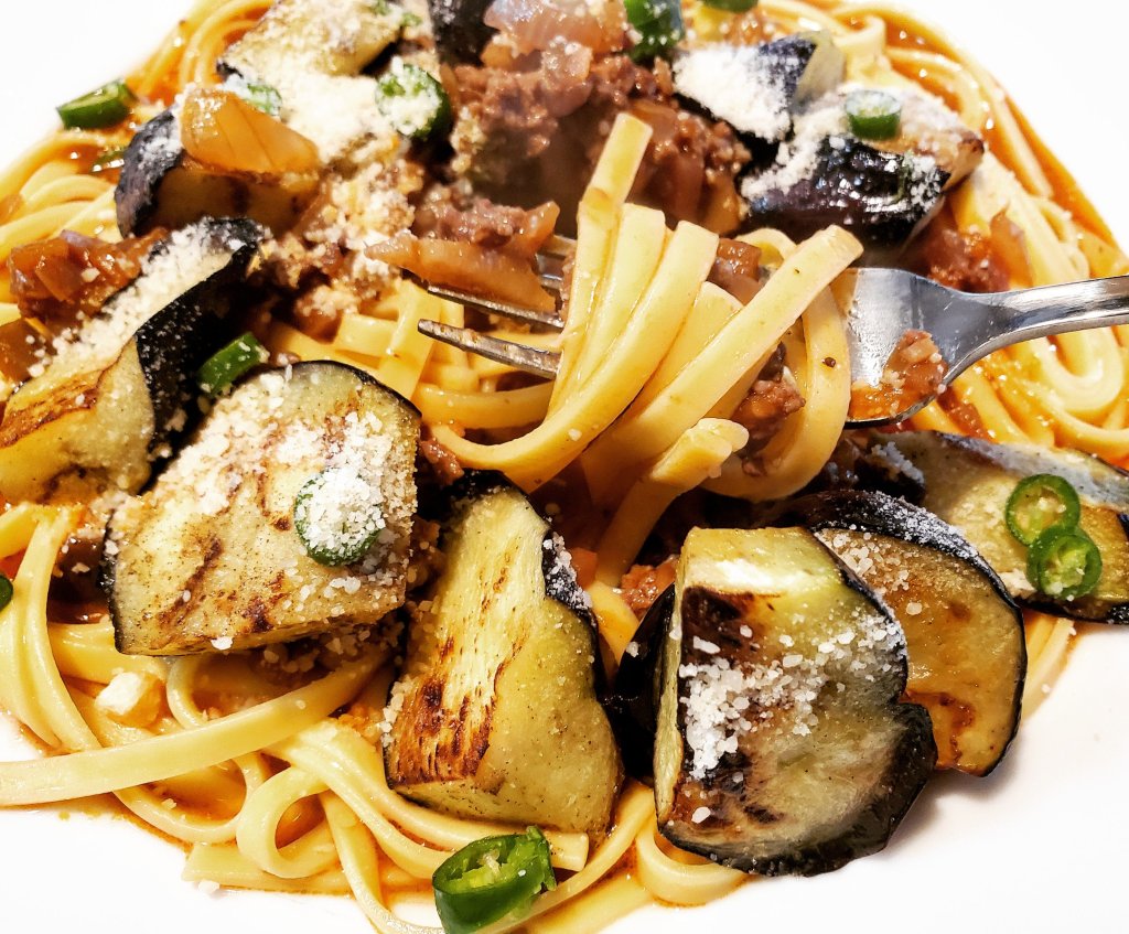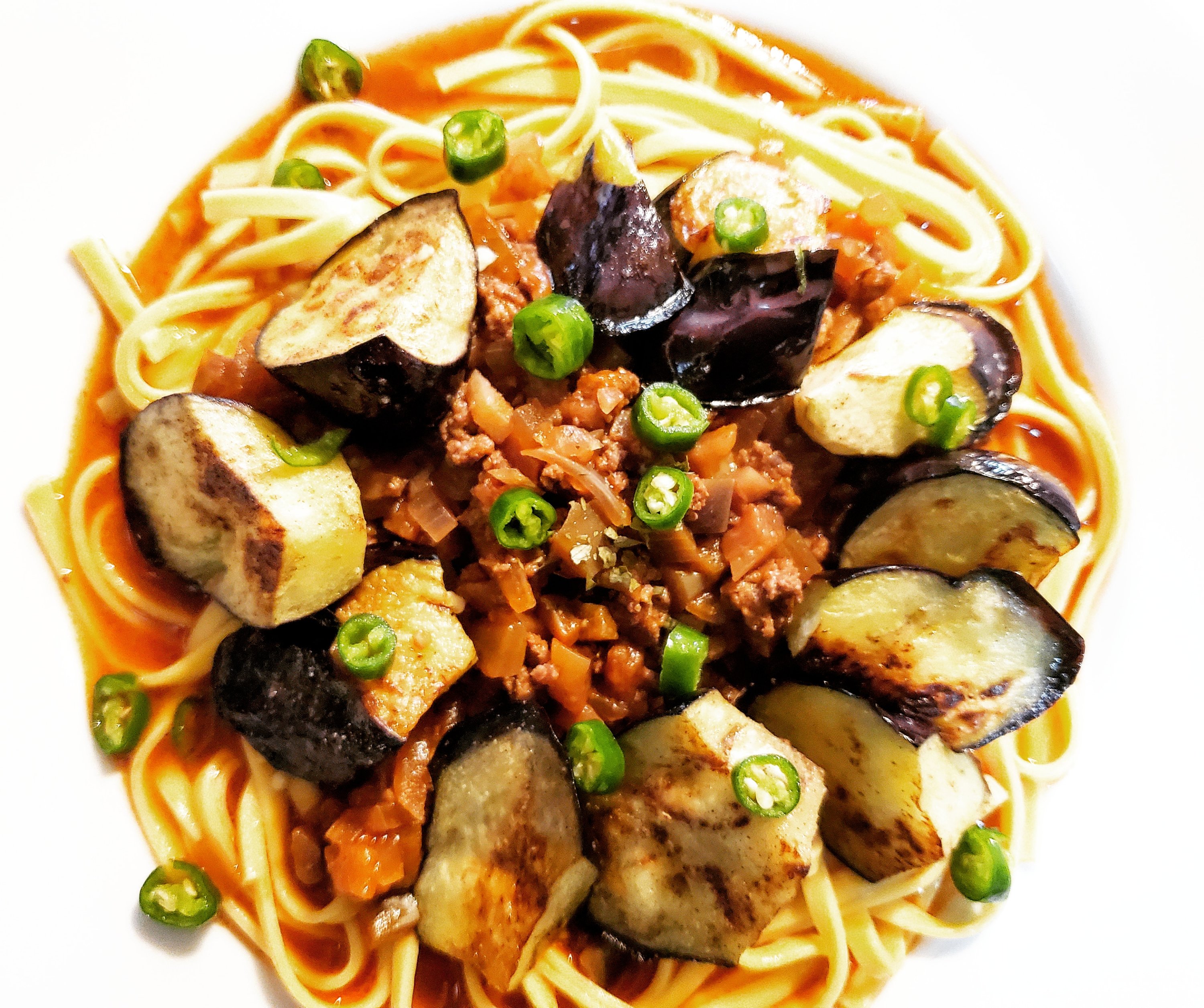 パスタをお皿に盛ったらソースをかけて、ソテーしたなすをトッピング🍆