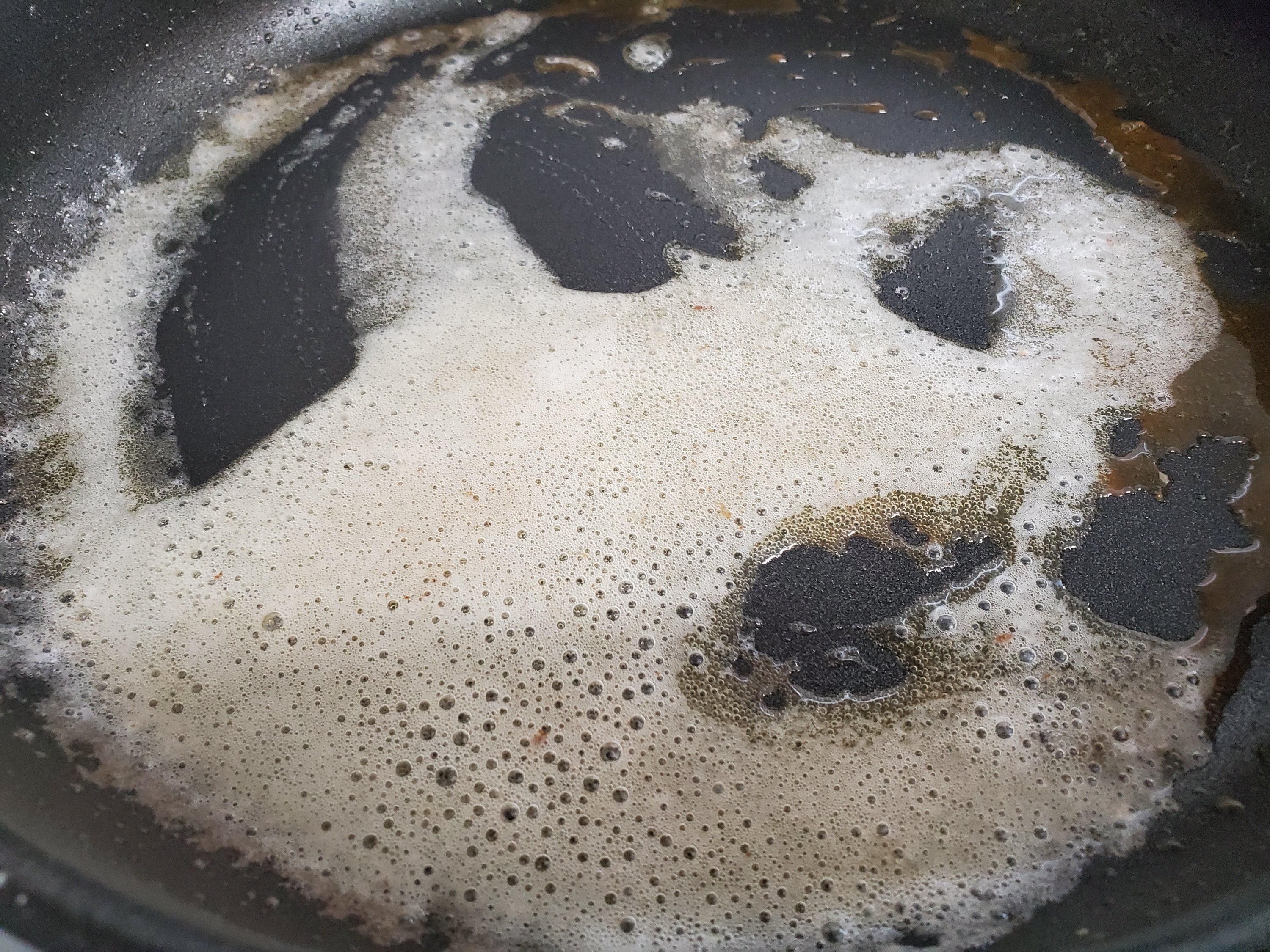 バターが溶けて泡立ってきたら、こんがりとした茶色になるまで熱します。