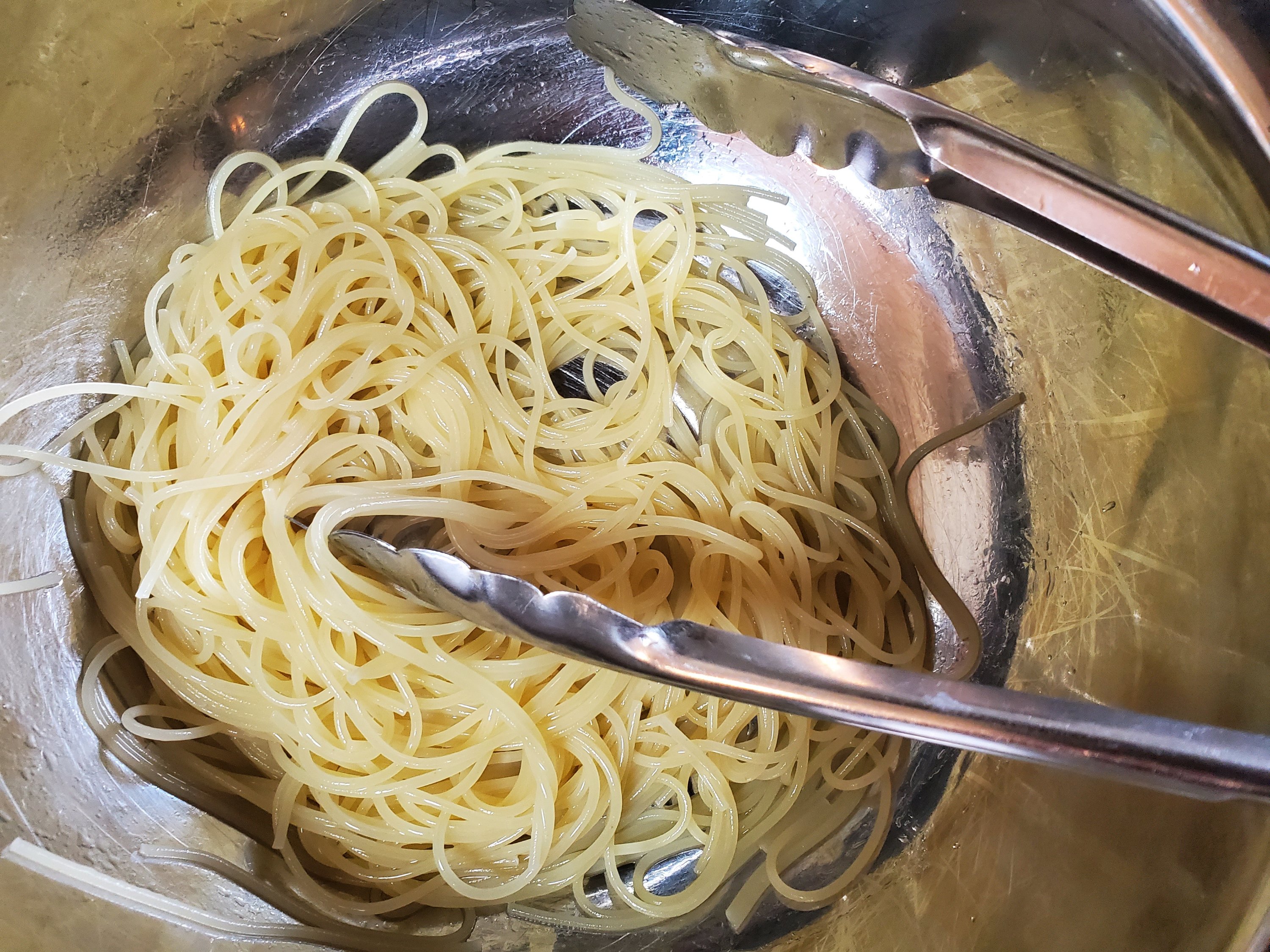 カッペリーニは表示時間より1分ほど長く茹でて、冷水にとって冷ましたら、ボウルに入れてオリーヴオイルで和えます。