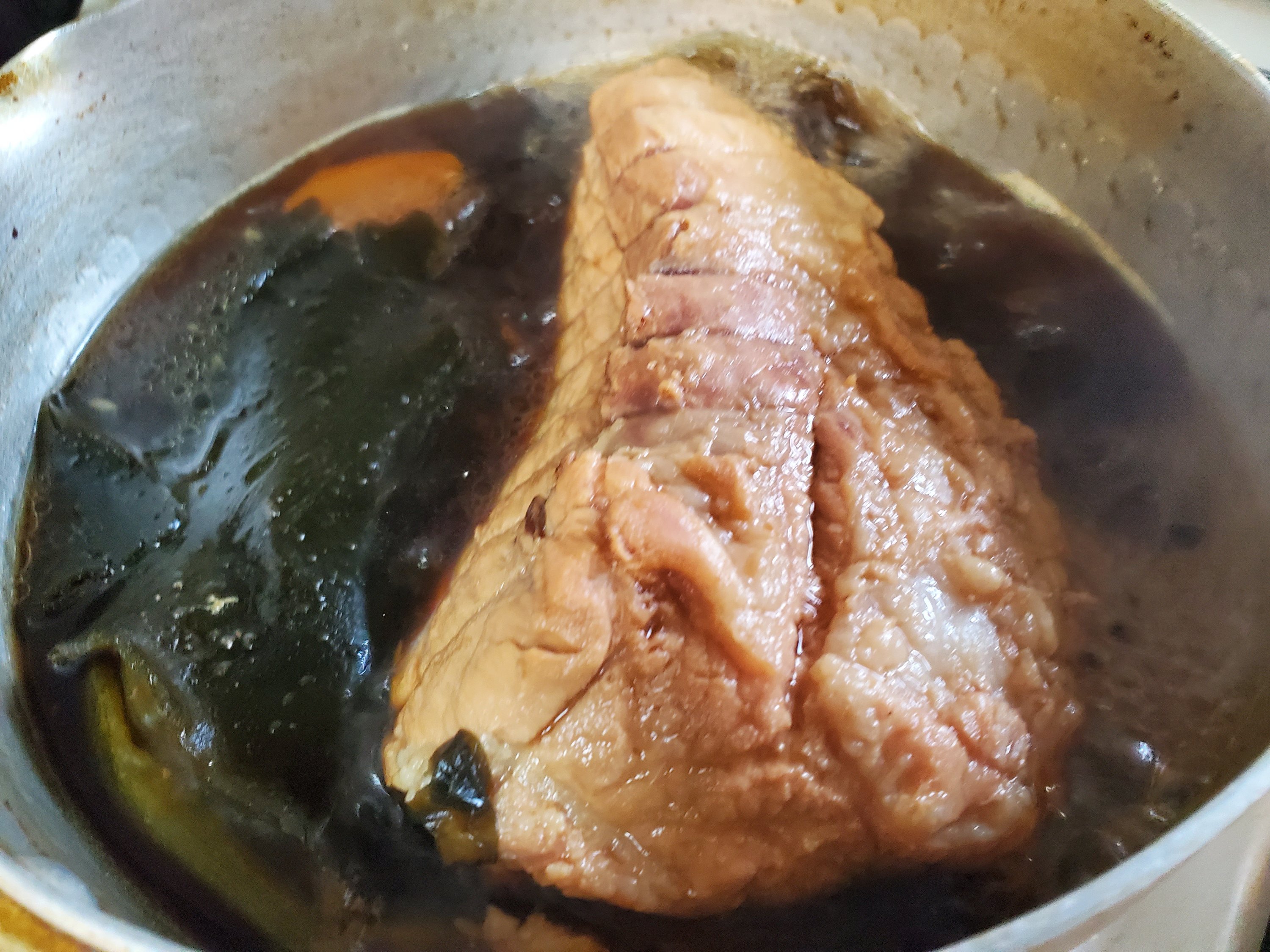 豚肉は水に昆布と醤油、みりん、砂糖を入れた煮汁でじっくりと味を染ませながら煮込みます。