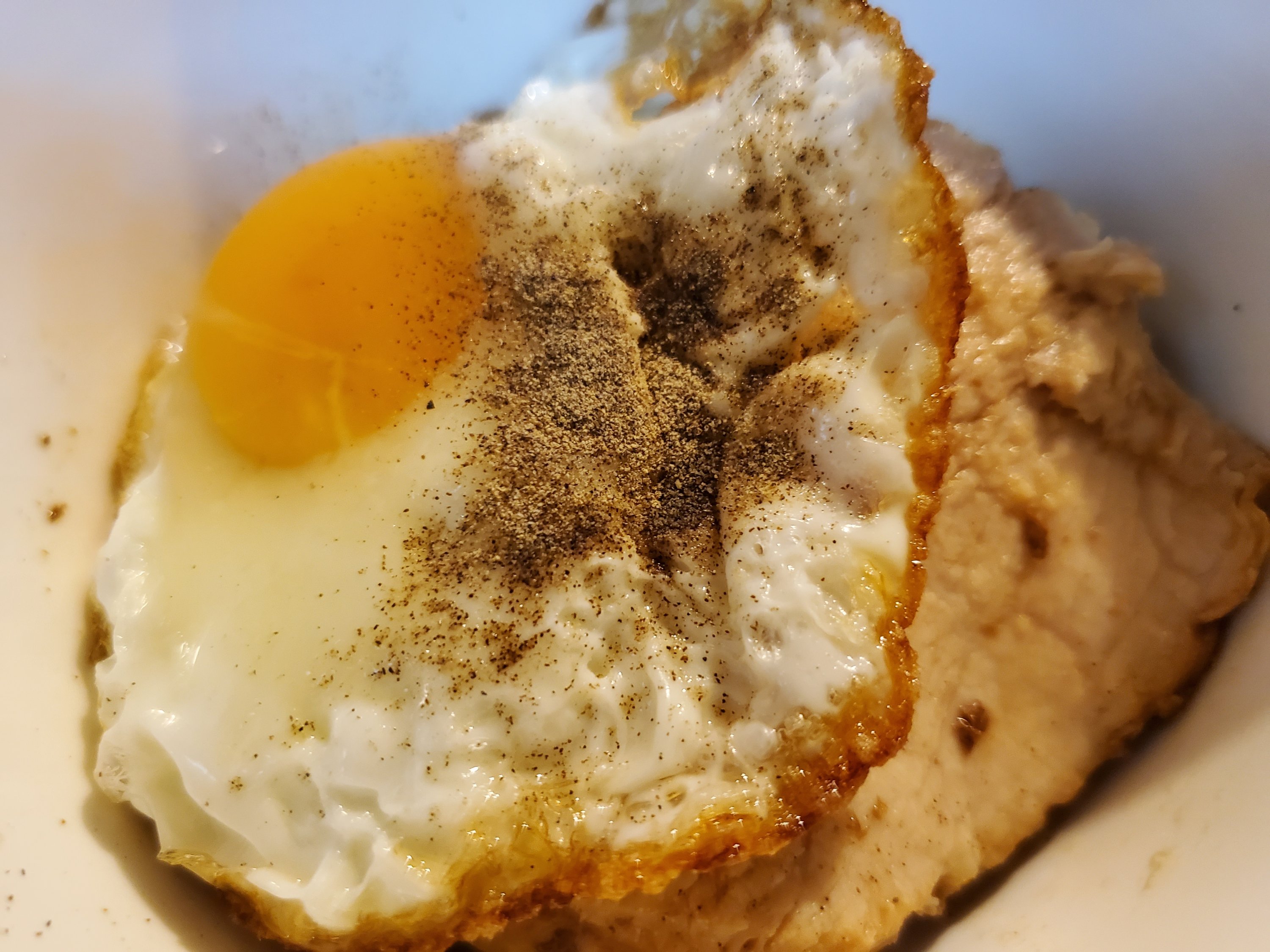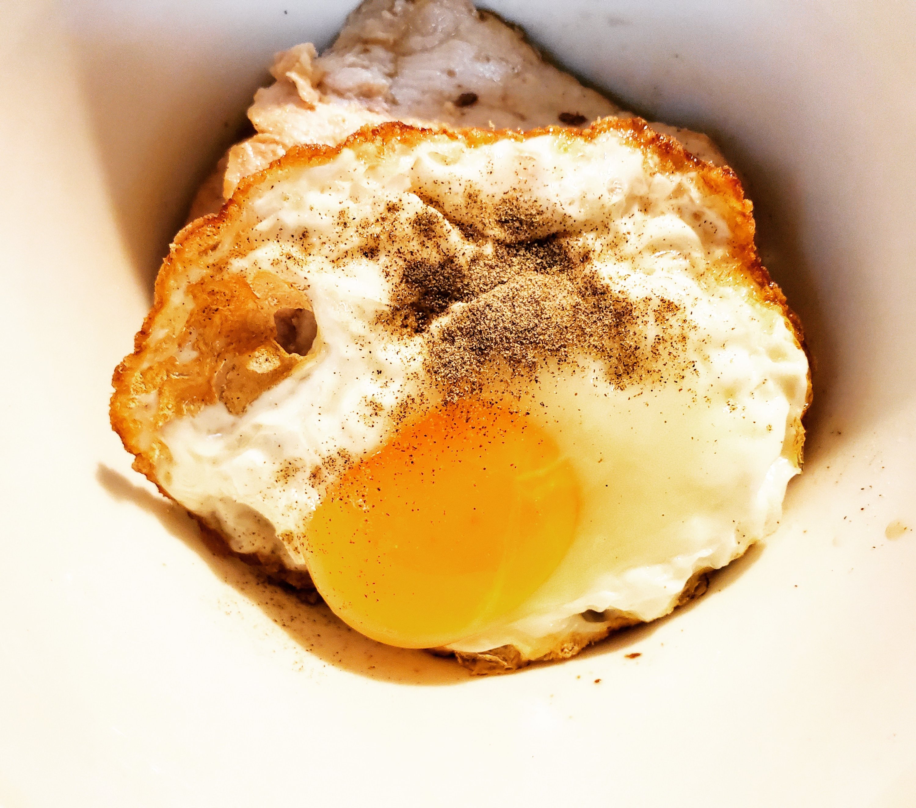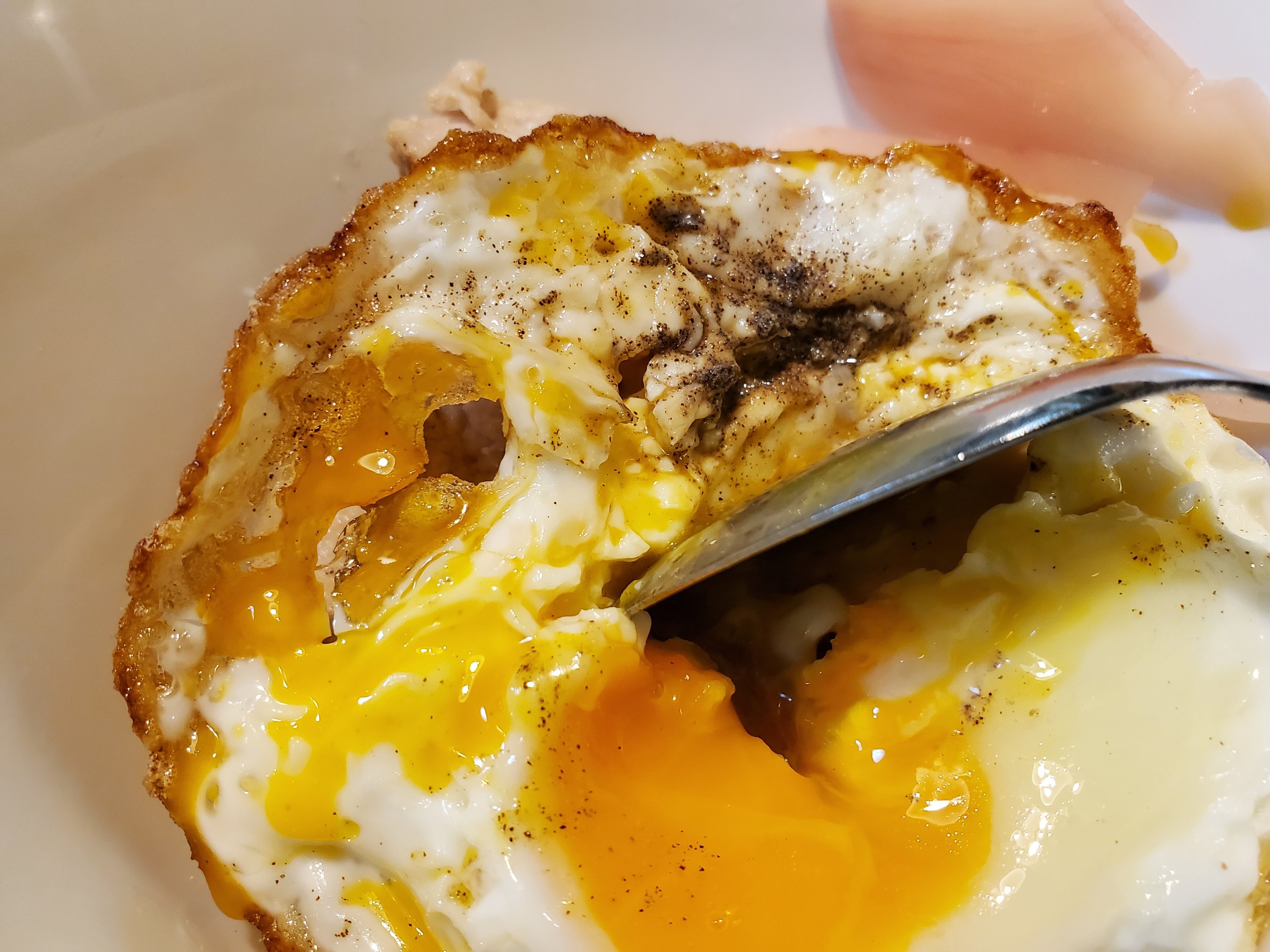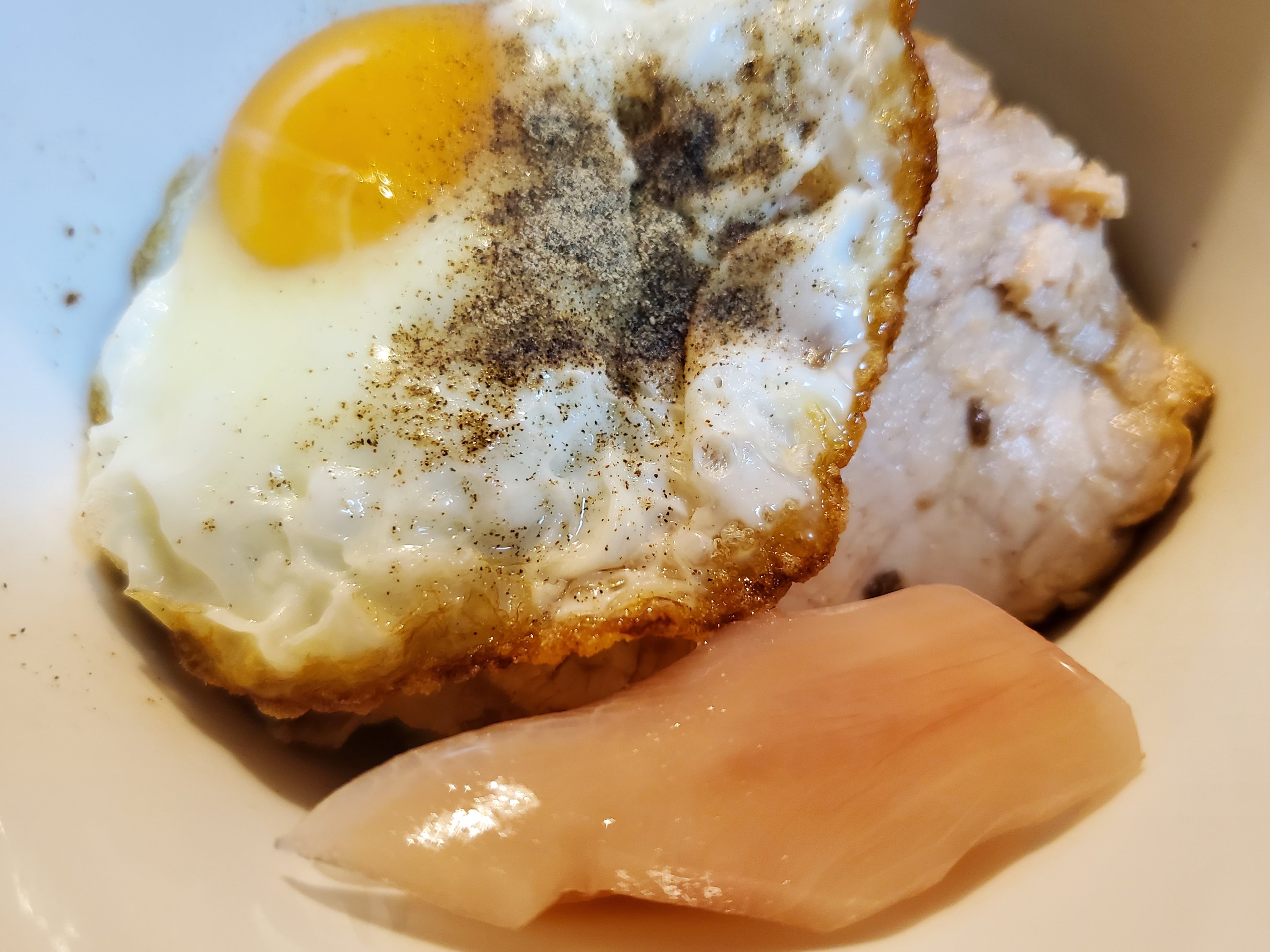 米飯の上にまず薄く切った叉焼(煮豚)をのせ、さらに半熟の目玉焼きをのせてから焼豚のタレで味付けした丼物料理。