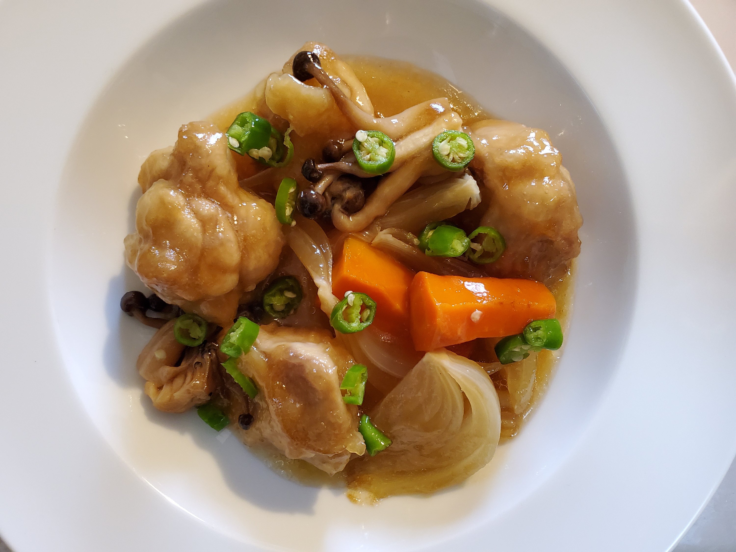 今回作るのは、揚げた鶏肉をモニタープレゼントとしていただいたタカラ本みりんを使って煮込んだ、てりてりが鮮やかな煮物です。