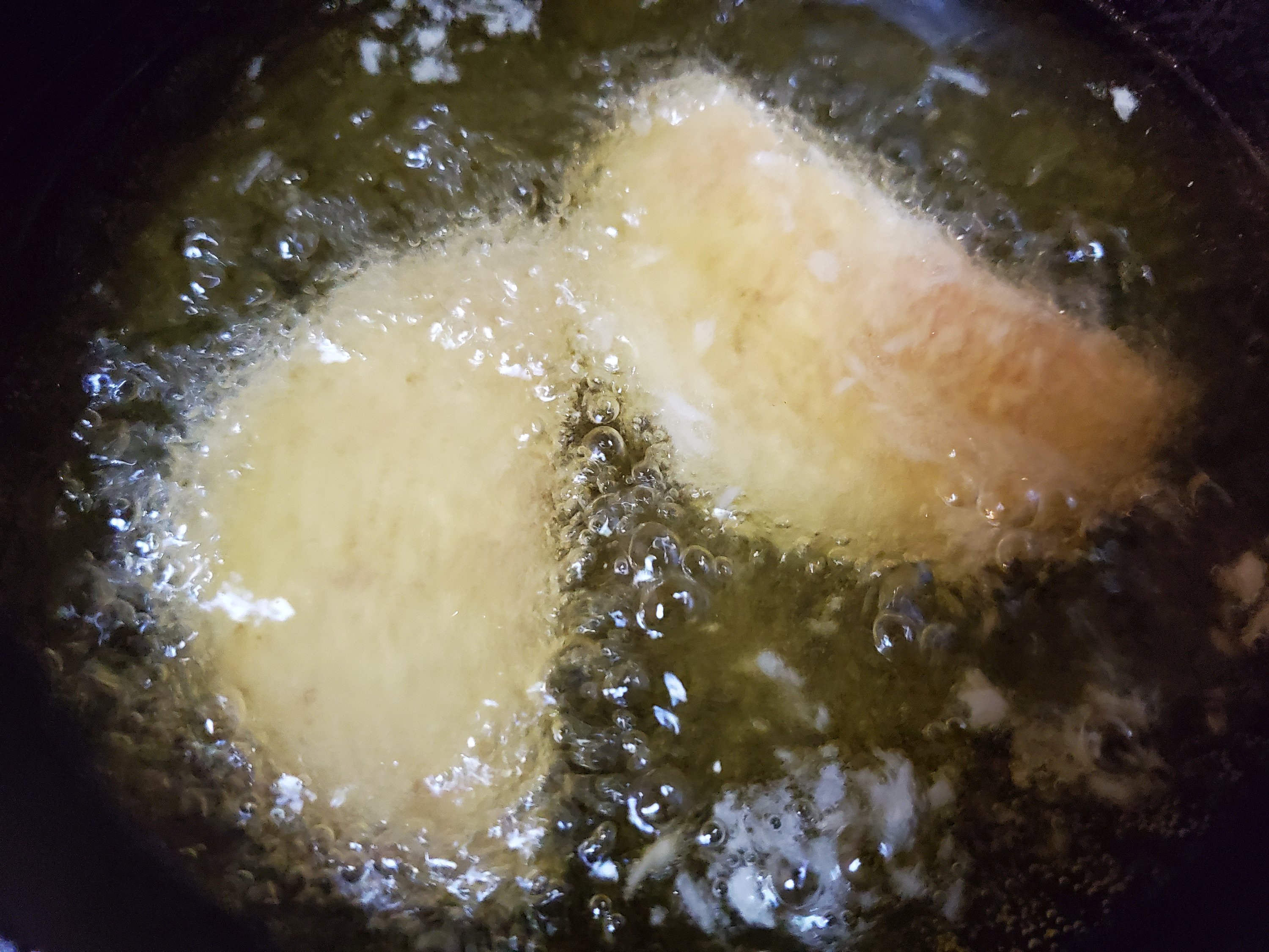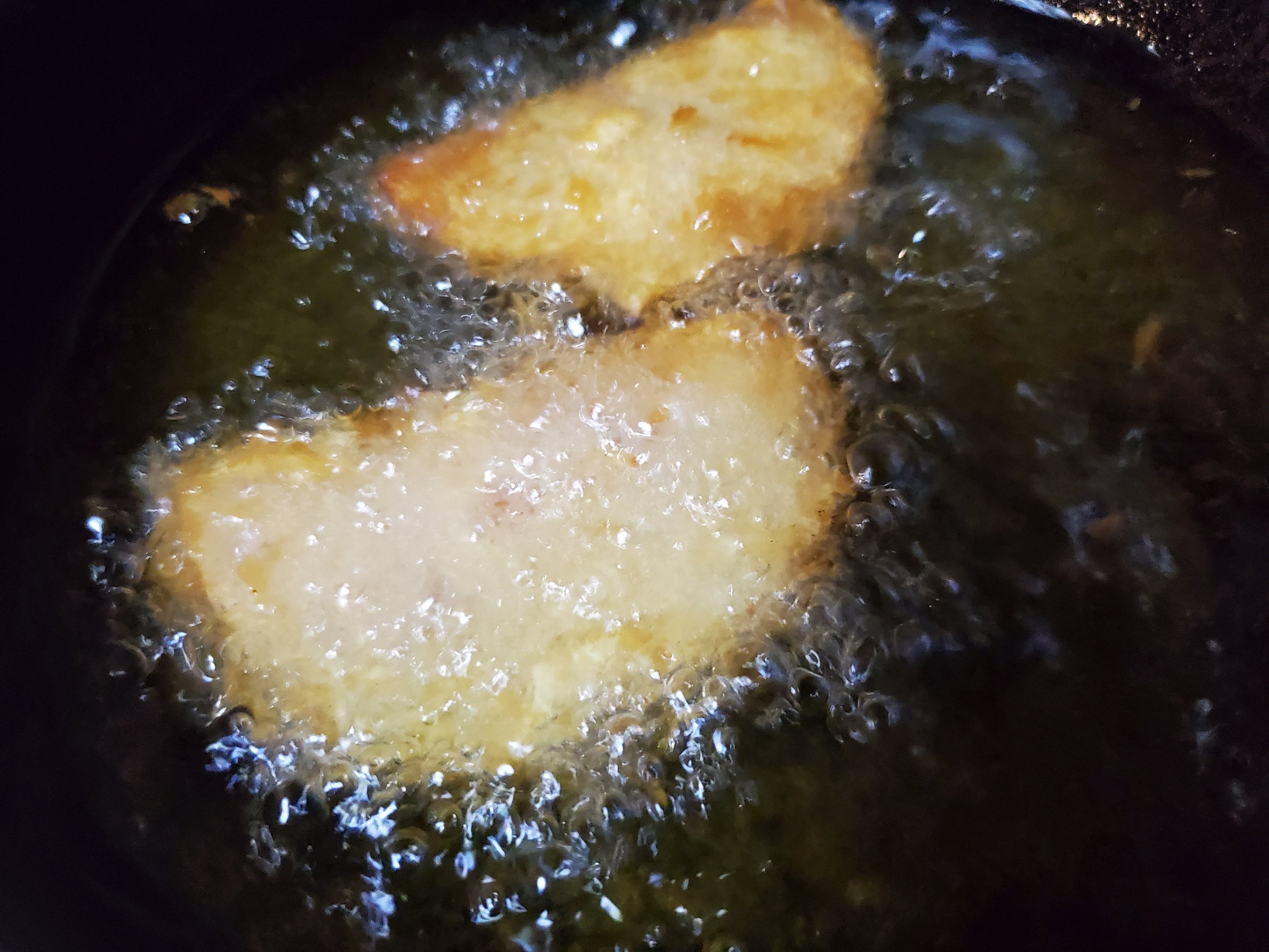 中身のハムは薄くて火通りも気にしなくていいので、高温でかりっと揚げ色を付ける感じで揚げていきます。