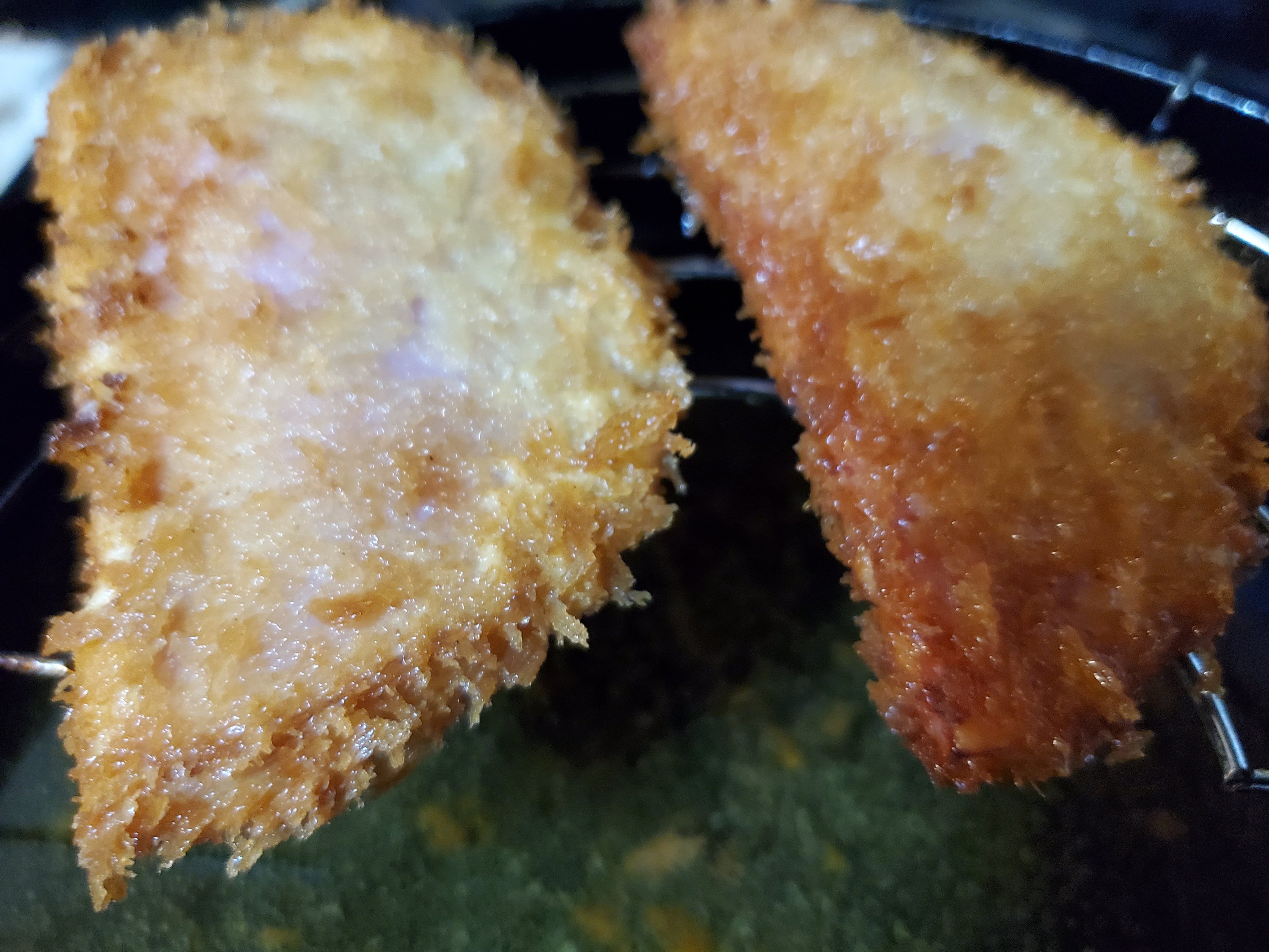 チーズ入りは、揚げているときにカットした部分からチーズが漏れないように、切り口にはしっかりとパン粉をつけるようにします。