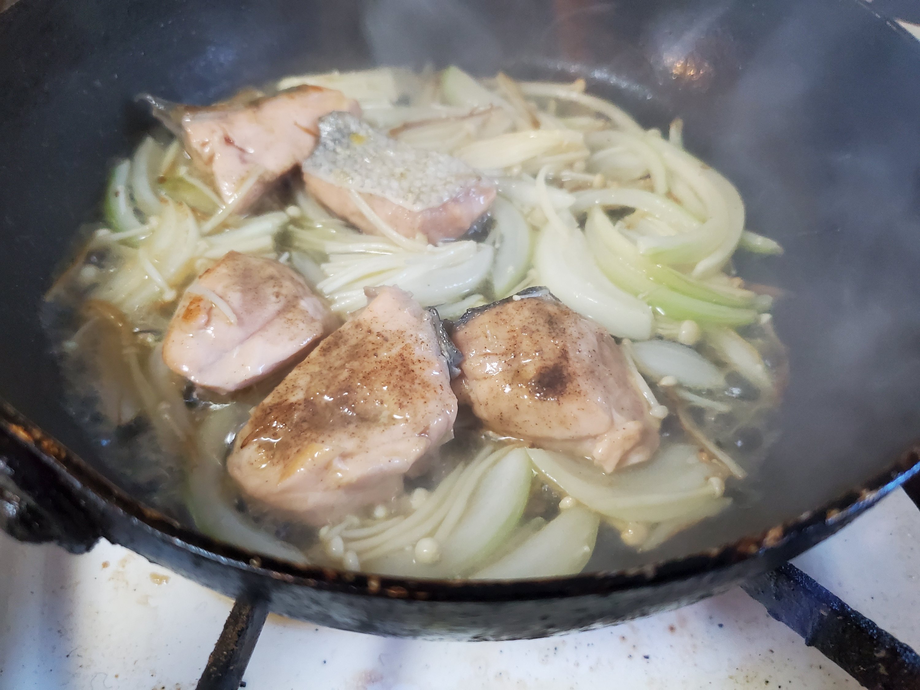玉ねぎがしんなりしてきたら鮭を入れ、色が変わったら、白ワインをふり入れます。