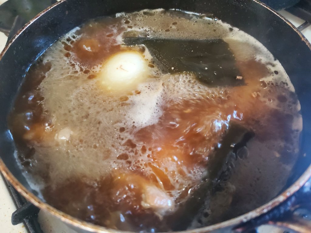 だいたい40~50分煮るイメージですので、30分ほど煮たら、殻をむいた茹で卵を入れます。。