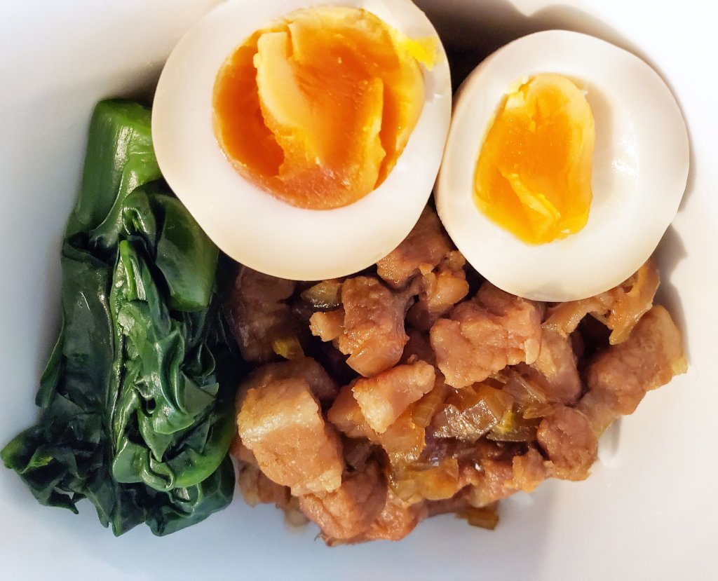 盛り付けたご飯の上に豚肉を煮汁ごと欠けて、卵と茹でた青菜を添えたらできあがりです😋