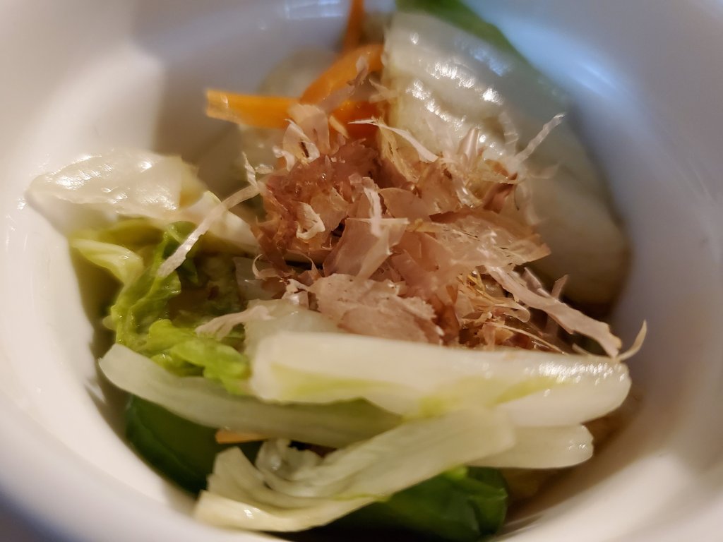 食べるときはかつおぶしを飾って、お好みで醤油をたらしてどうぞ。