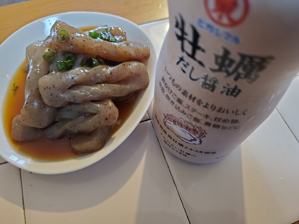旨味のしっかりしたヒガシマル 牡蠣だし醤油に青唐辛子のからみがいいアクセント。
