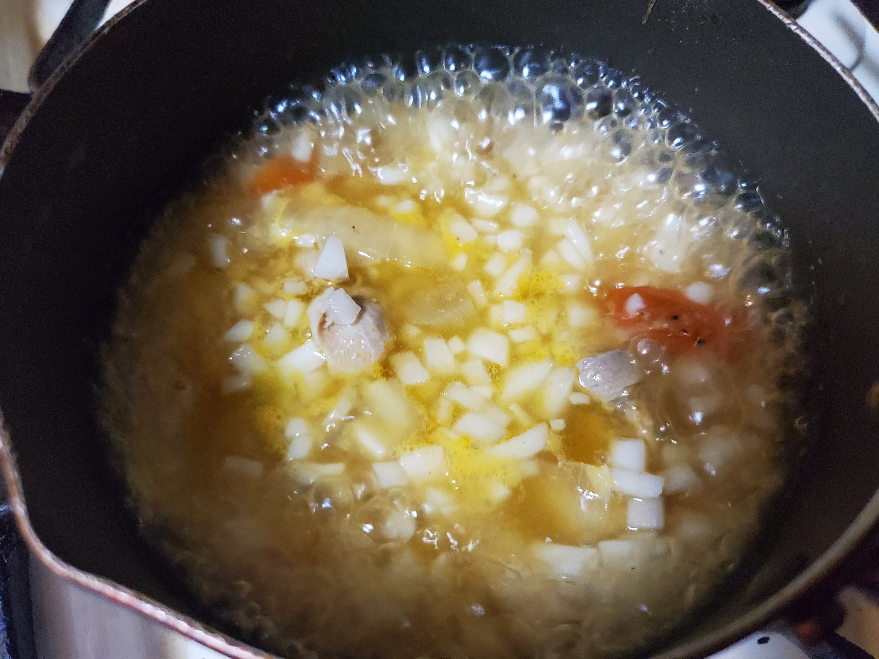 にんにく、玉ねぎを薄切りにして、ミニトマトと一緒にコンソメで煮込んだスープがベースです。