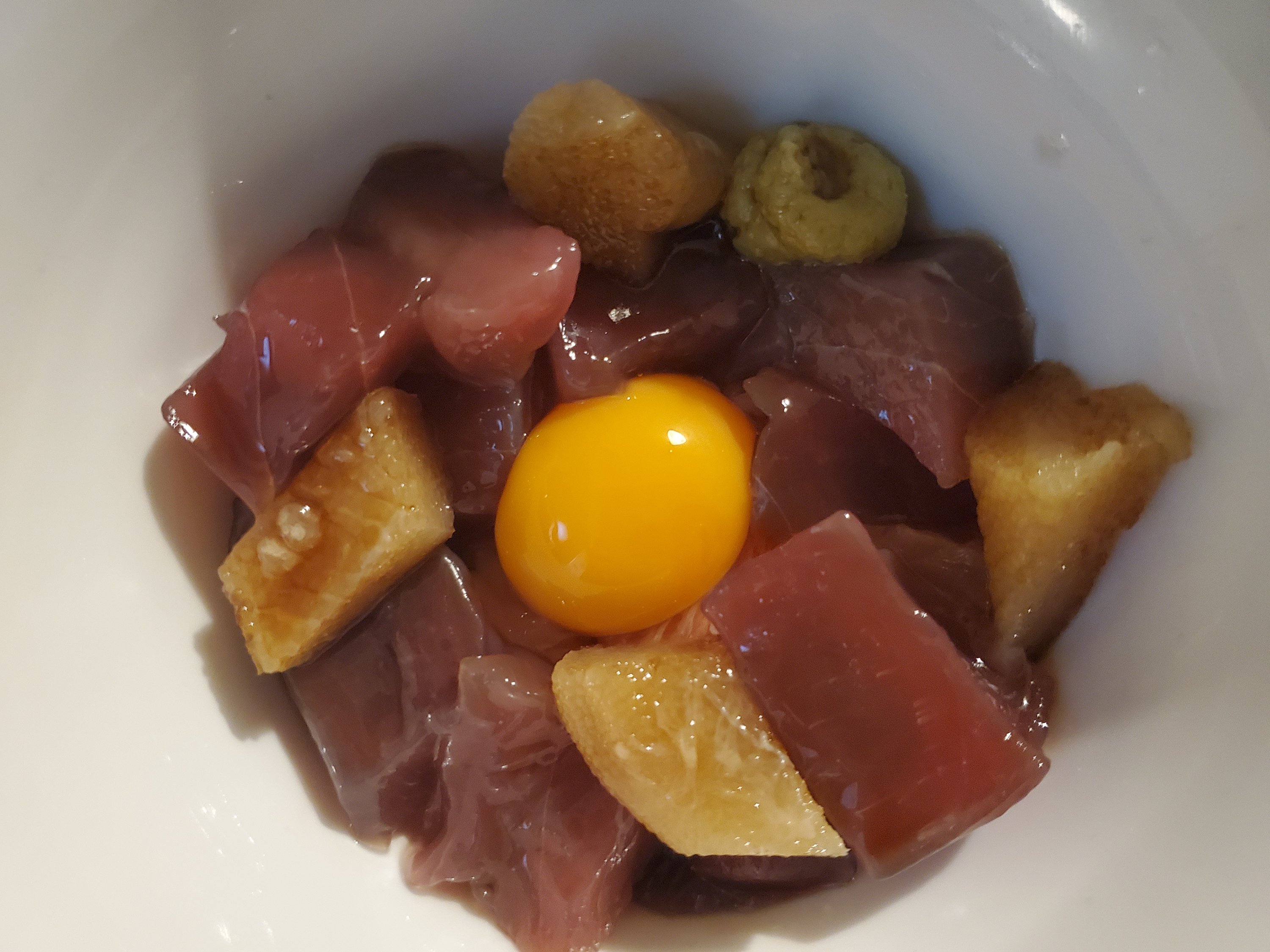 中央に卵黄を載せて、醤油をさっと回しかけてわさびを添えます。