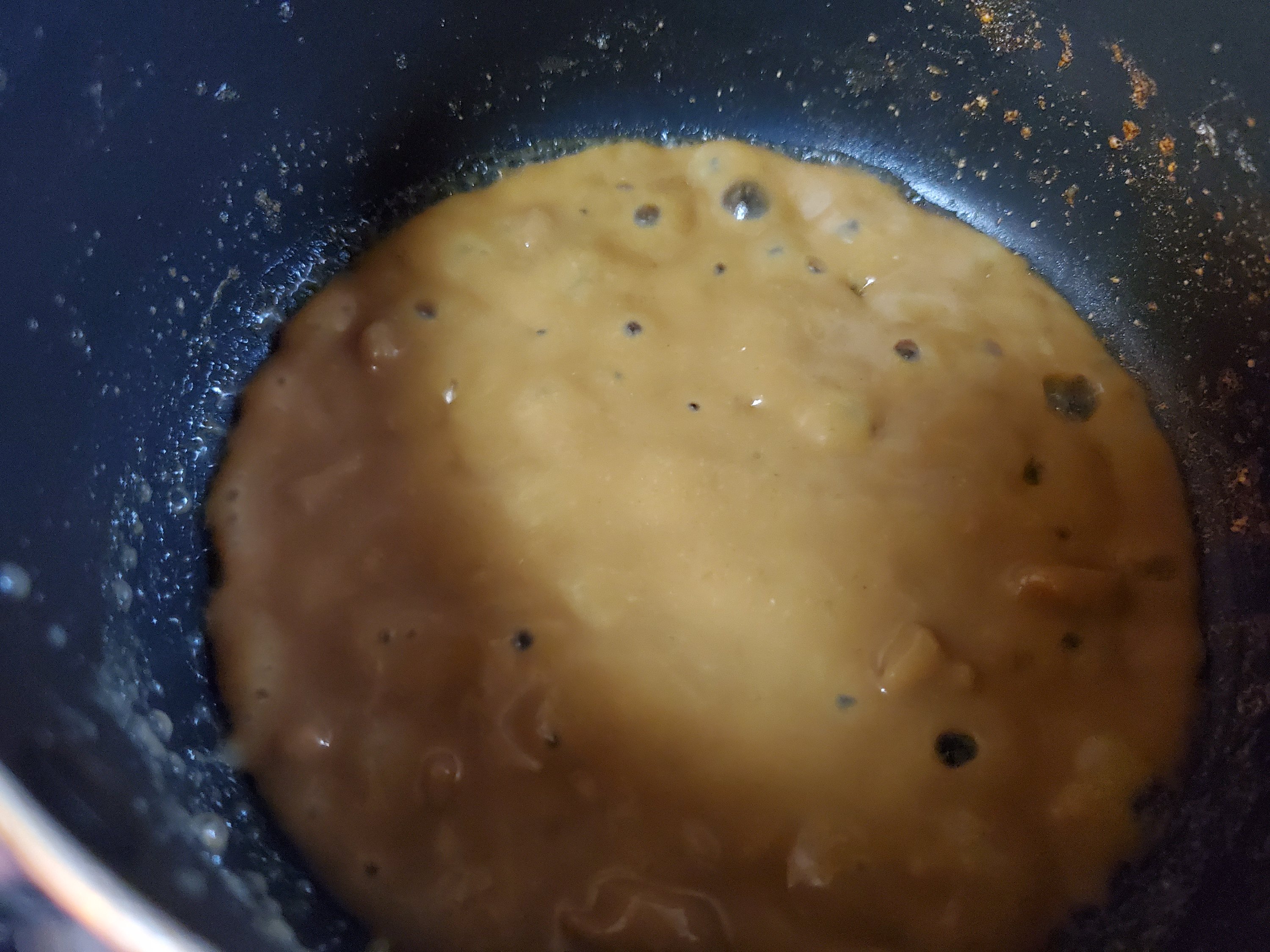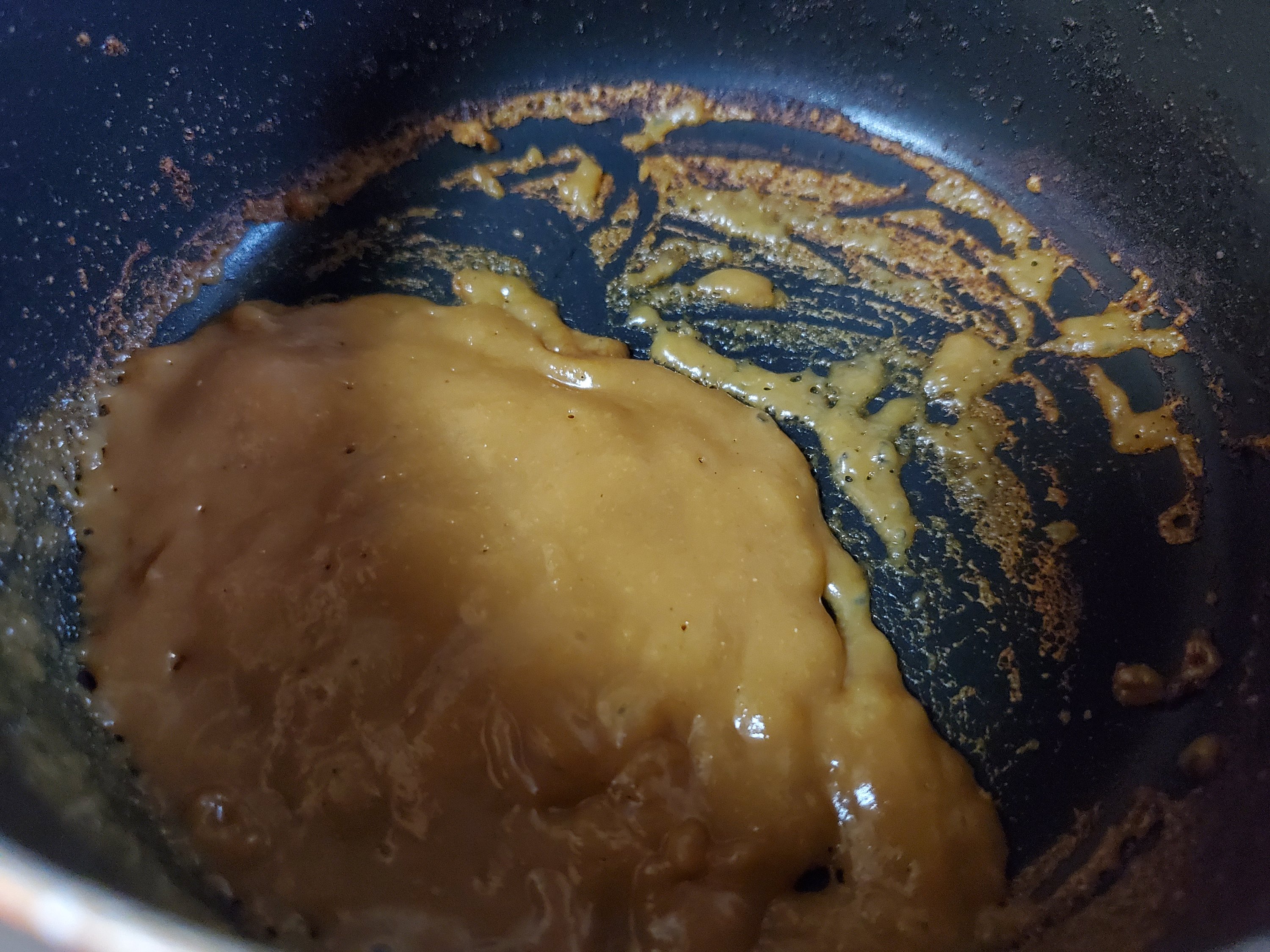 味噌が溶けたら弱火にかけて、木べらで混ぜながら加熱します。