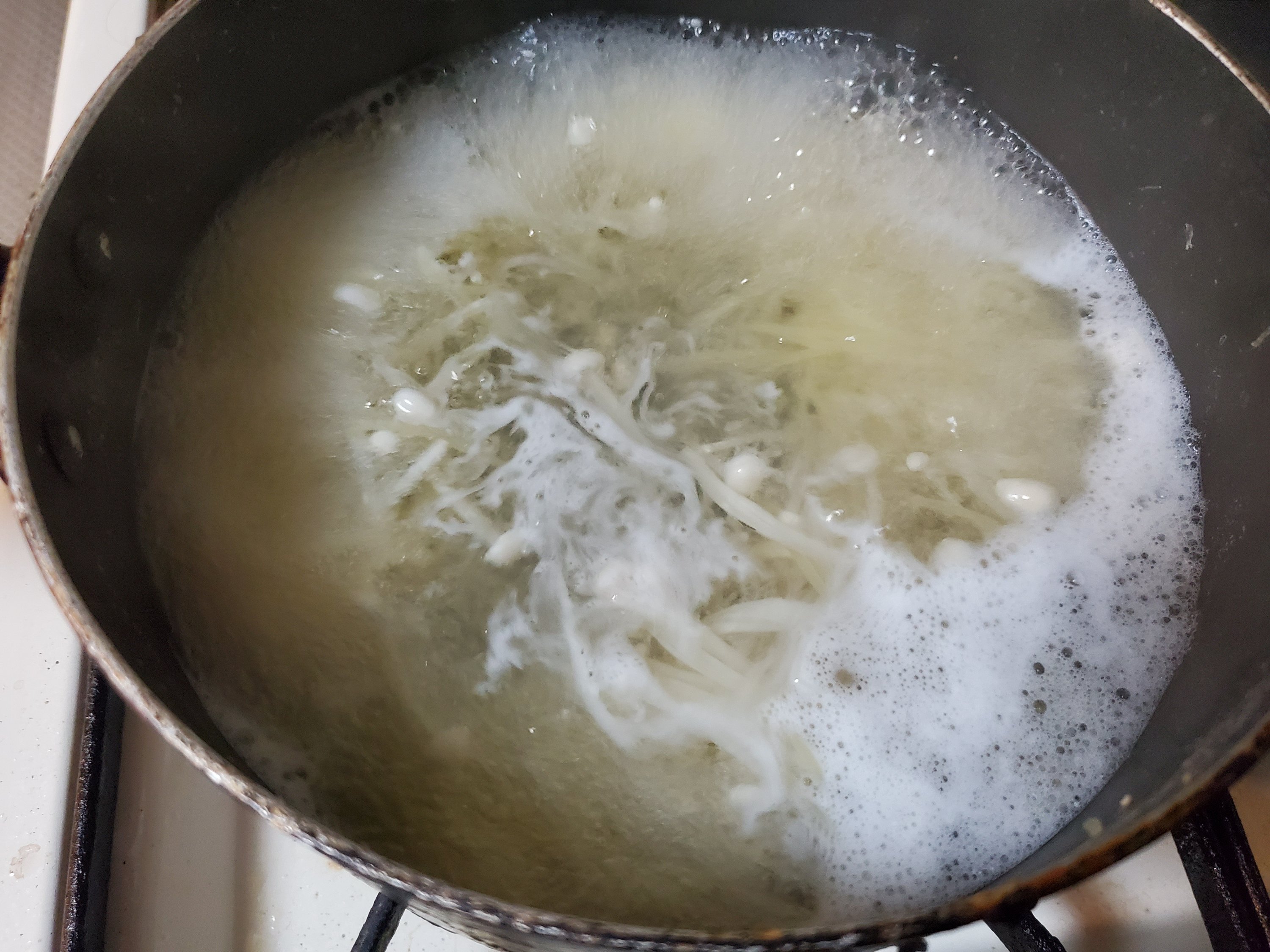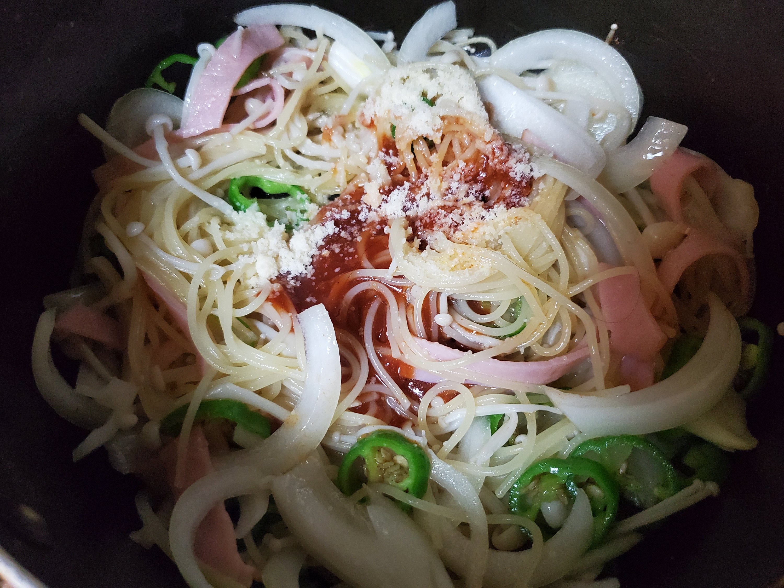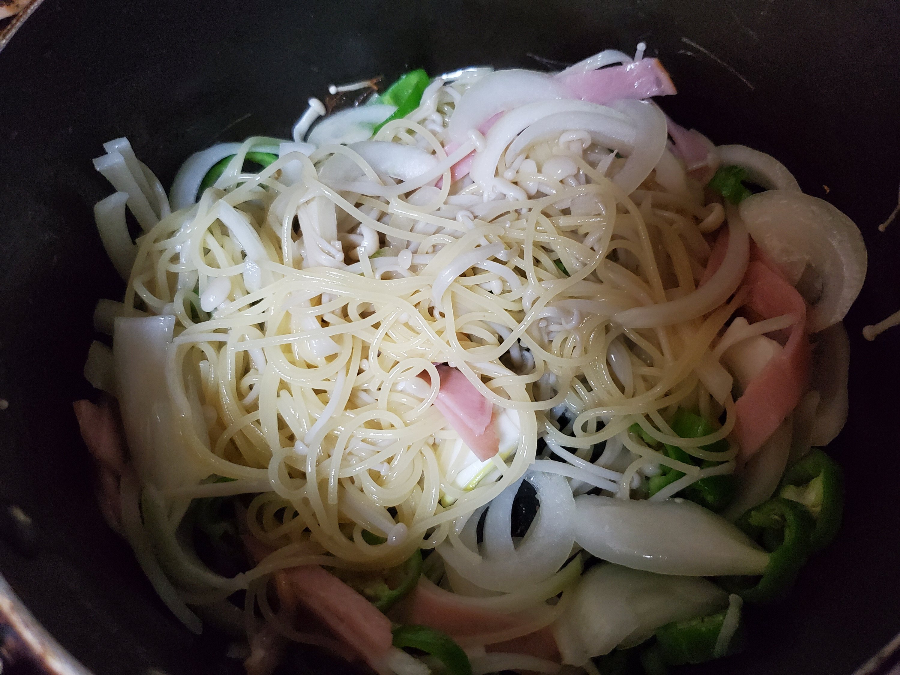 パスタと一緒に茹でるかわりに、麺の量を減らします。