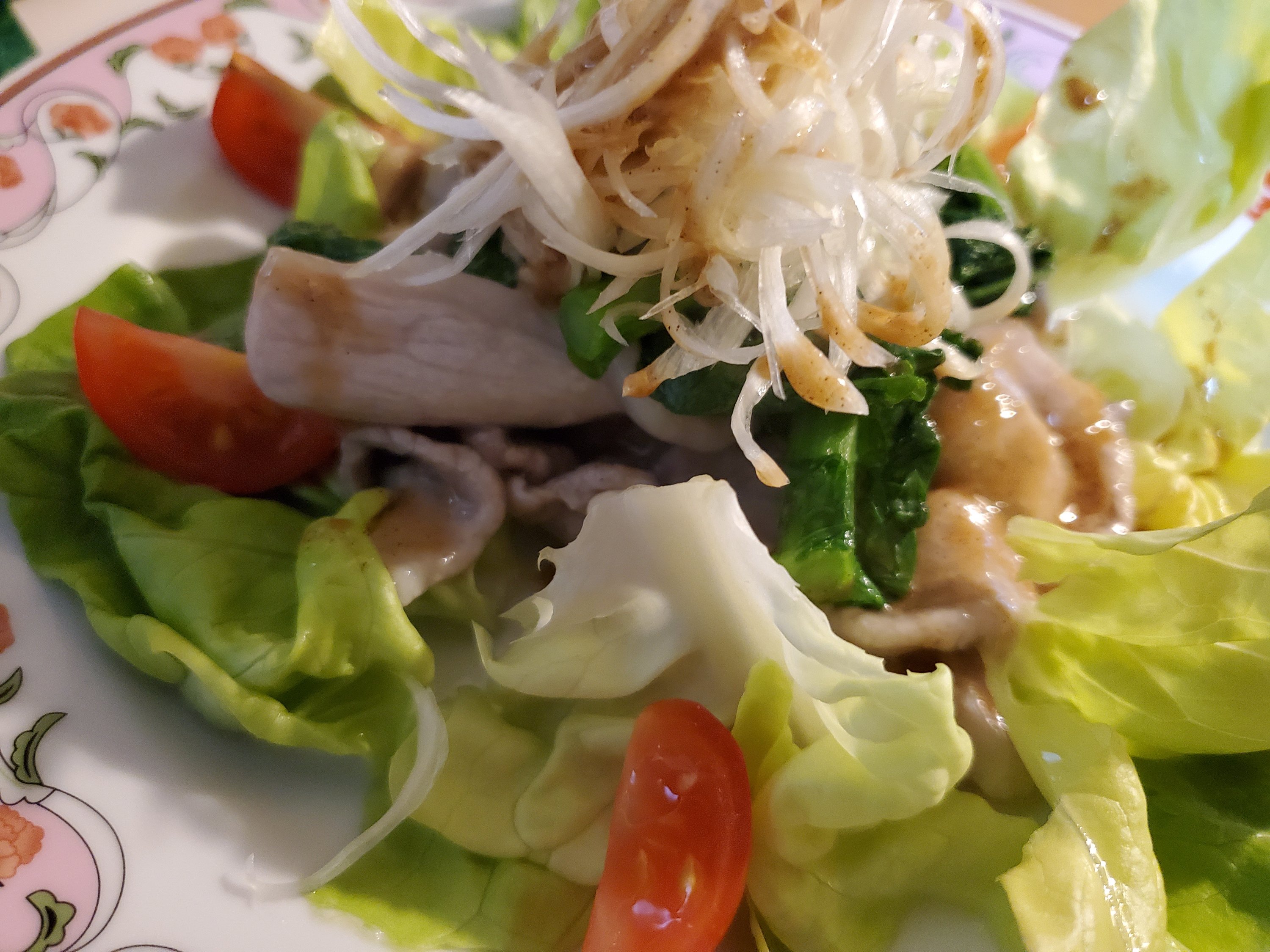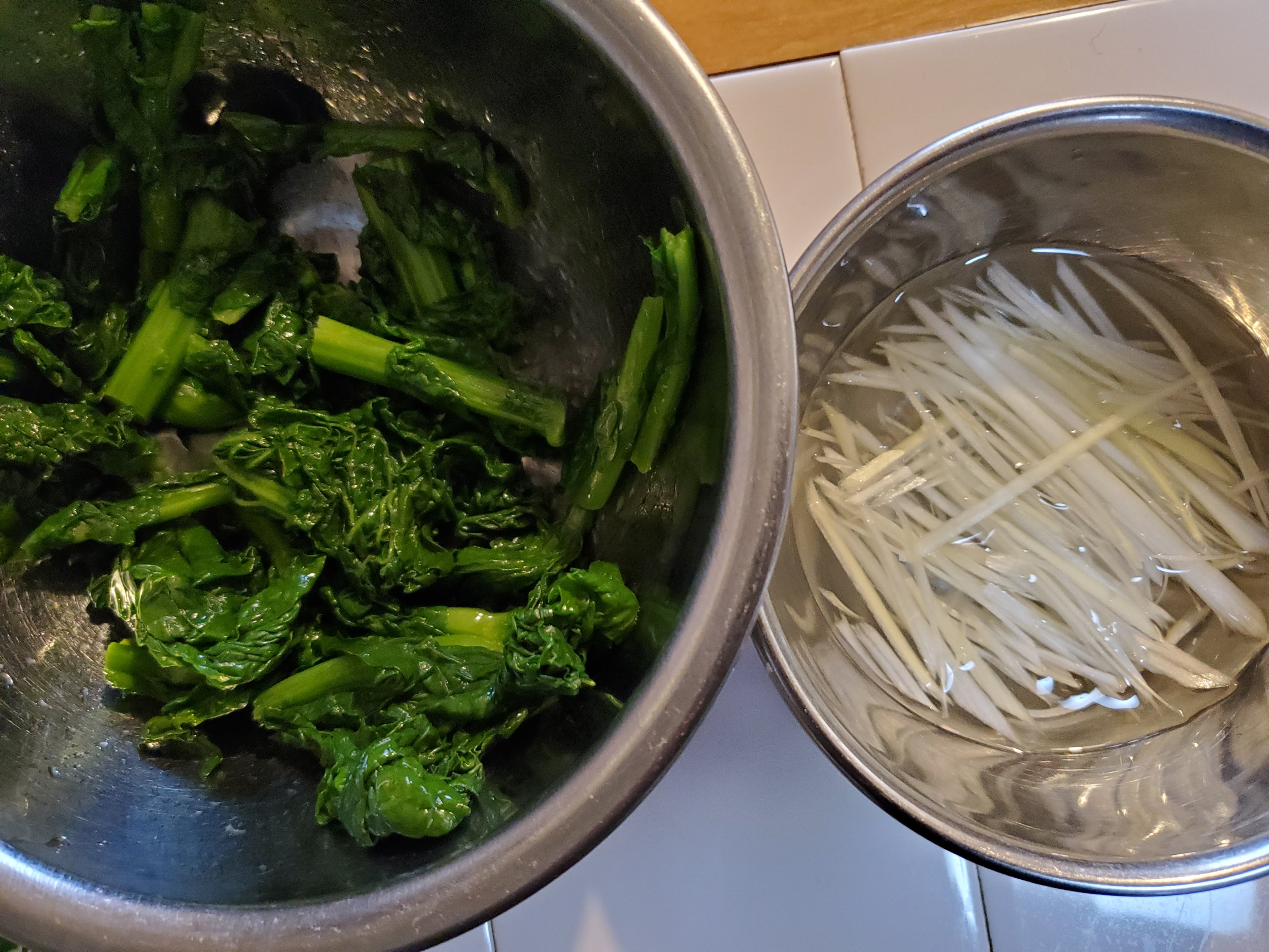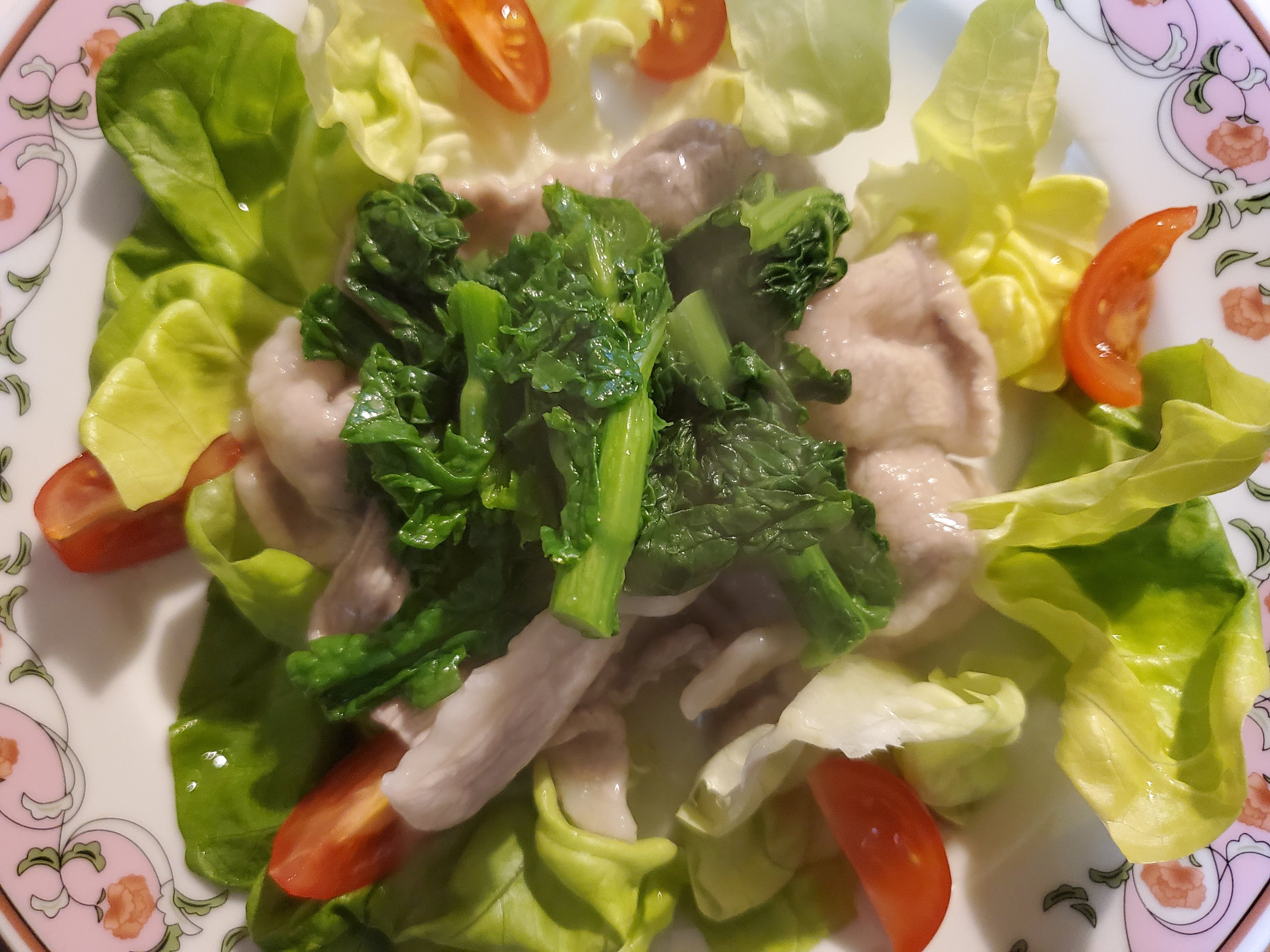 菜の花の食感と、片栗粉をまぶしてゆでたやわらかな豚肉が美味しい組み合わせです😋