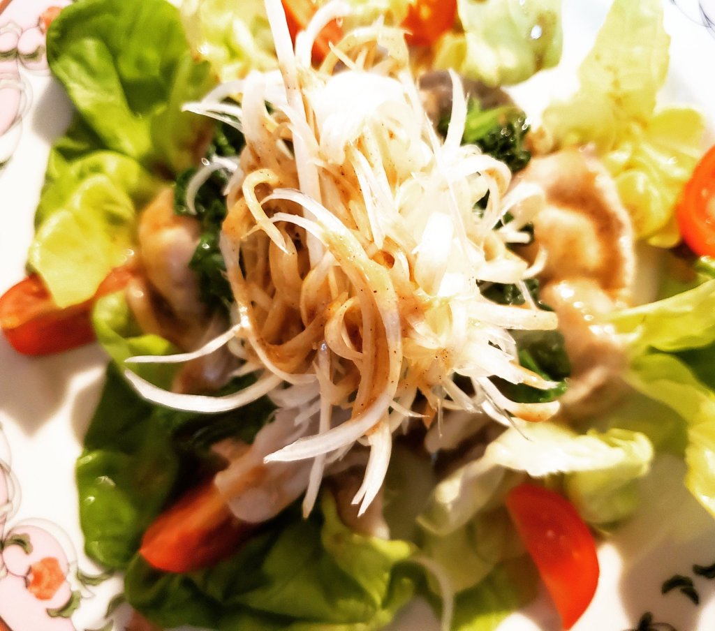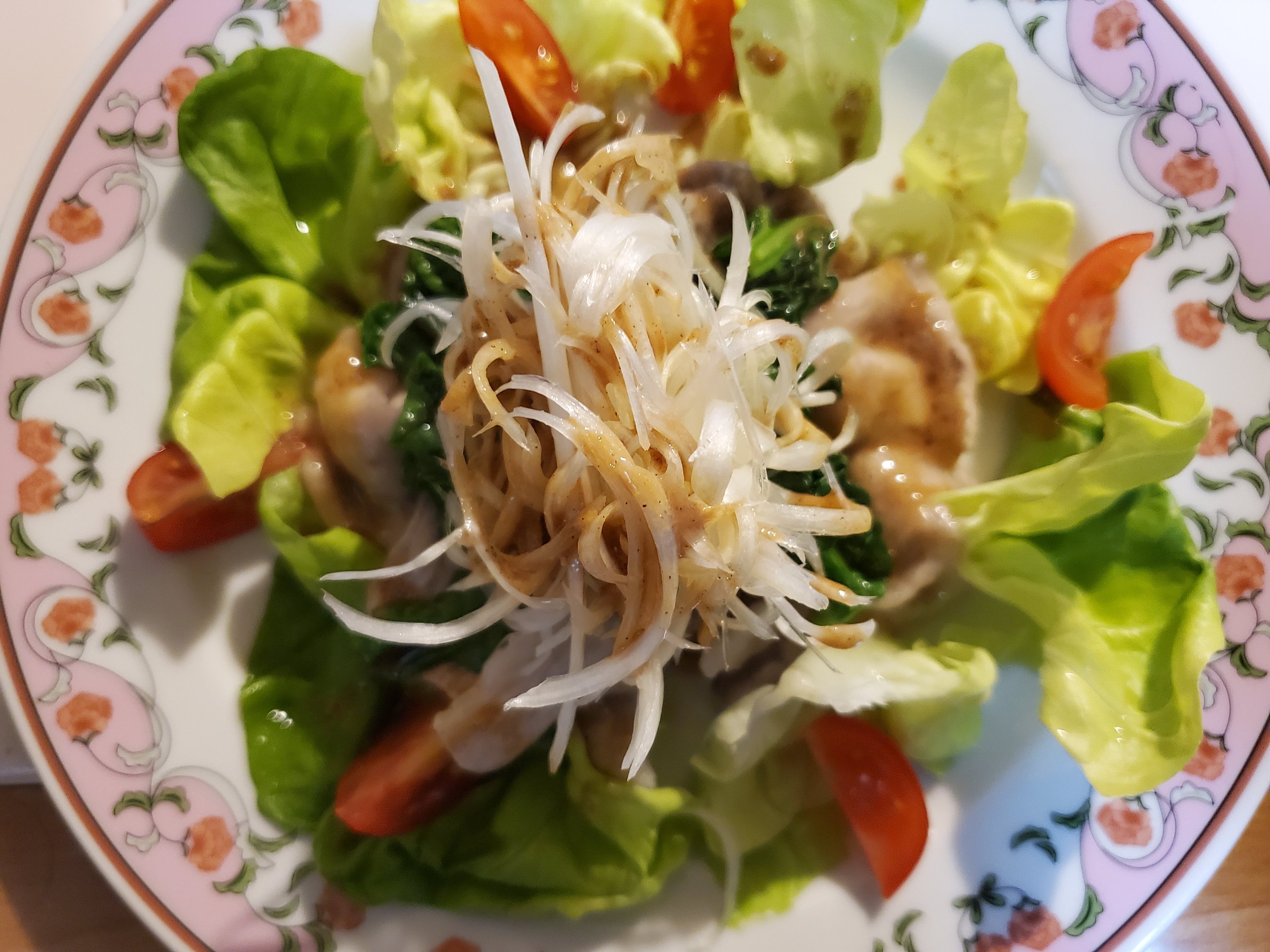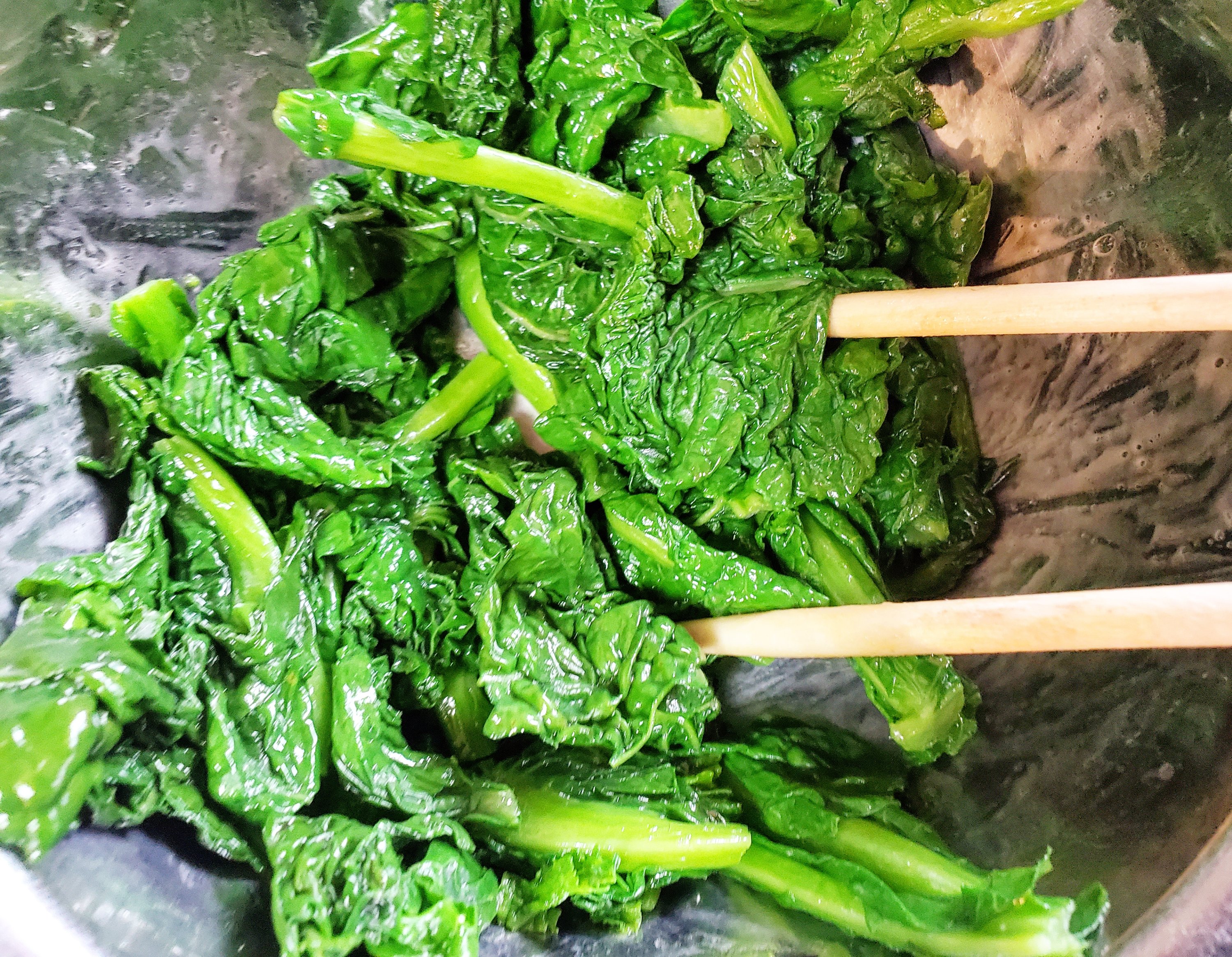 菜の花の食感と、片栗粉をまぶしてゆでたやわらかな豚肉が美味しい組み合わせです😋