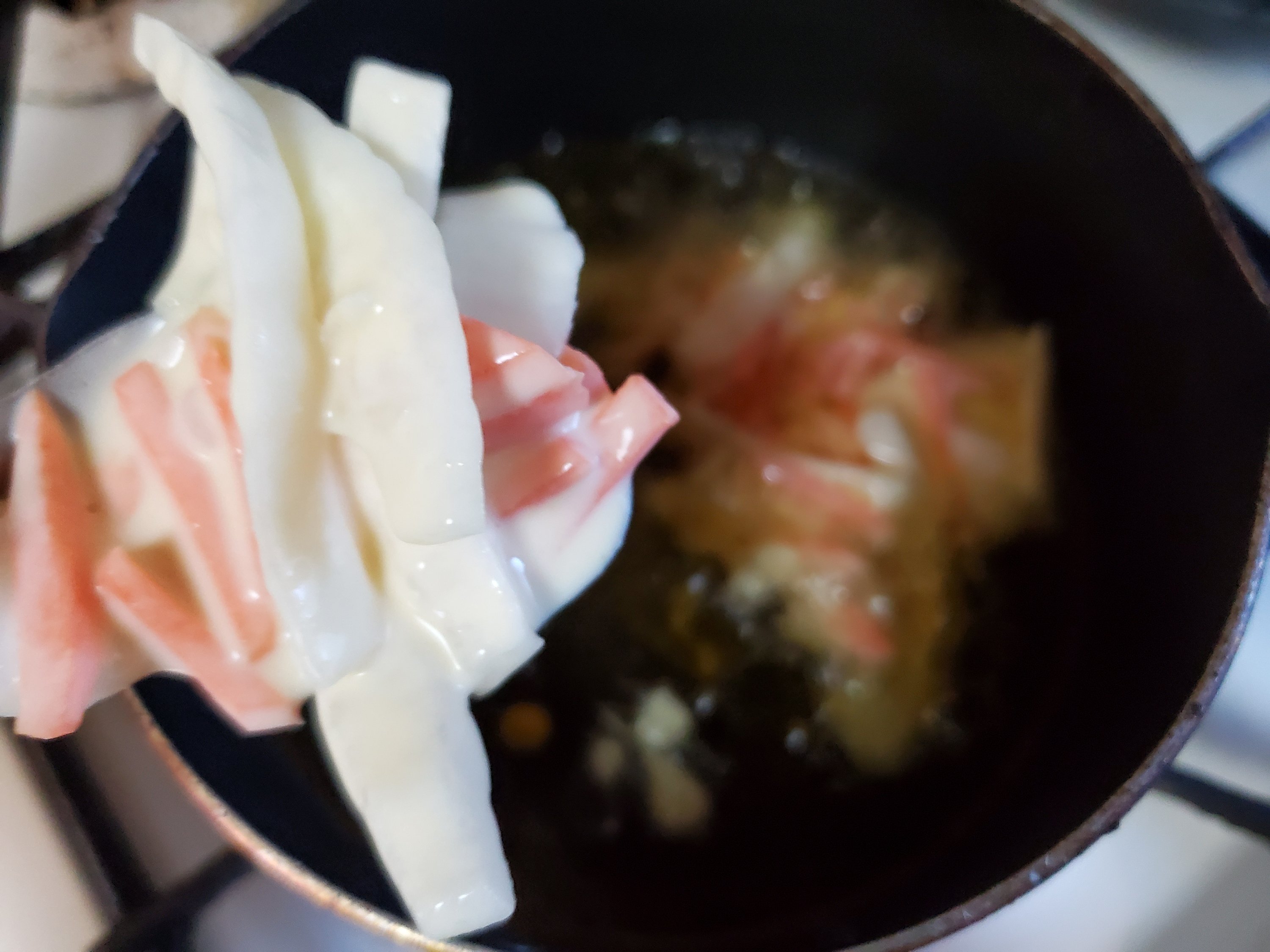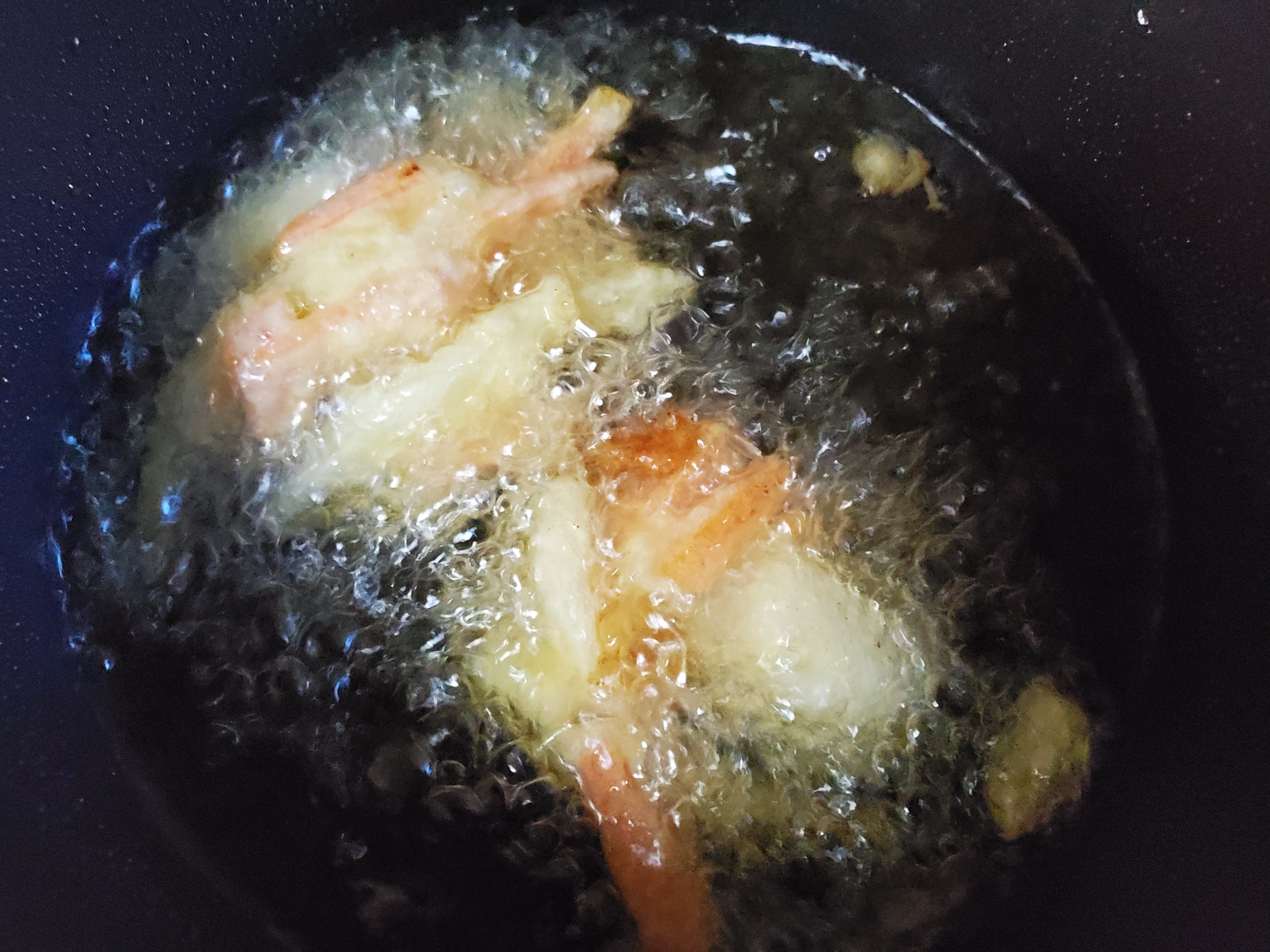 固まる前にさわってしまうと、具材が崩れて油の中に広がってしまうので、ここはじっと我慢です。