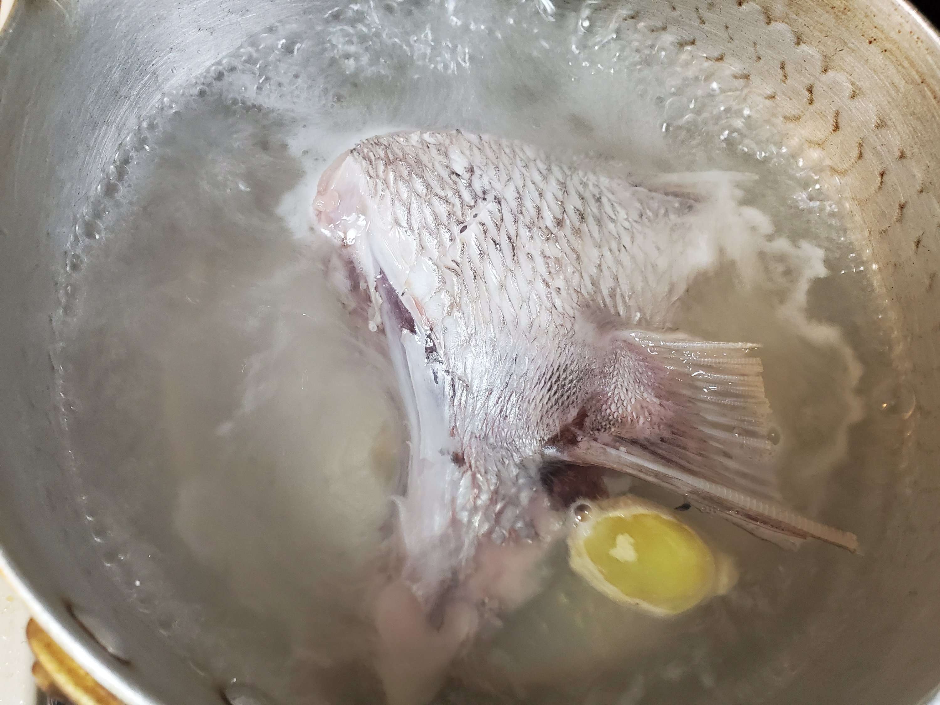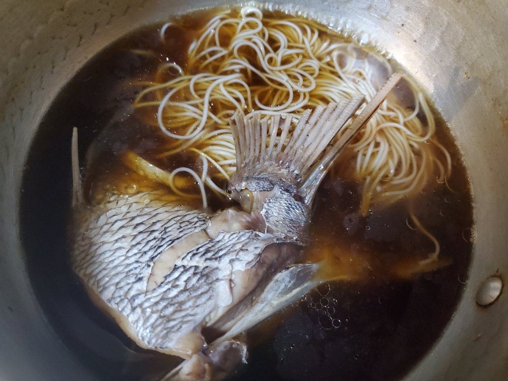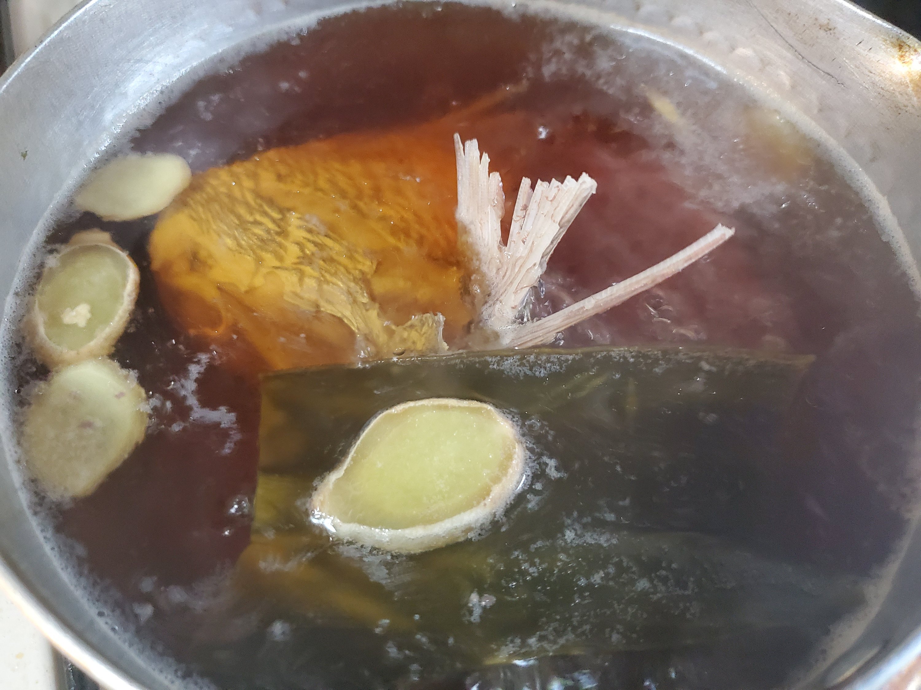 水、しょうがのスライス、昆布、砂糖、醤油、みりん、酒を入れた鍋に湯通しした鯛を入れて火にかけます。