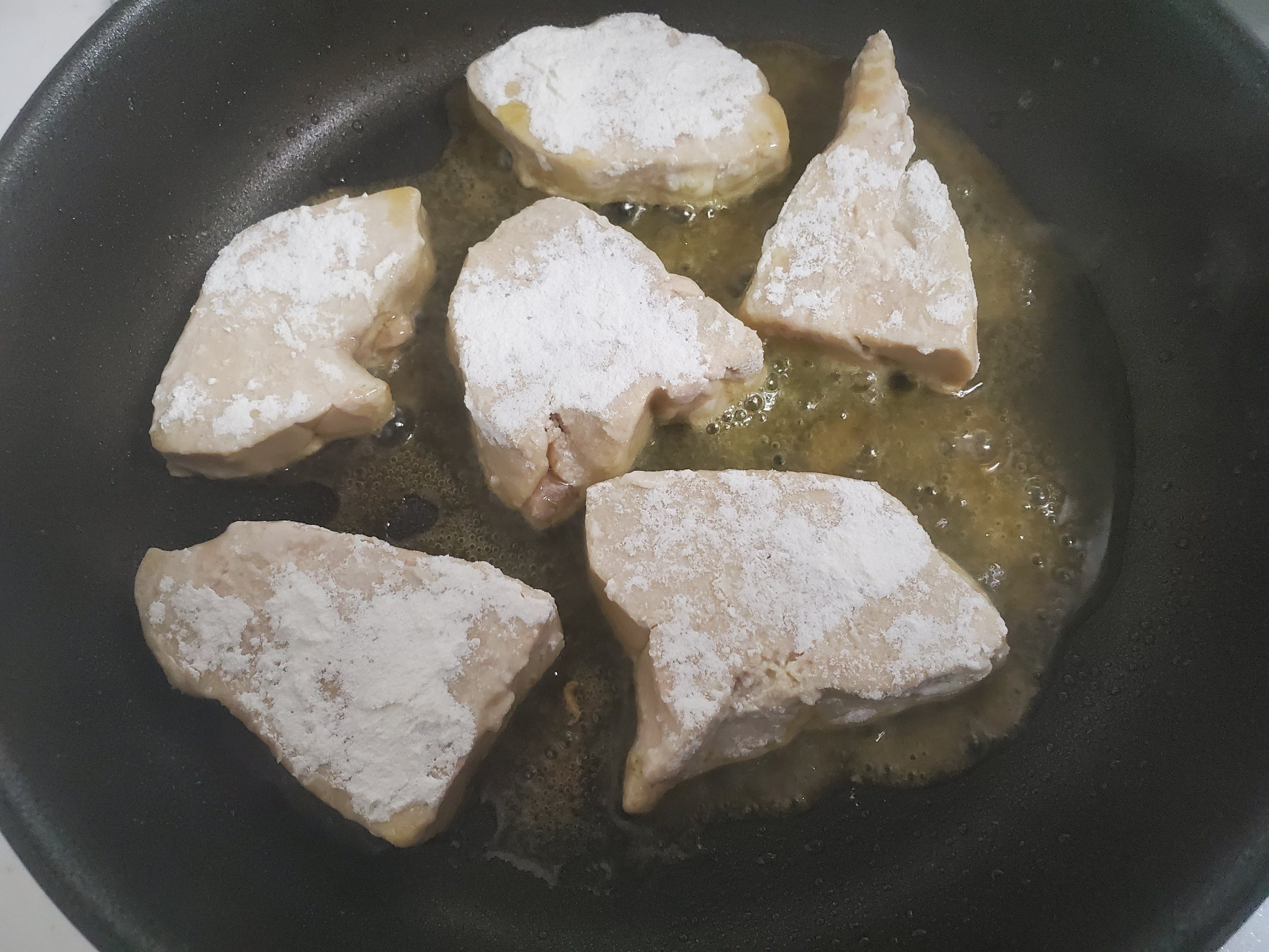 よく水気を切ったら小麦粉をはたいて、煙が出るまで熱したフライパンを弱火にして投入!