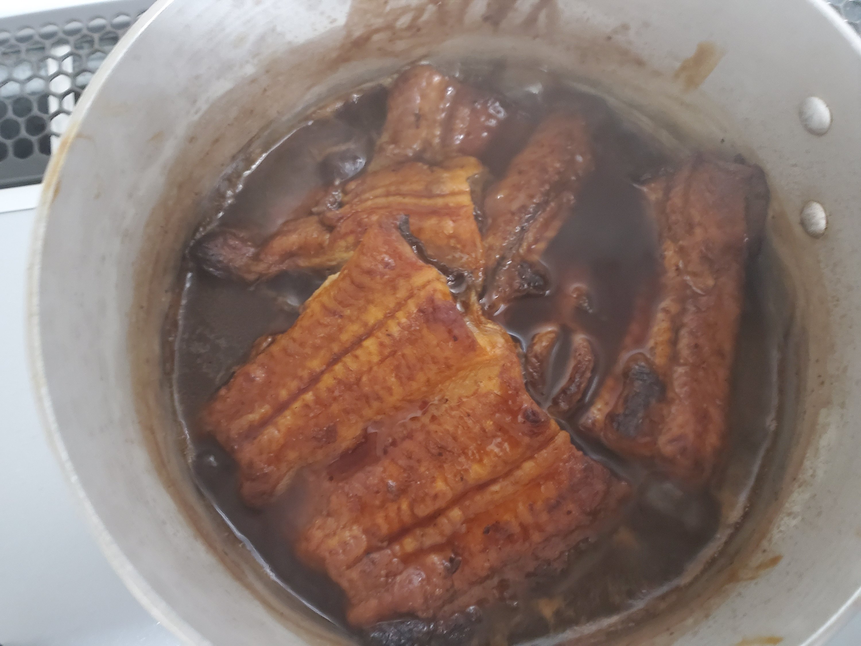 うなぎを筒切りにして赤ワインベースで煮込む料理なのですが、今回は蒲焼を使います。