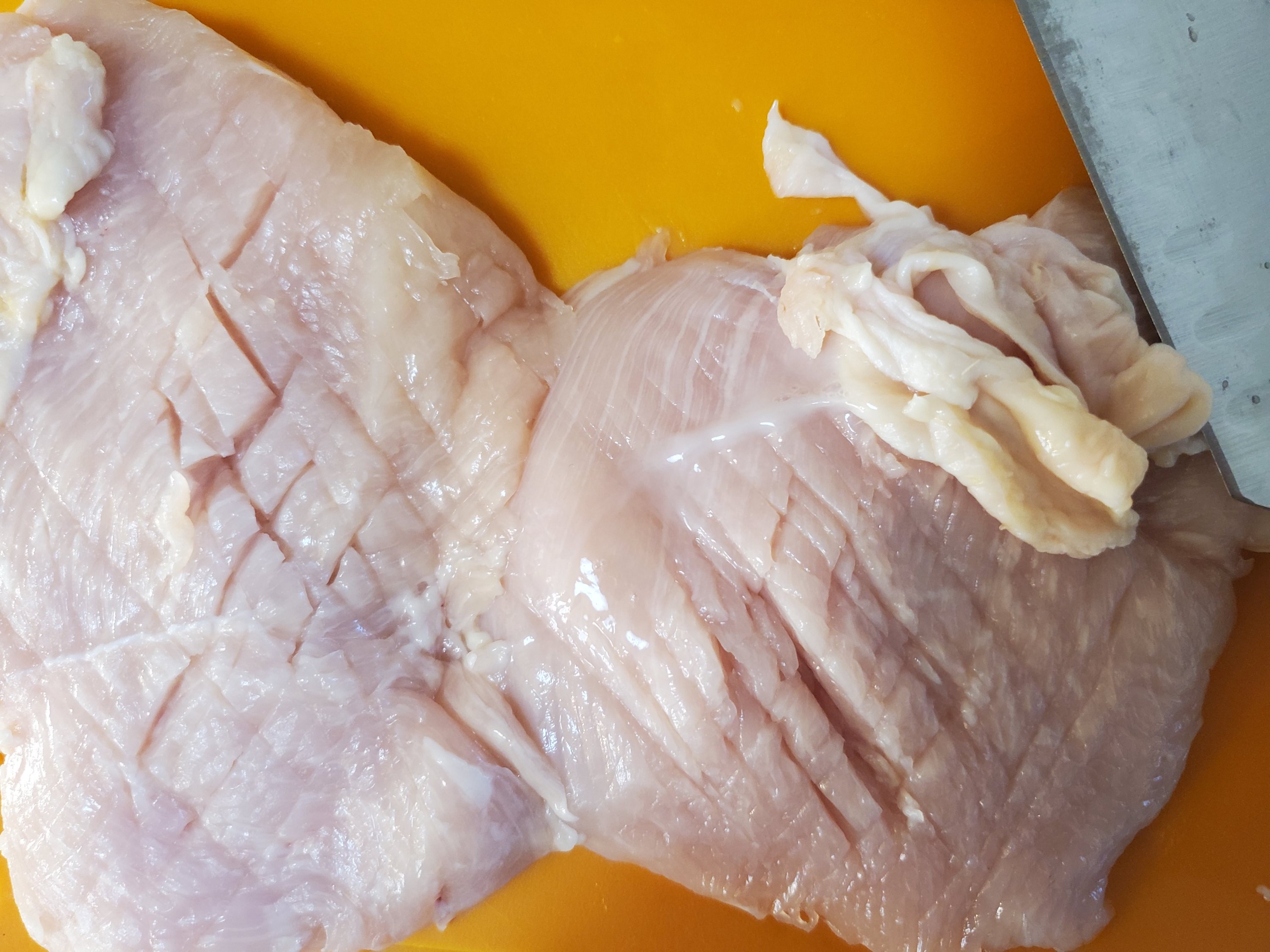 胸肉をそぎ切りにして、食べやすいサイズにします。