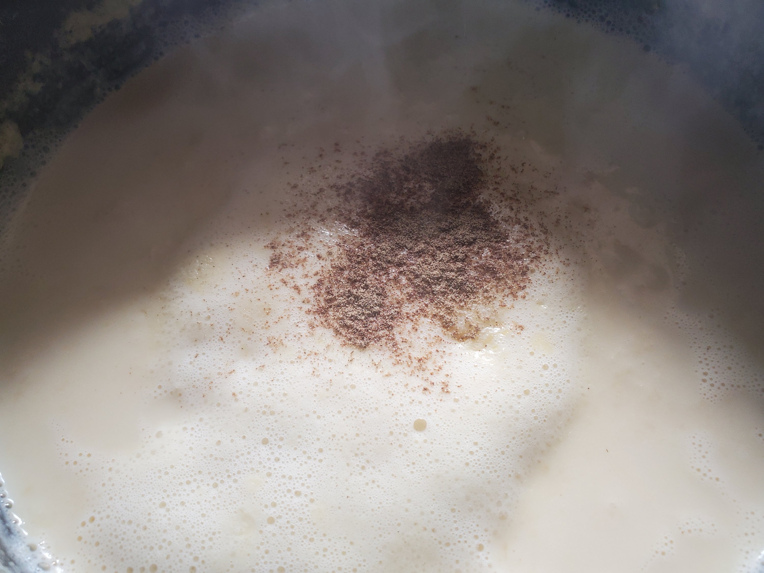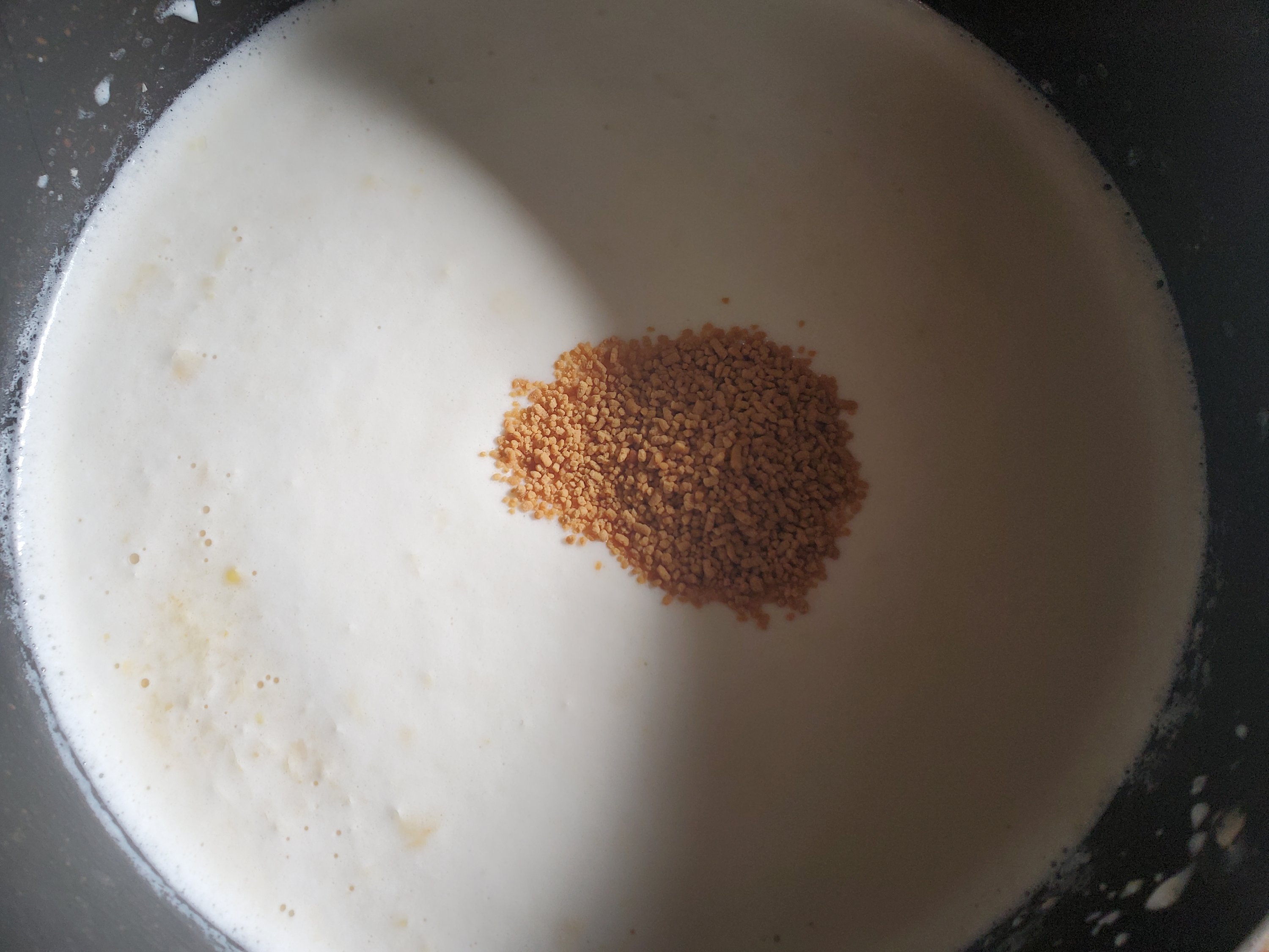 ミキサーにかけたものは鍋に移し、コンソメを入れます。