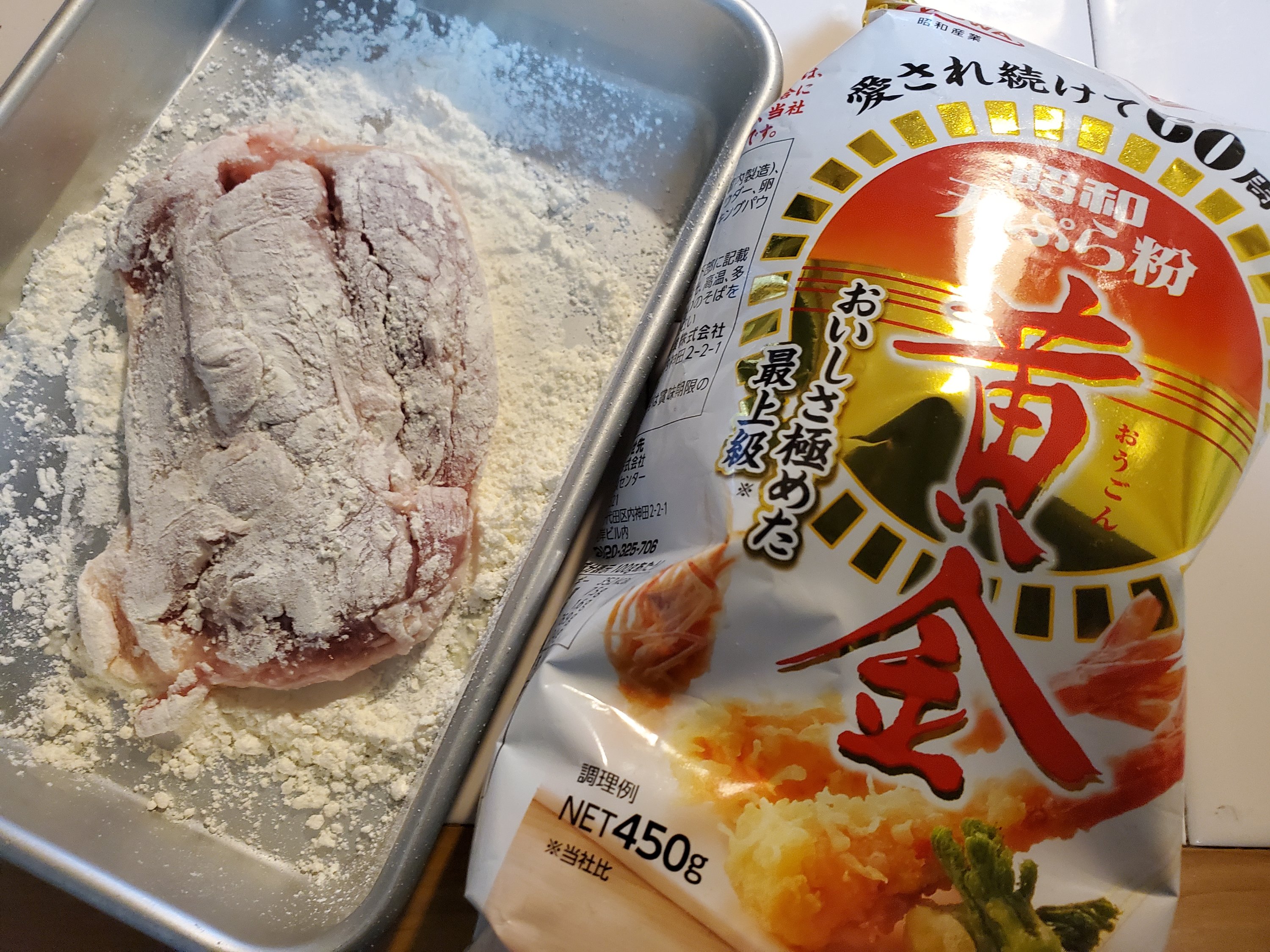 今回はモニタープレゼントの「昭和天ぷら粉 黄金」でこんがりカリカリ食感のチキンソテーを作ります。