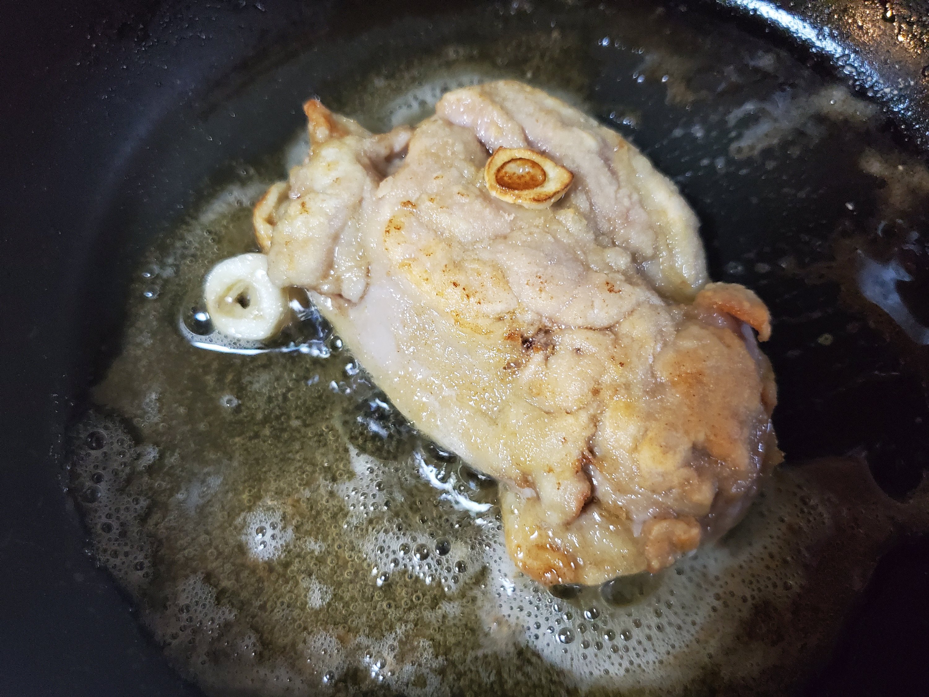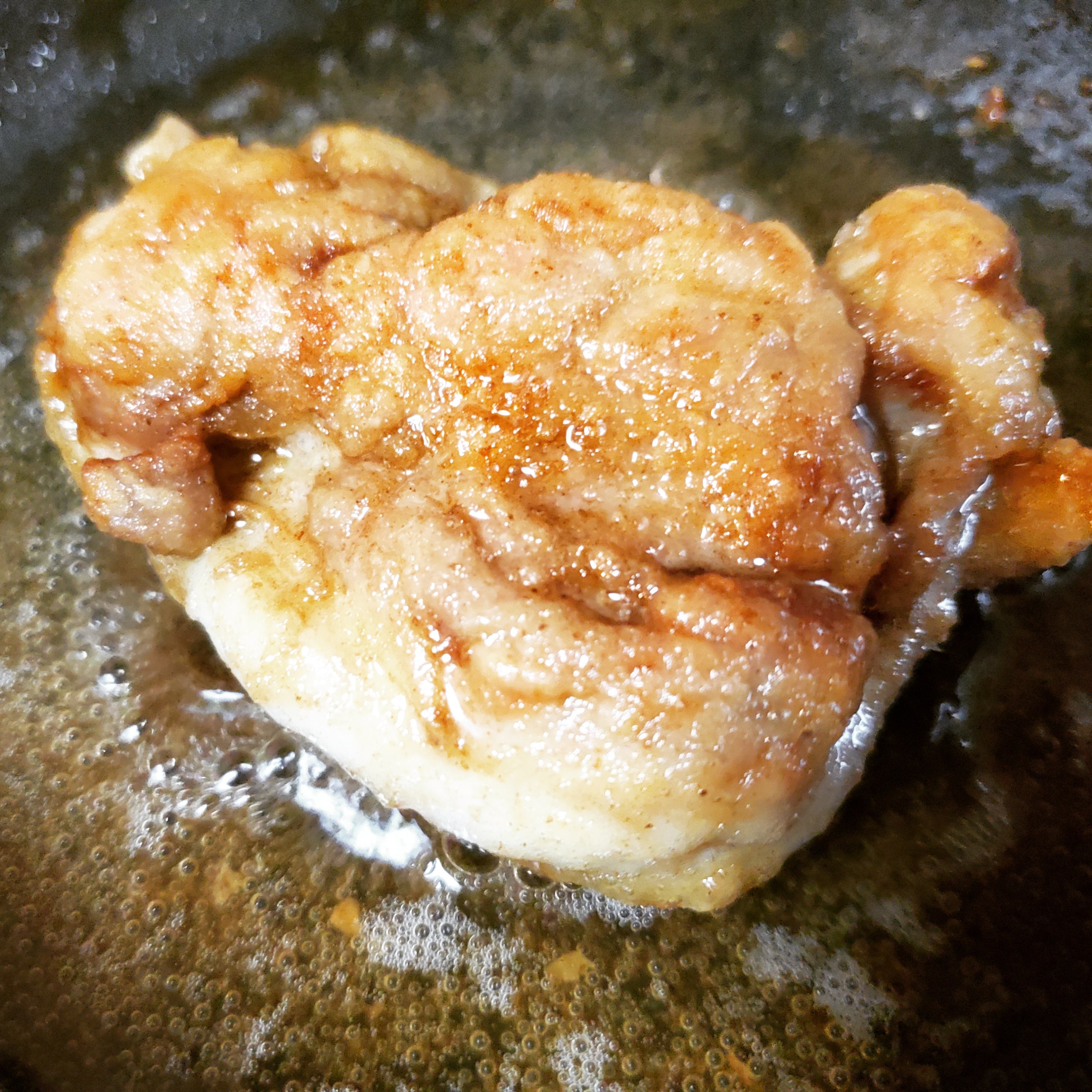 バターが溶けたら弱火のまま皮を上にして鶏肉を入れます。