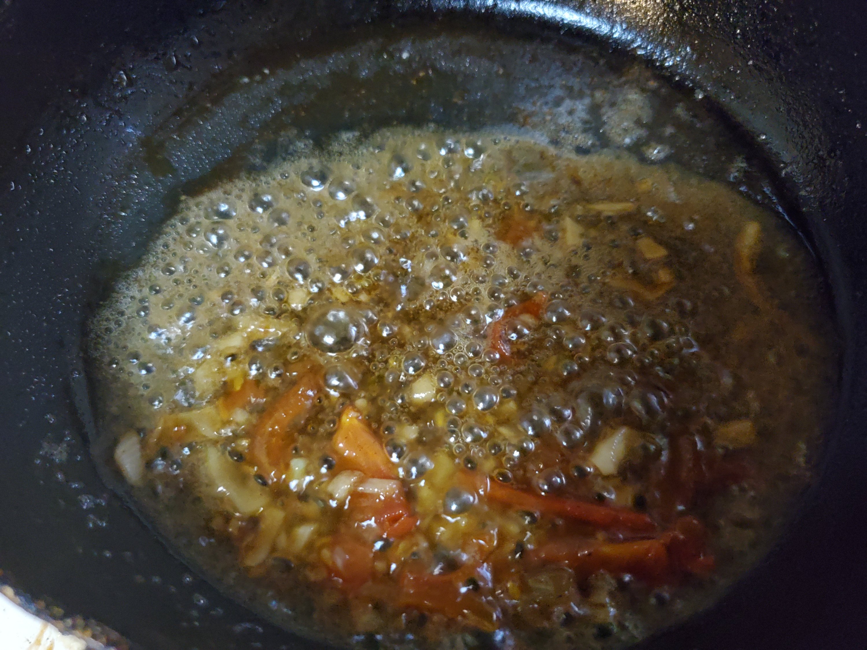 ソースのベースはみじん切りにした玉ねぎと、麺つゆ、ポン酢、酢、砂糖を鍋に入れて火にかけます。