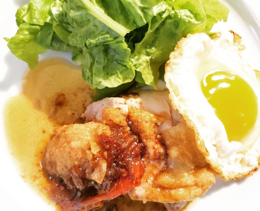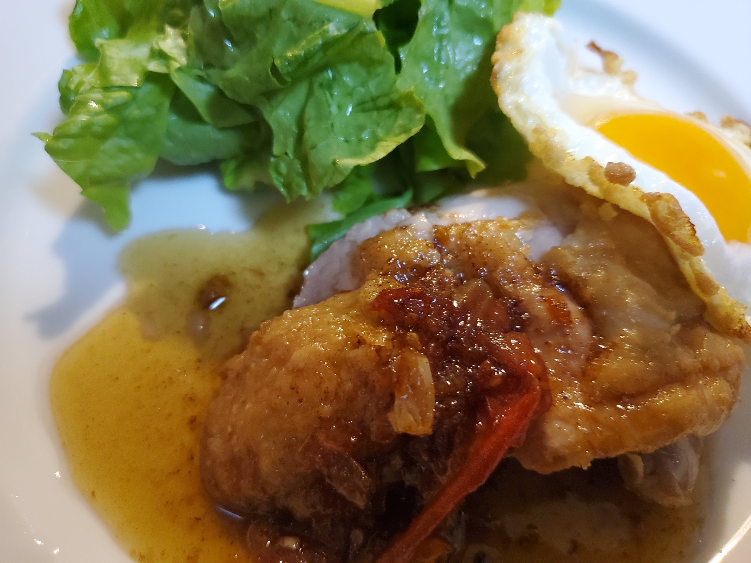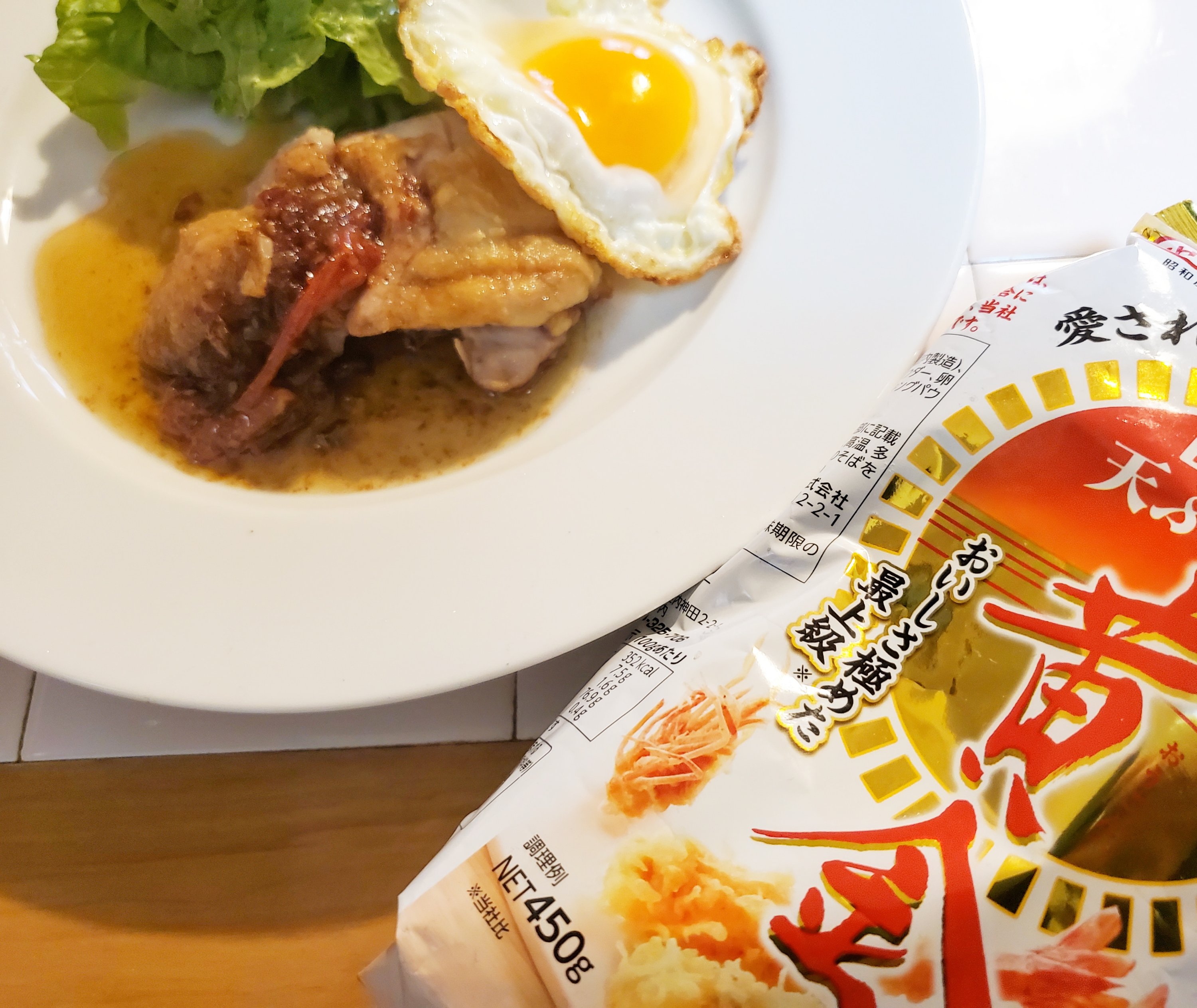 「昭和天ぷら粉 黄金」をまぶすことで、表面がカリカリに焼けた鶏肉が美味しい一皿です😋