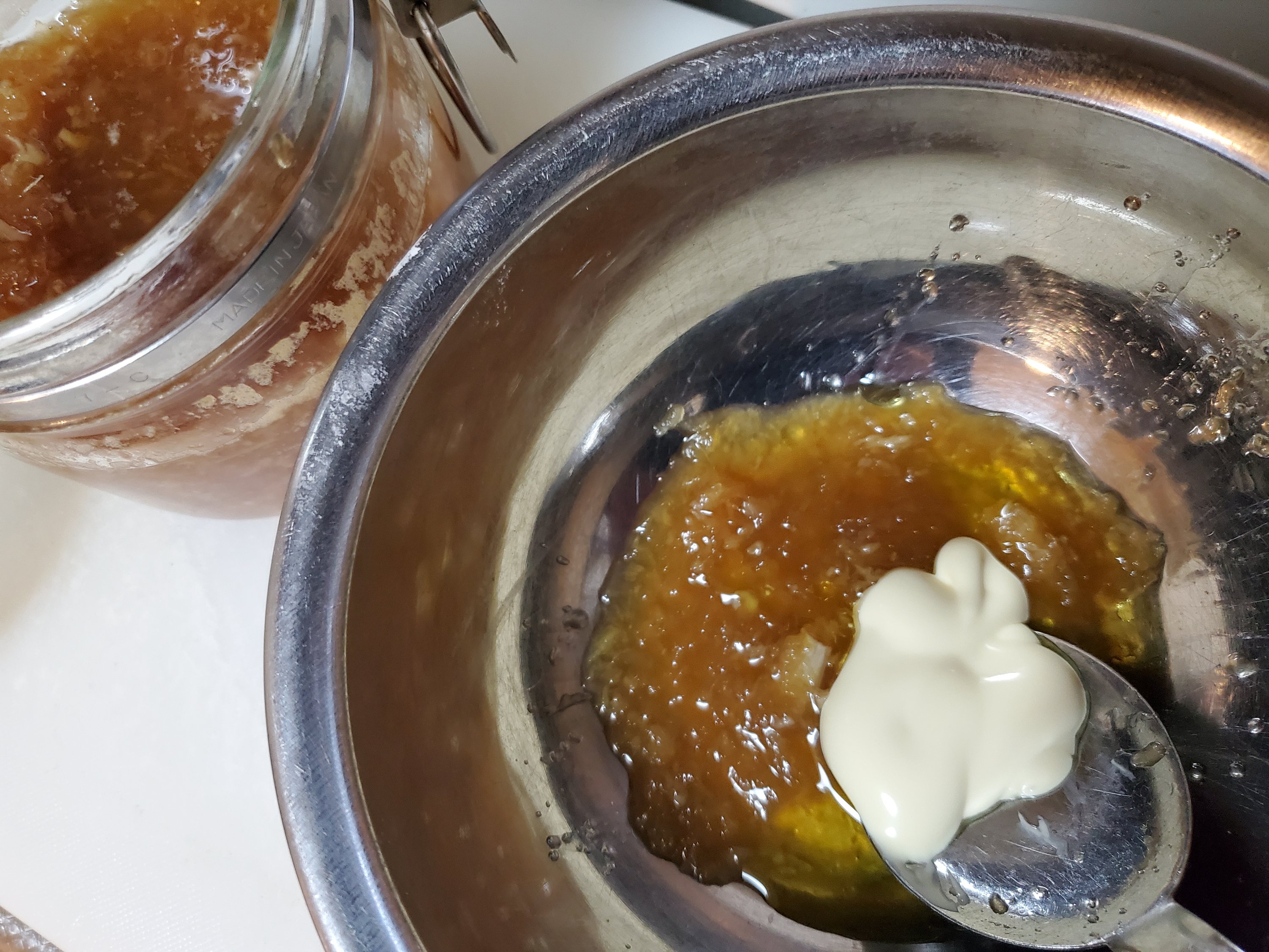 ドレッシングの 素 を作っておいて、食べるときにそれを伸ばしてドレッシングとして使うスタイルなので、まずはベースになる部分を作っていきます。