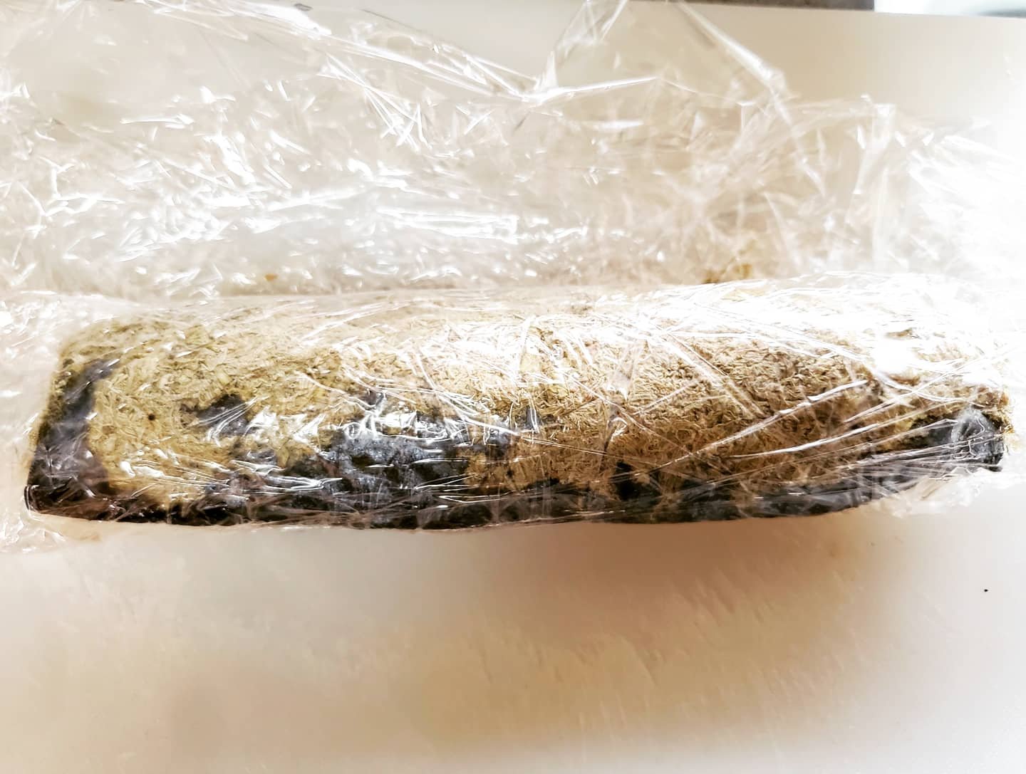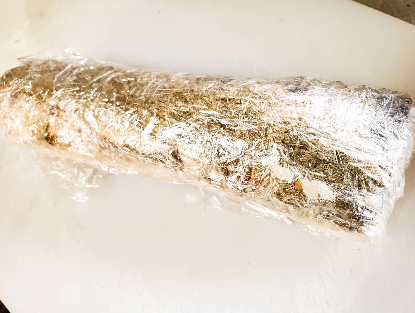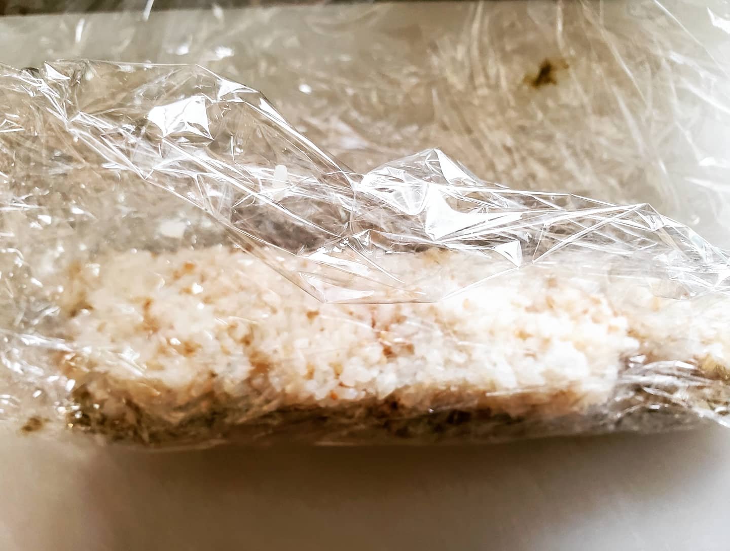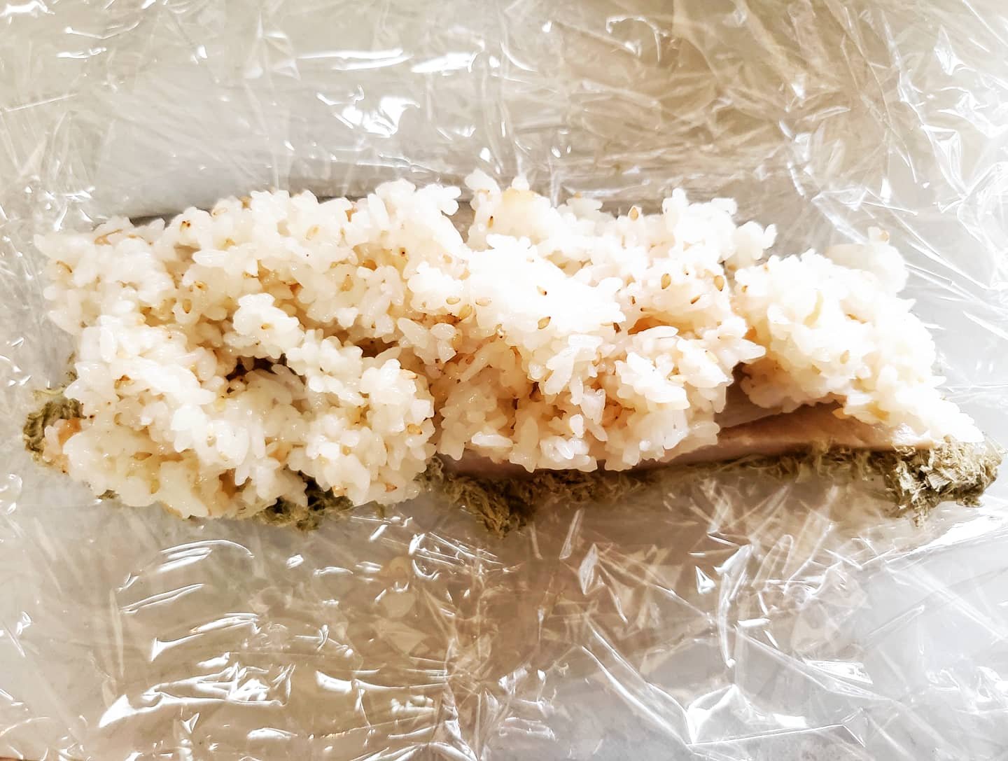 ラップフィルムは二重か三重にして、大きめに広げて、しっかりと棒寿司を包めるようにするのがポイントです。