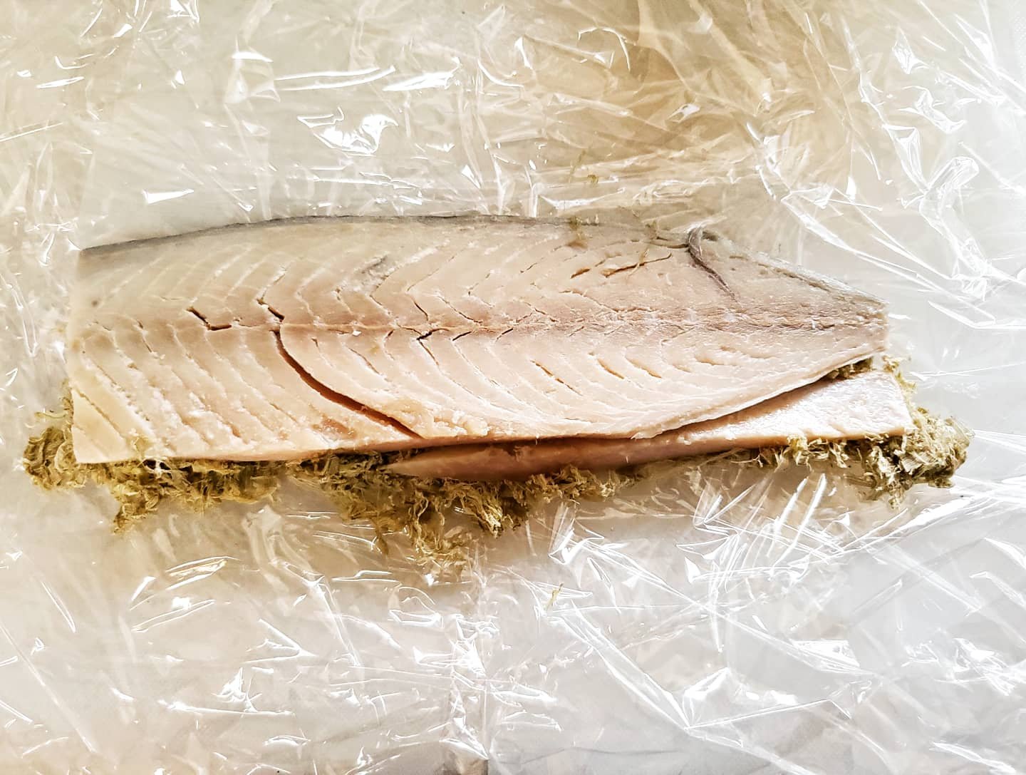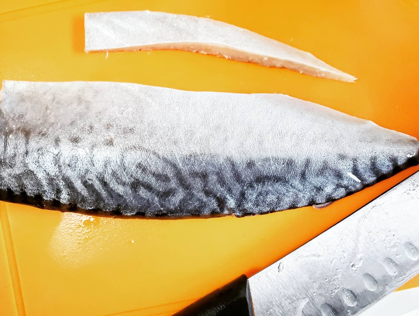 最初に切り取った身は細くなったしっぽのほうに並べて、全体の幅を均一にします。