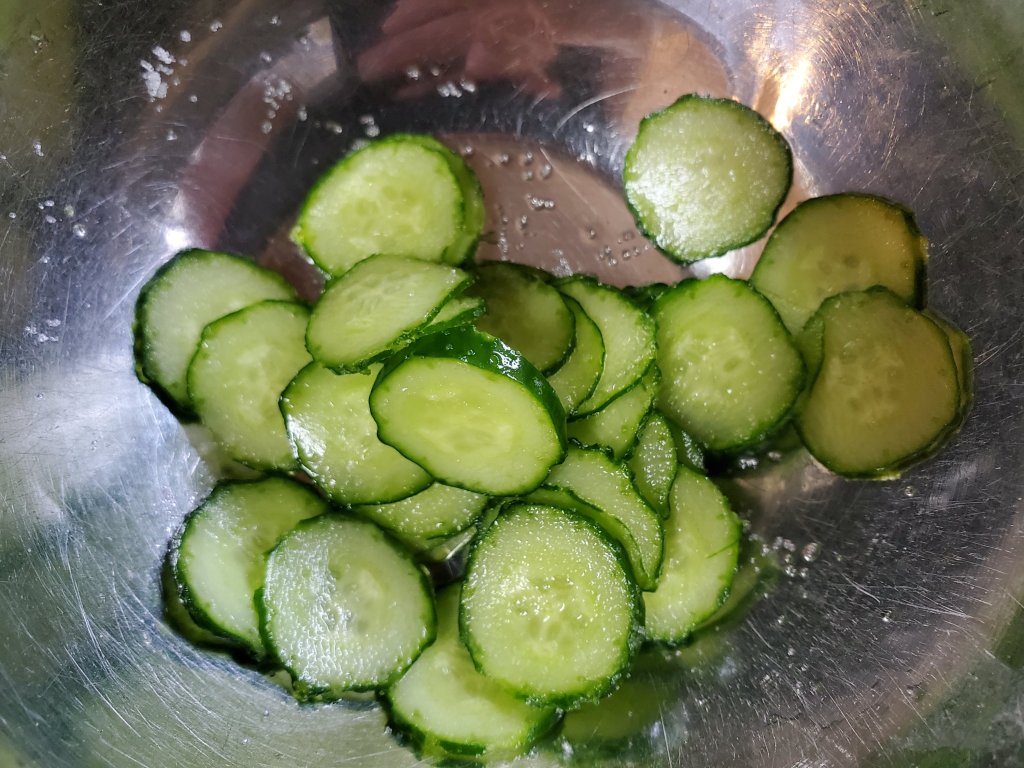 ごく薄く切って塩でもんだらよく洗って絞っておきます。