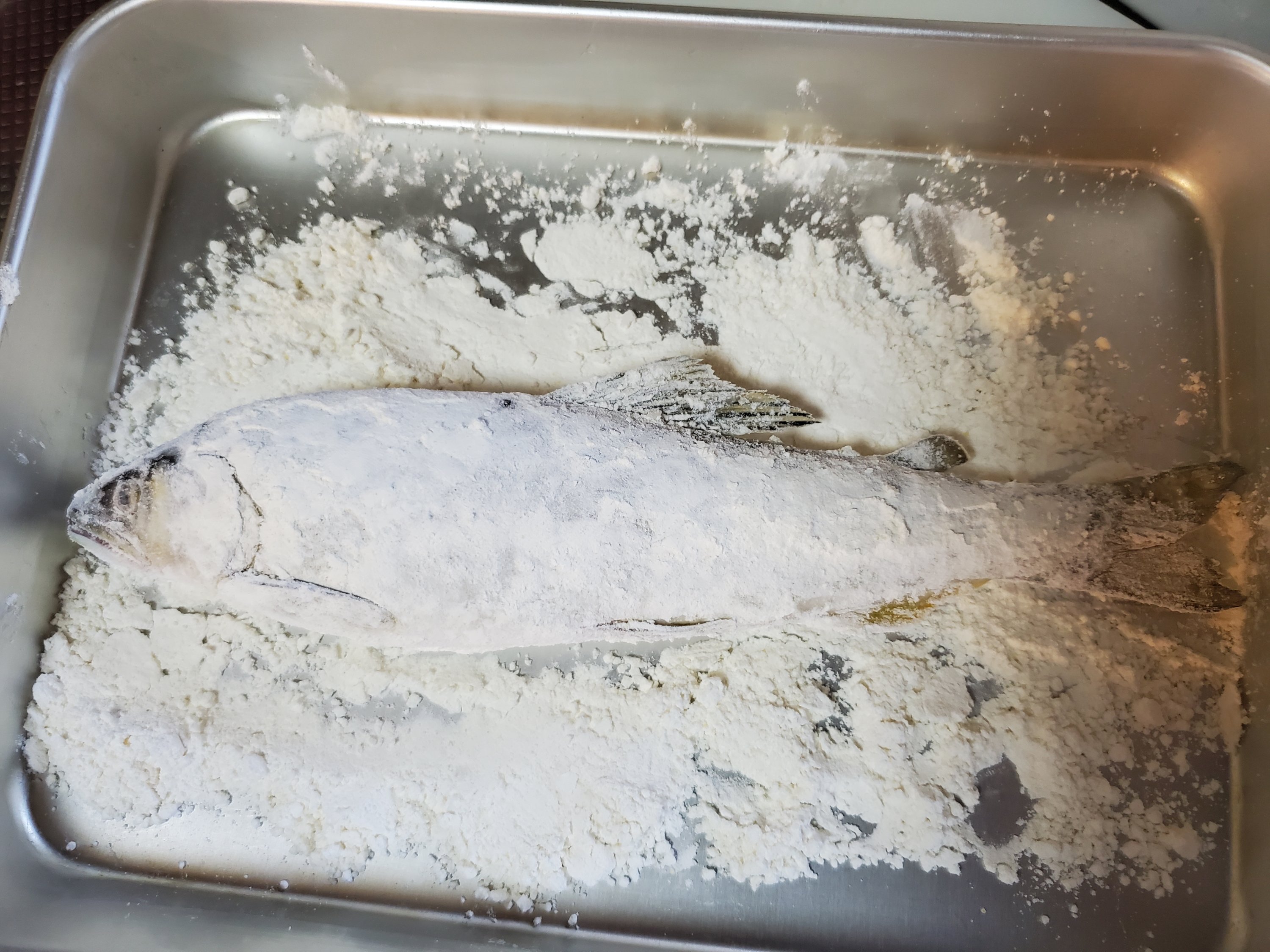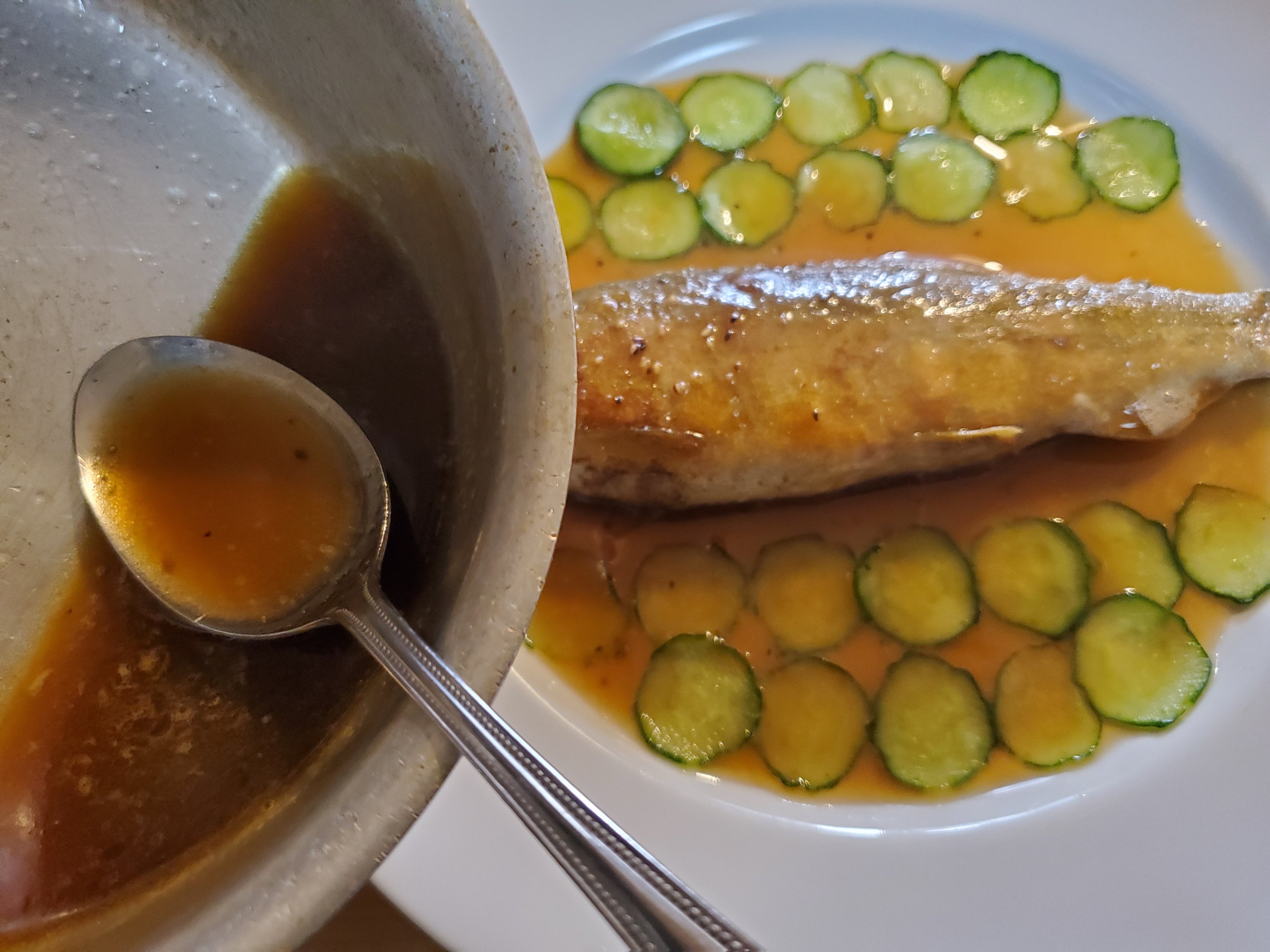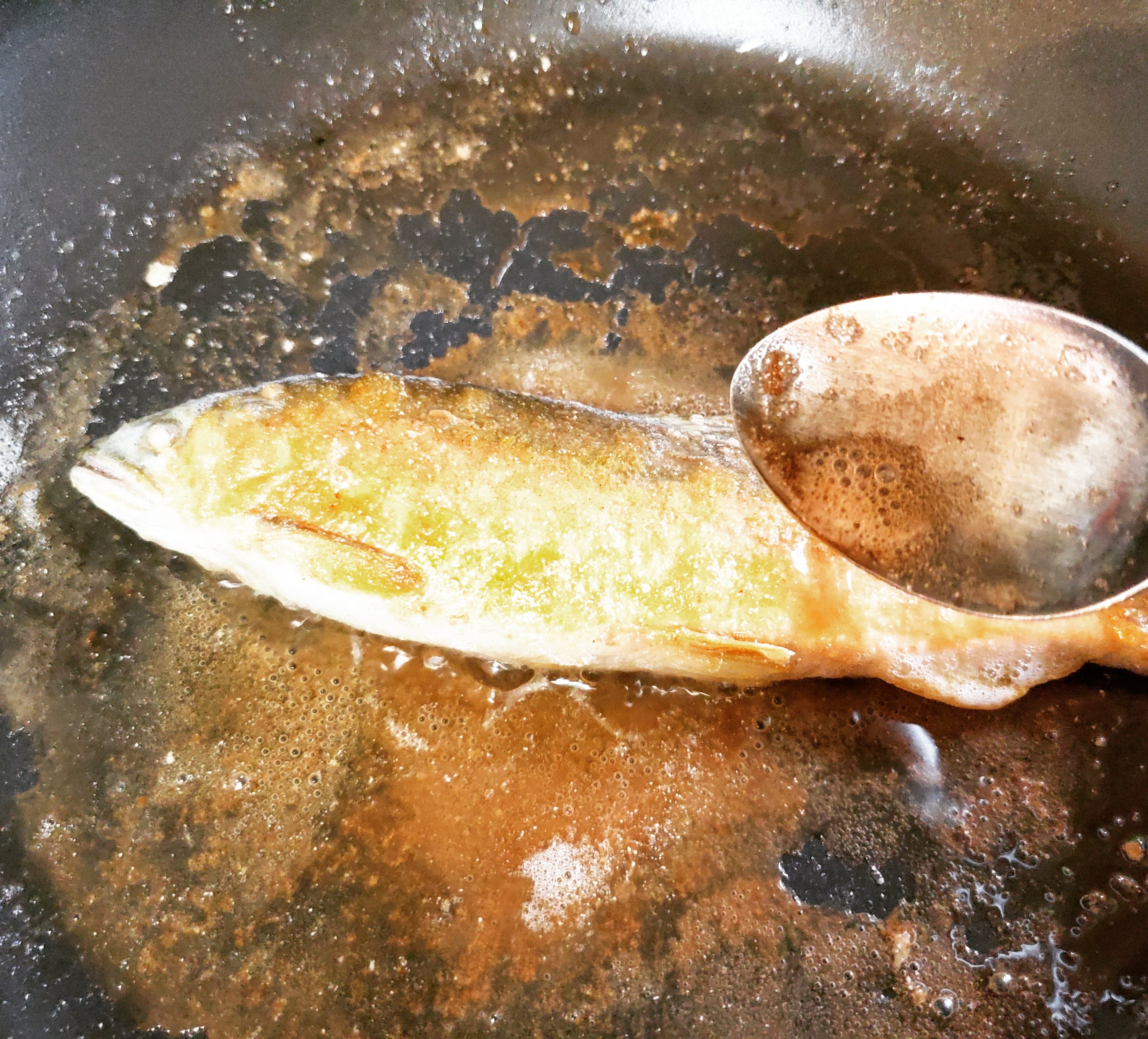 和のソースにバターとこしょうを利かせて、鮎のほろ苦いワタもおいしいムニエルの出来上がりです🙌