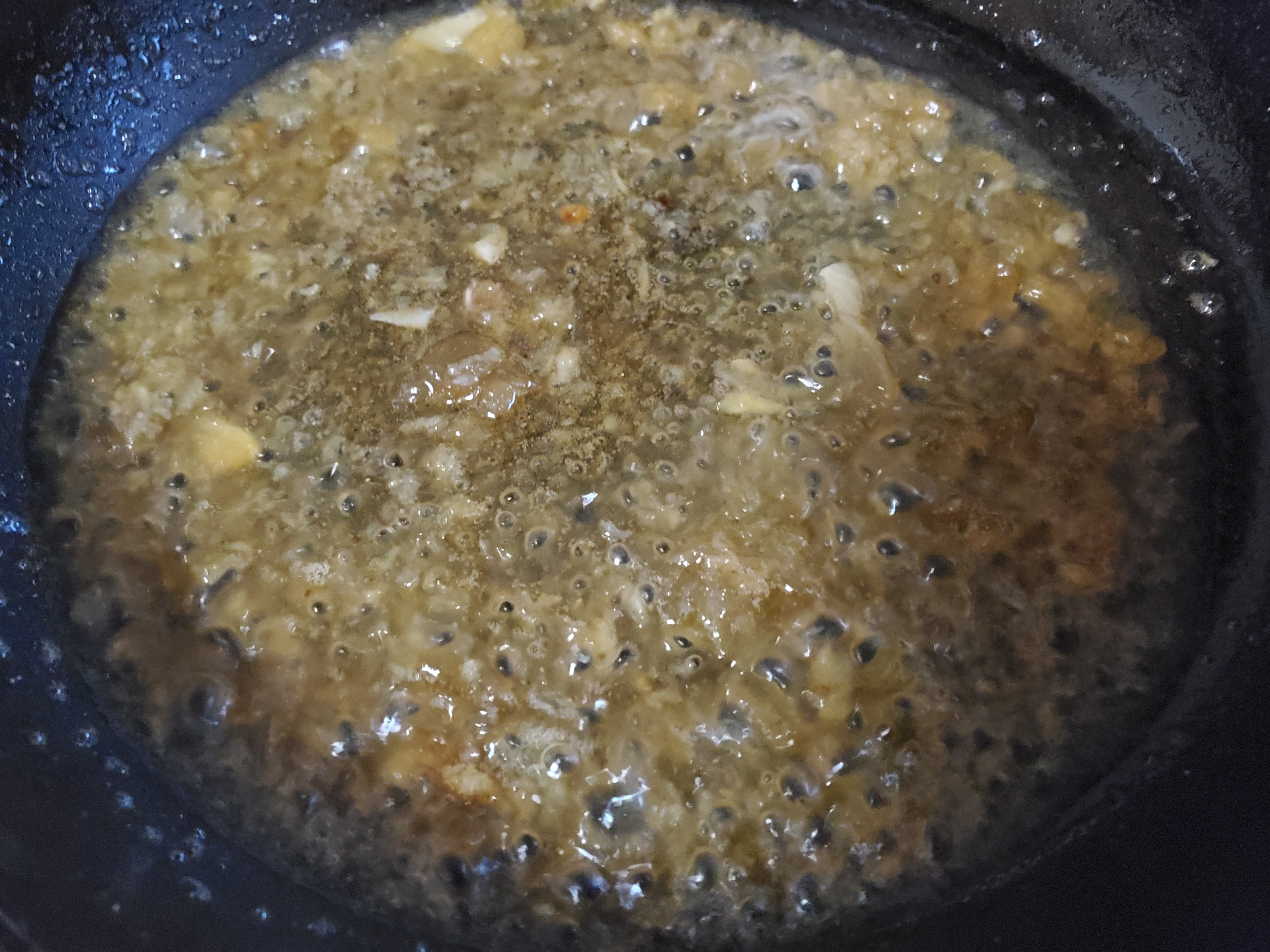 お肉を焼いたあとのフライパンにドレッシングベースを入れて少し煮詰めます。