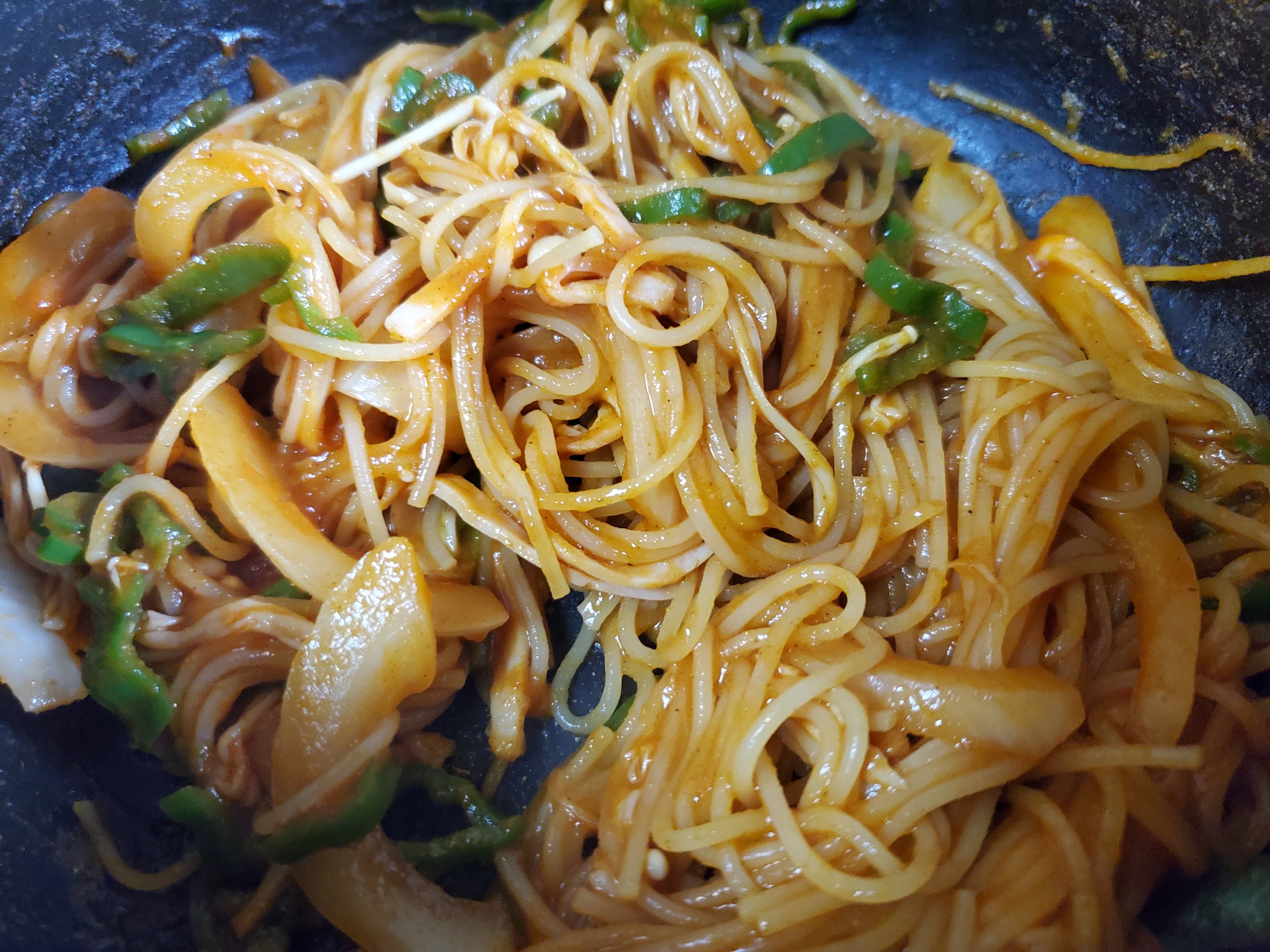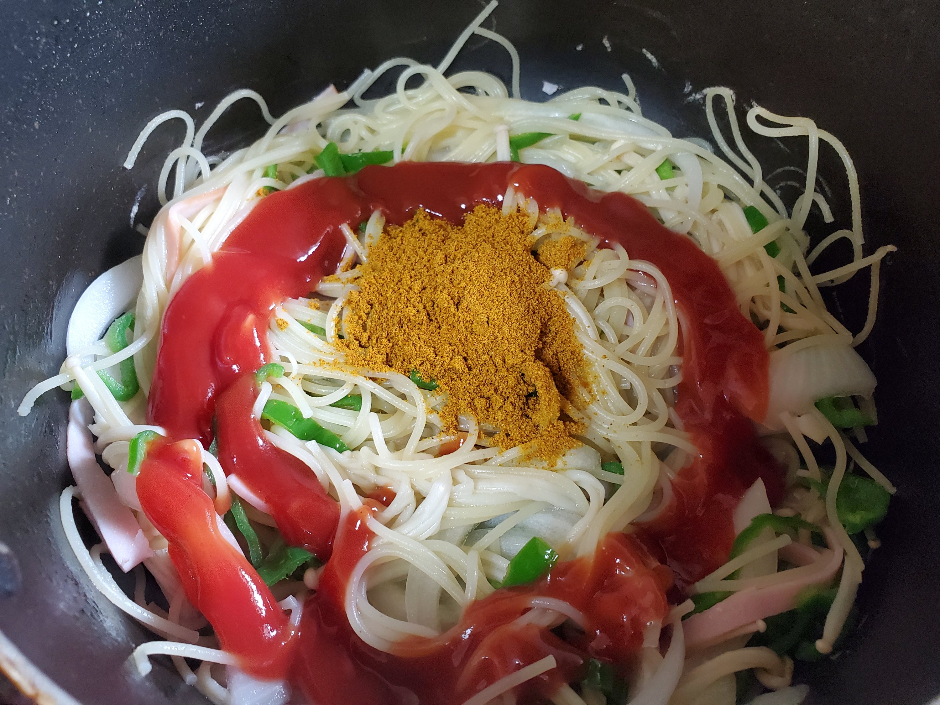 具は玉ねぎ、ハム、ピーマンに麺にからみやすいえのきをプラス。