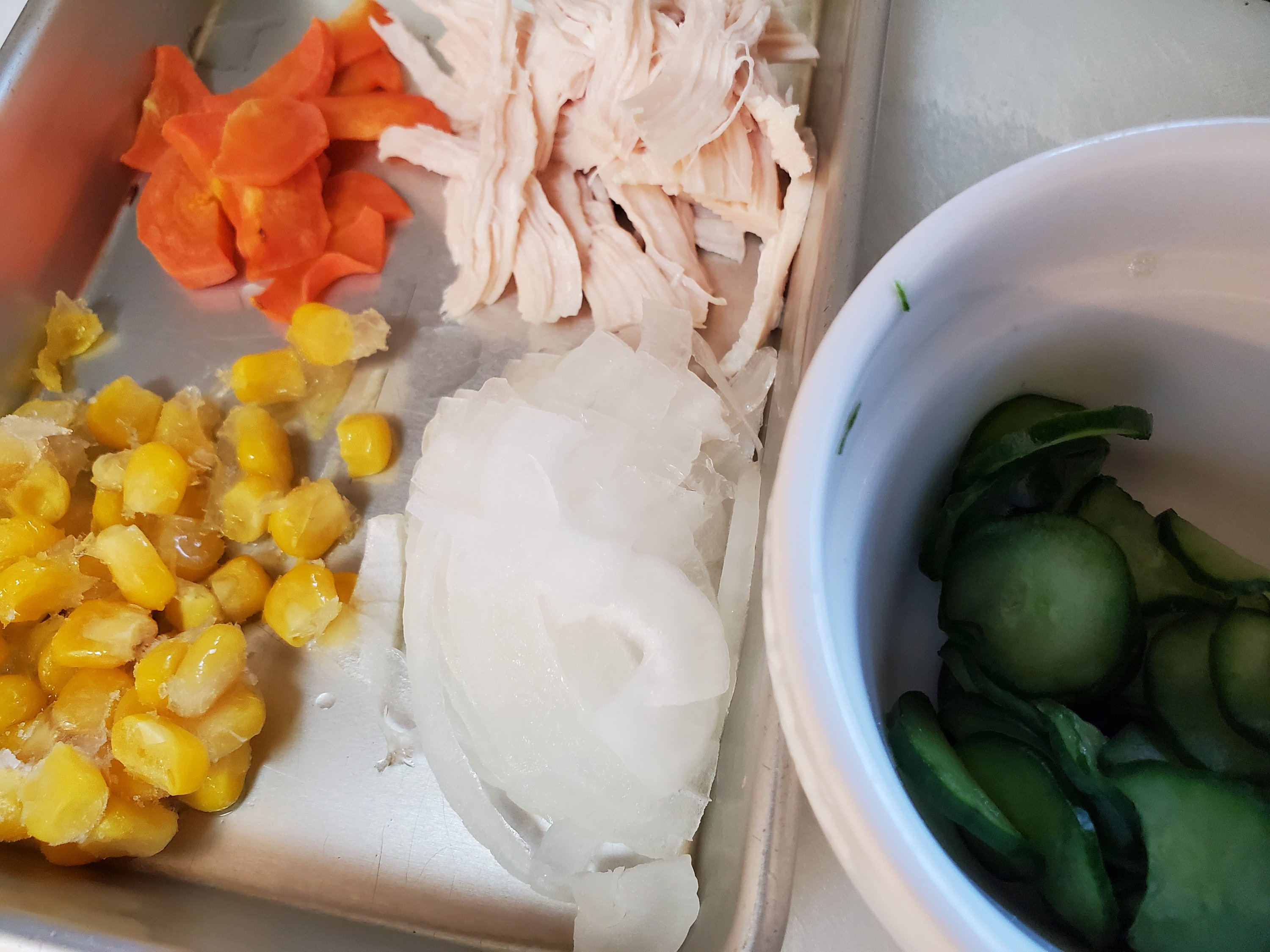 皮をむいてレンジにかけたいちょう切りのにんじん、