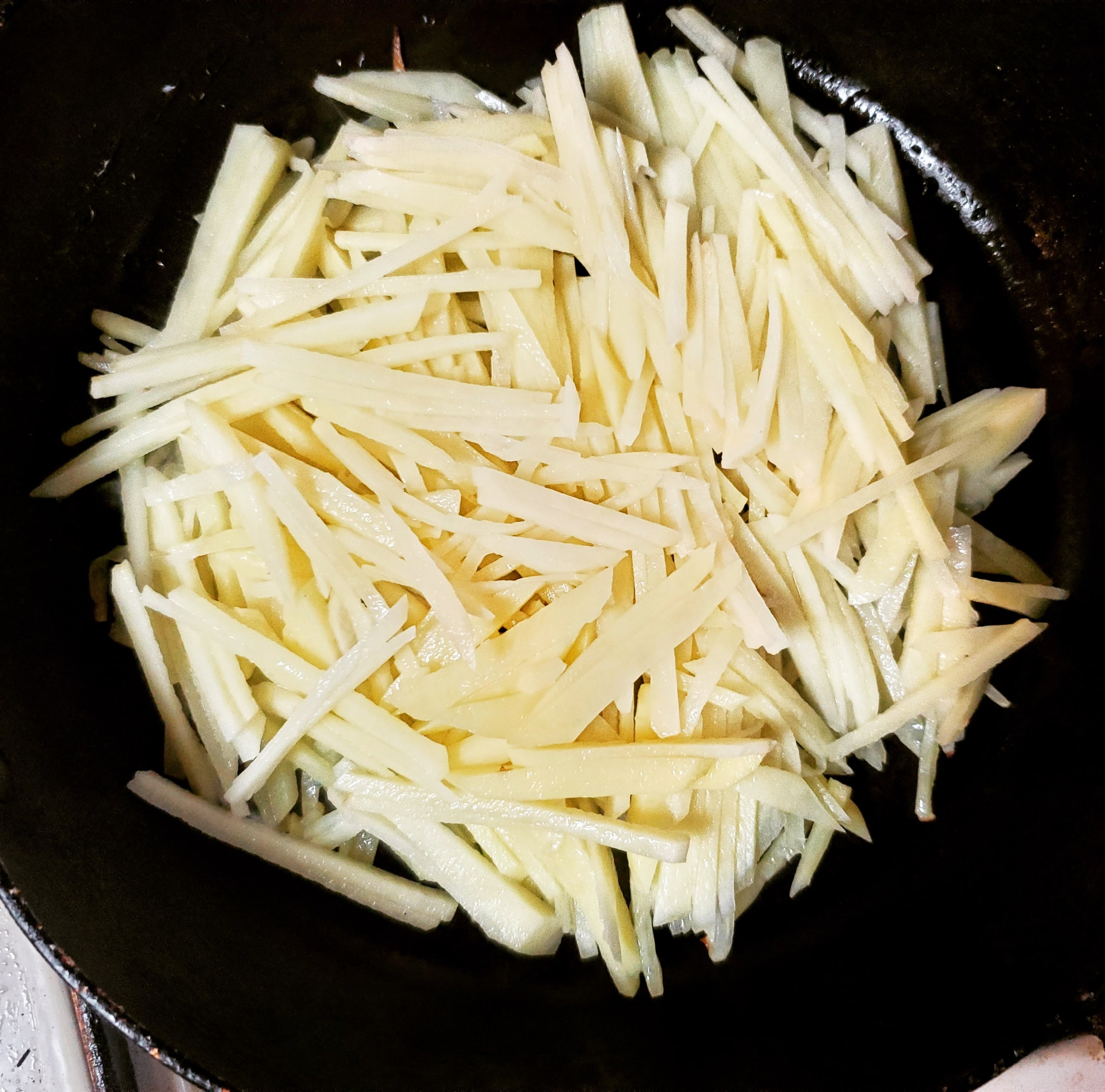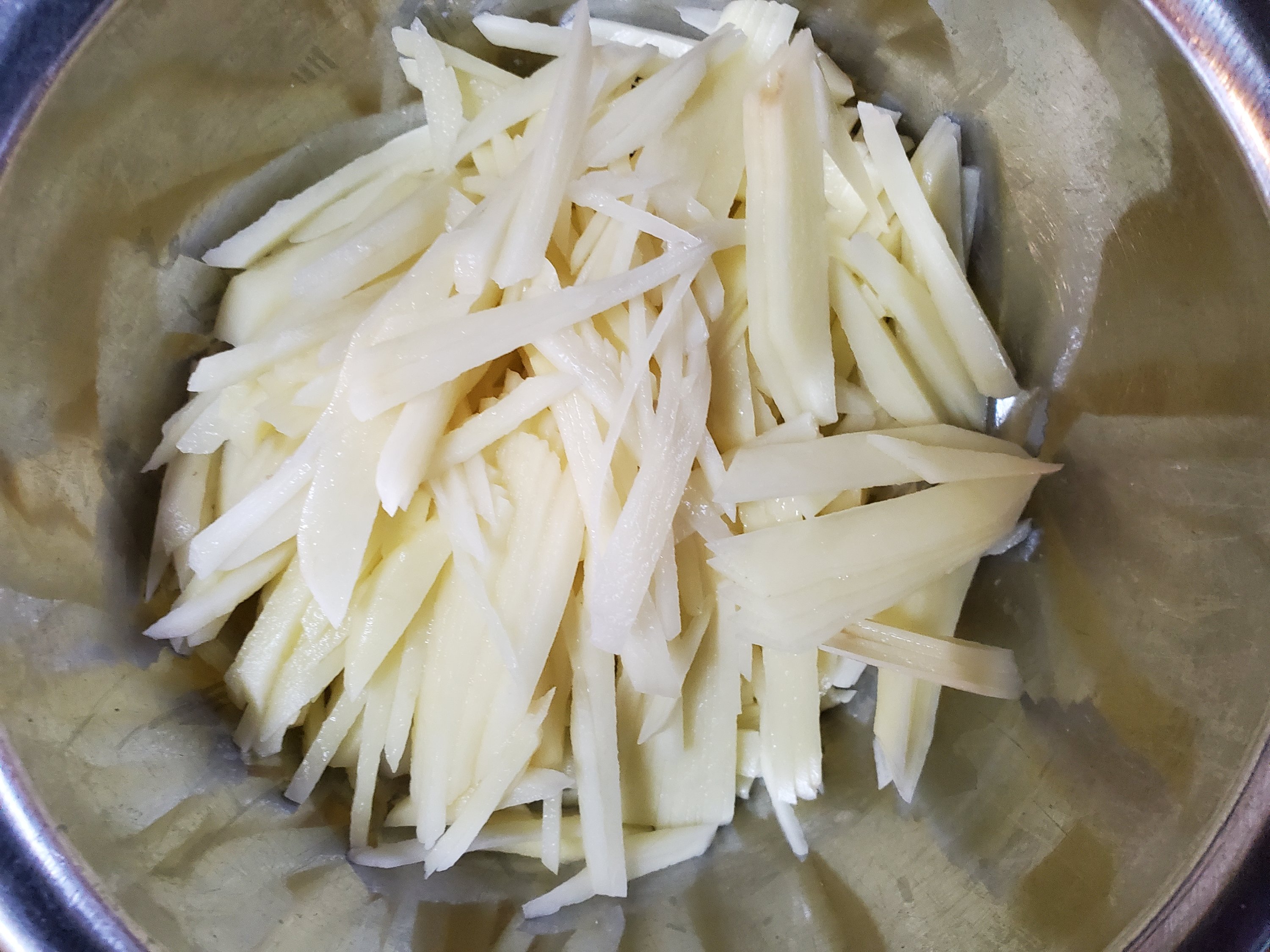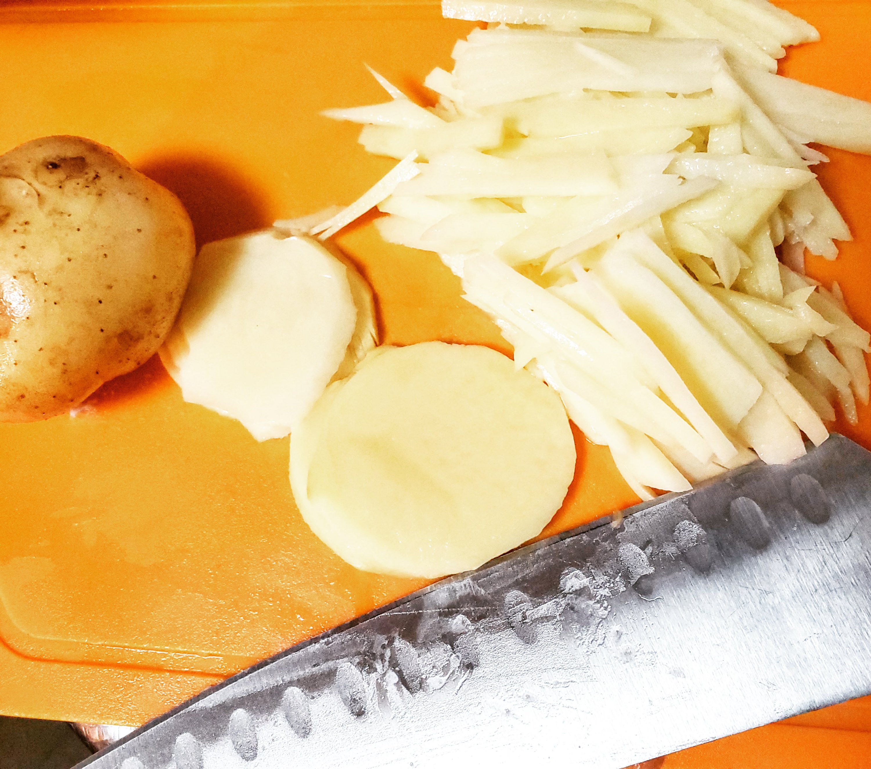 なので、でんぷんが流れてしまわないように、千切りしたじゃがいもは水にさらさないようにします。