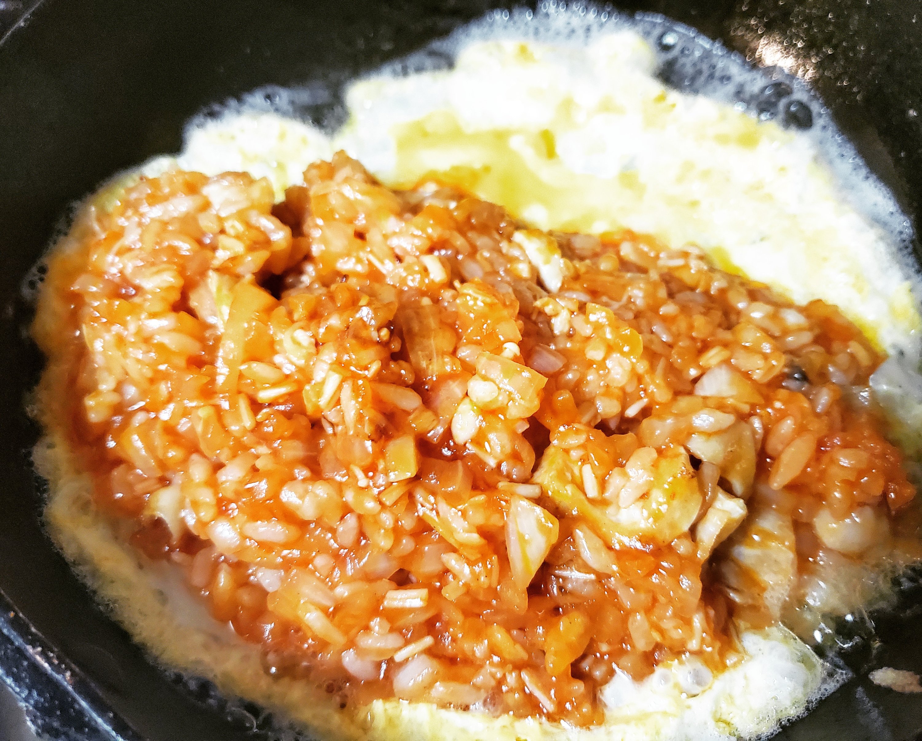 ちなみに、玉ねぎとえのきをたっぷりとみじん切りにして入れることで、ごはんの量を減らして作ってます。