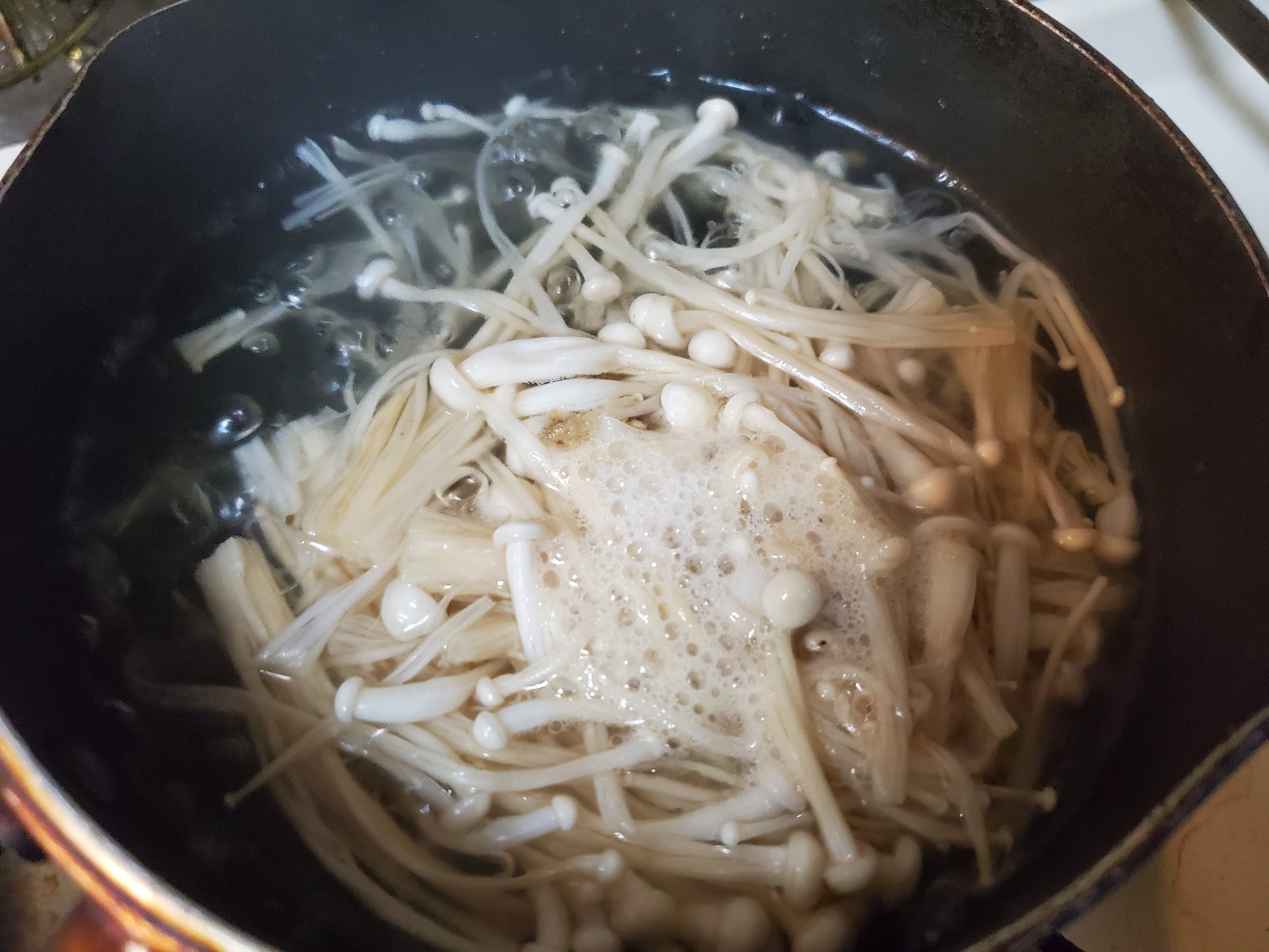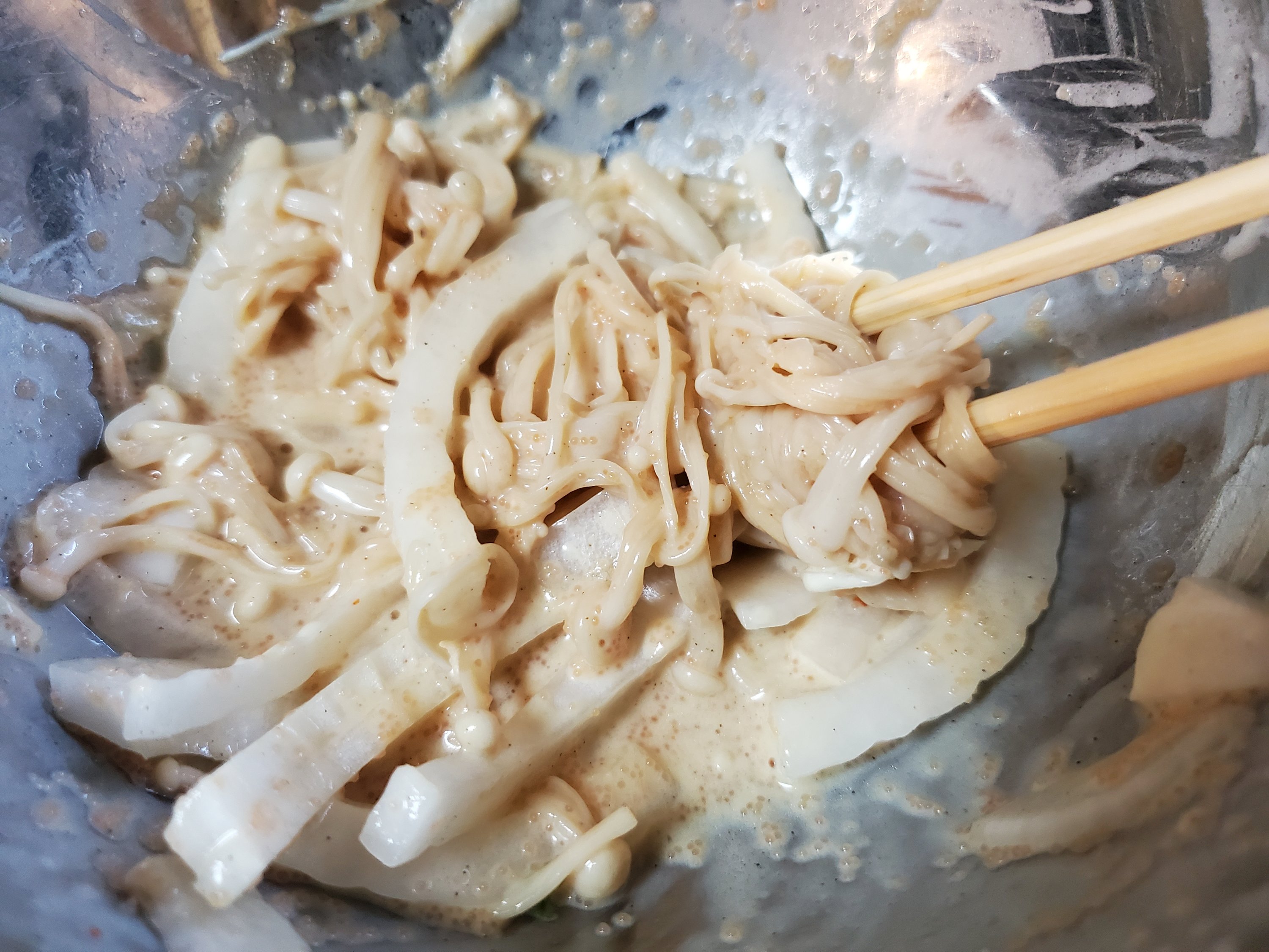 このレシピはふだんはたらこパスタを作るときのレシピですが、今回はおつまみ小鉢として楽しめるようにパスタのかわりに、えのきをたっぷり使って、食感に新玉ねぎを合わせてみました。