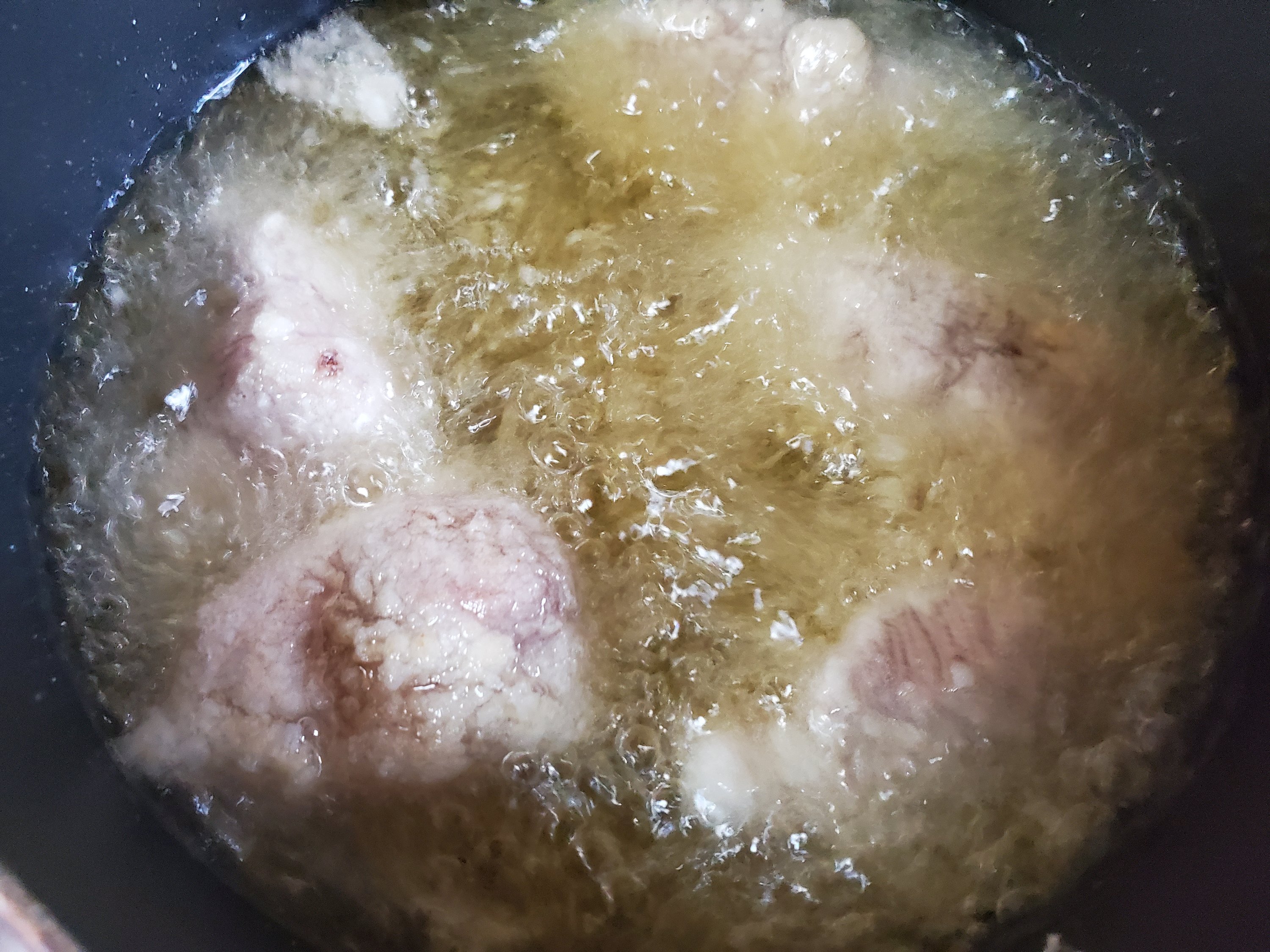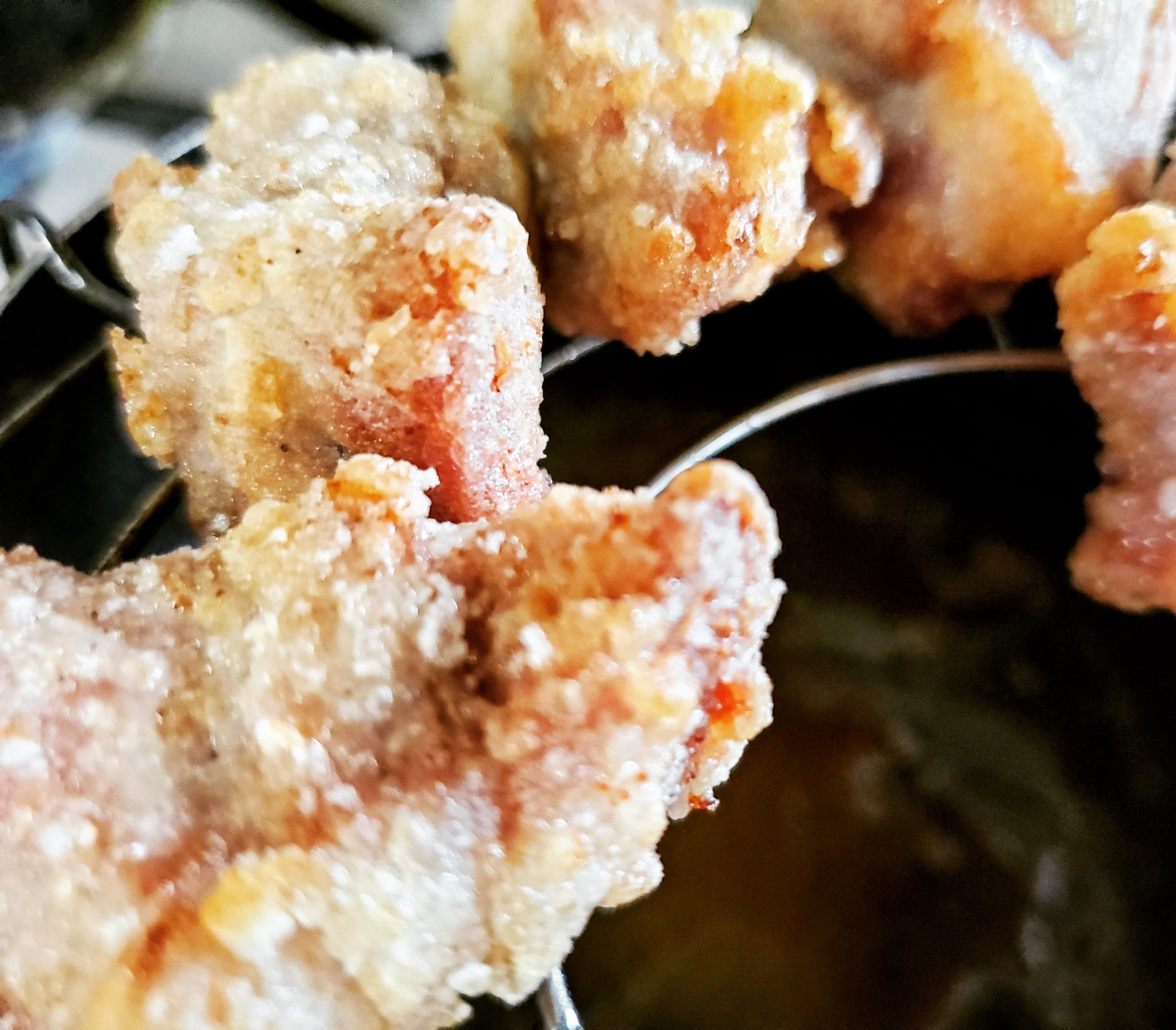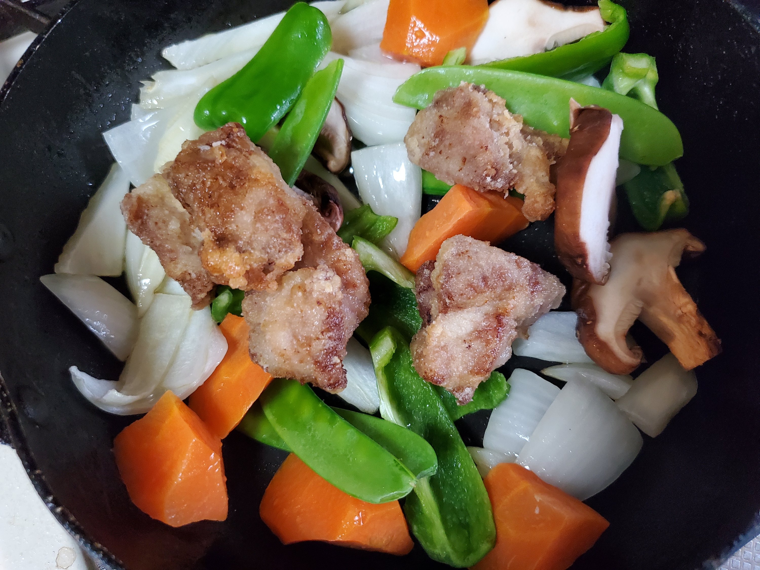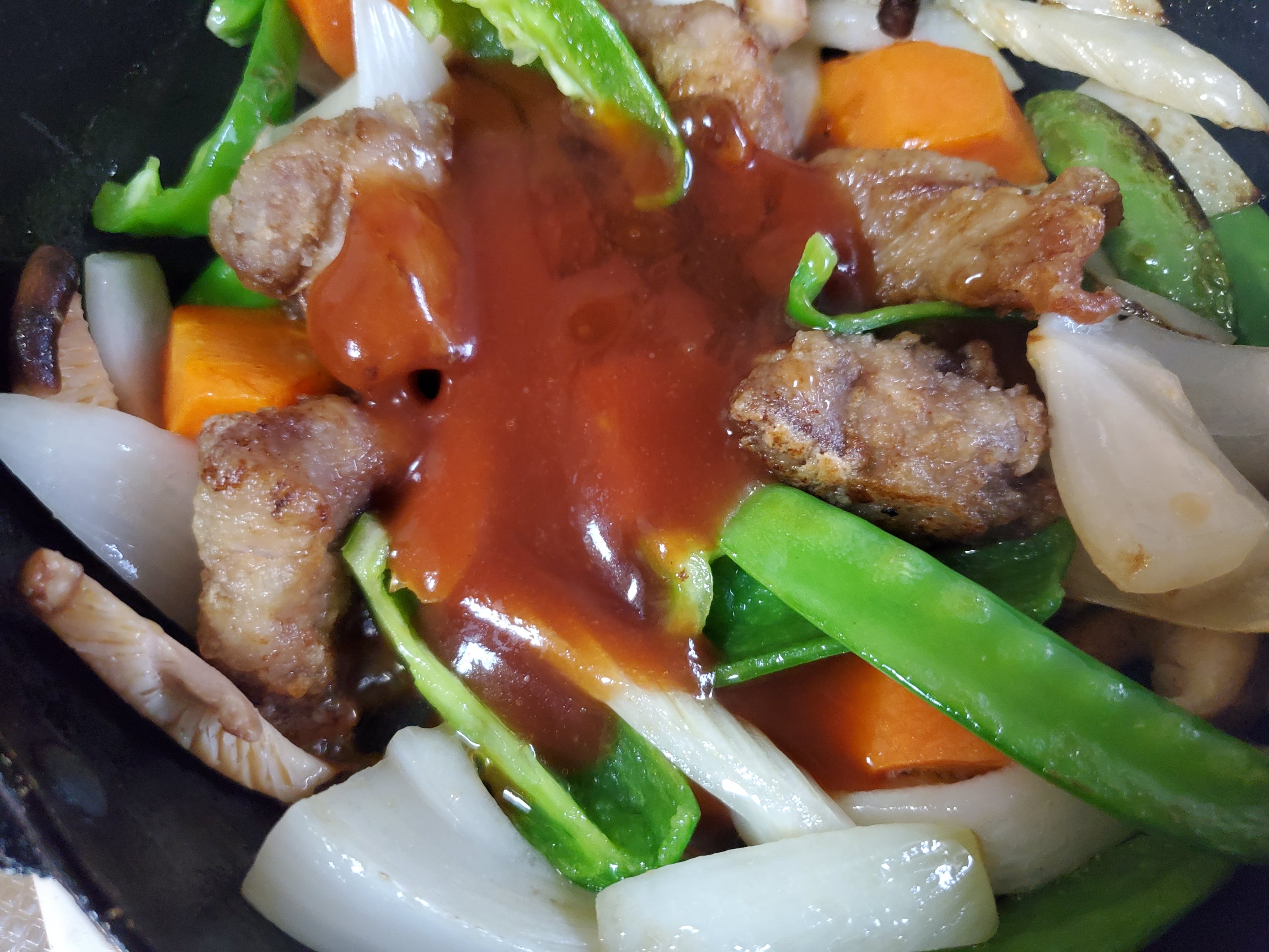 豚肉の衣の片栗粉がとけてたれにとろみがついてきたら、お好みの加減で火からおろしてできあがりです。