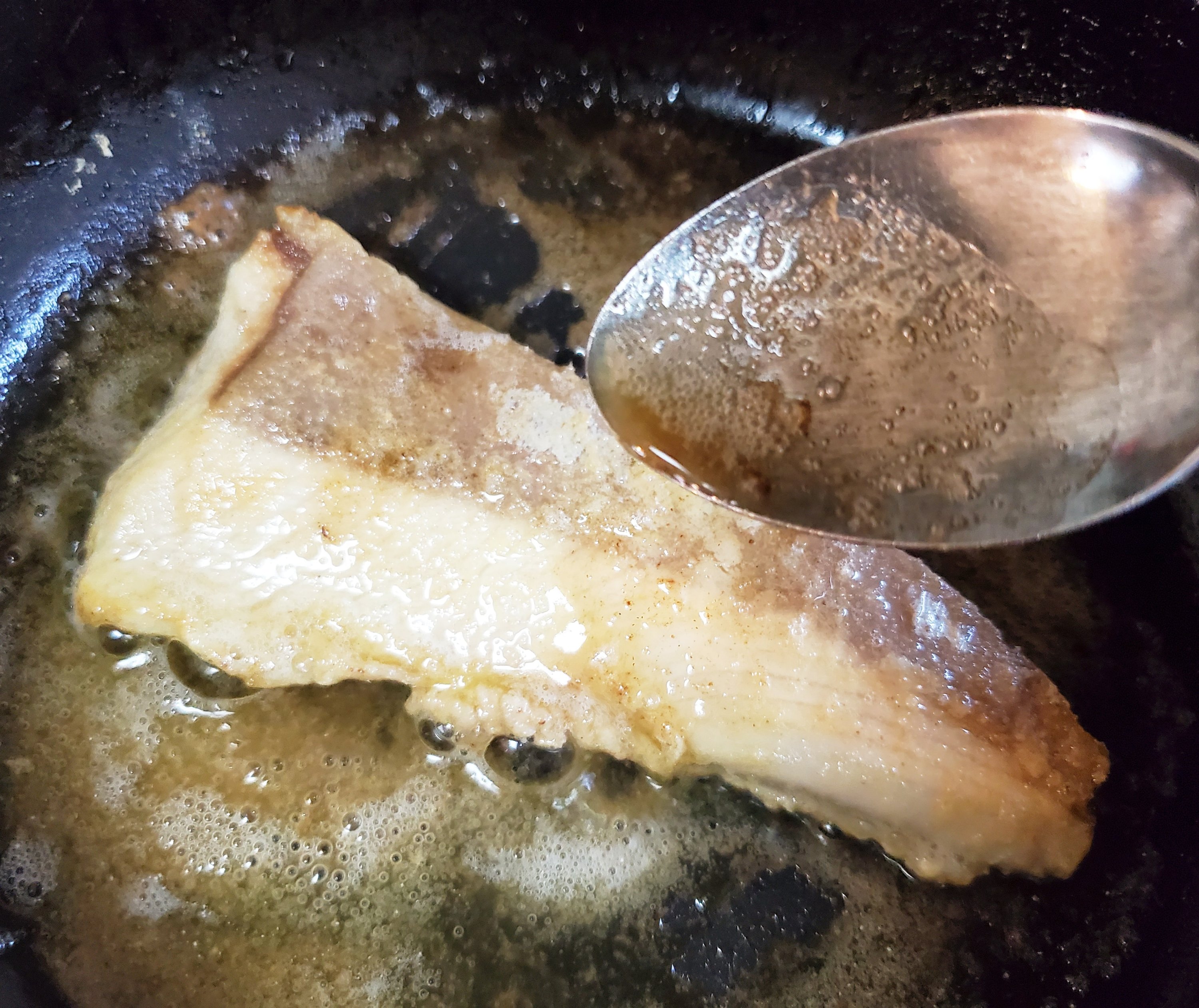ときどきスプーンで油を救ってかけながら、こんがりと焼き上げます。