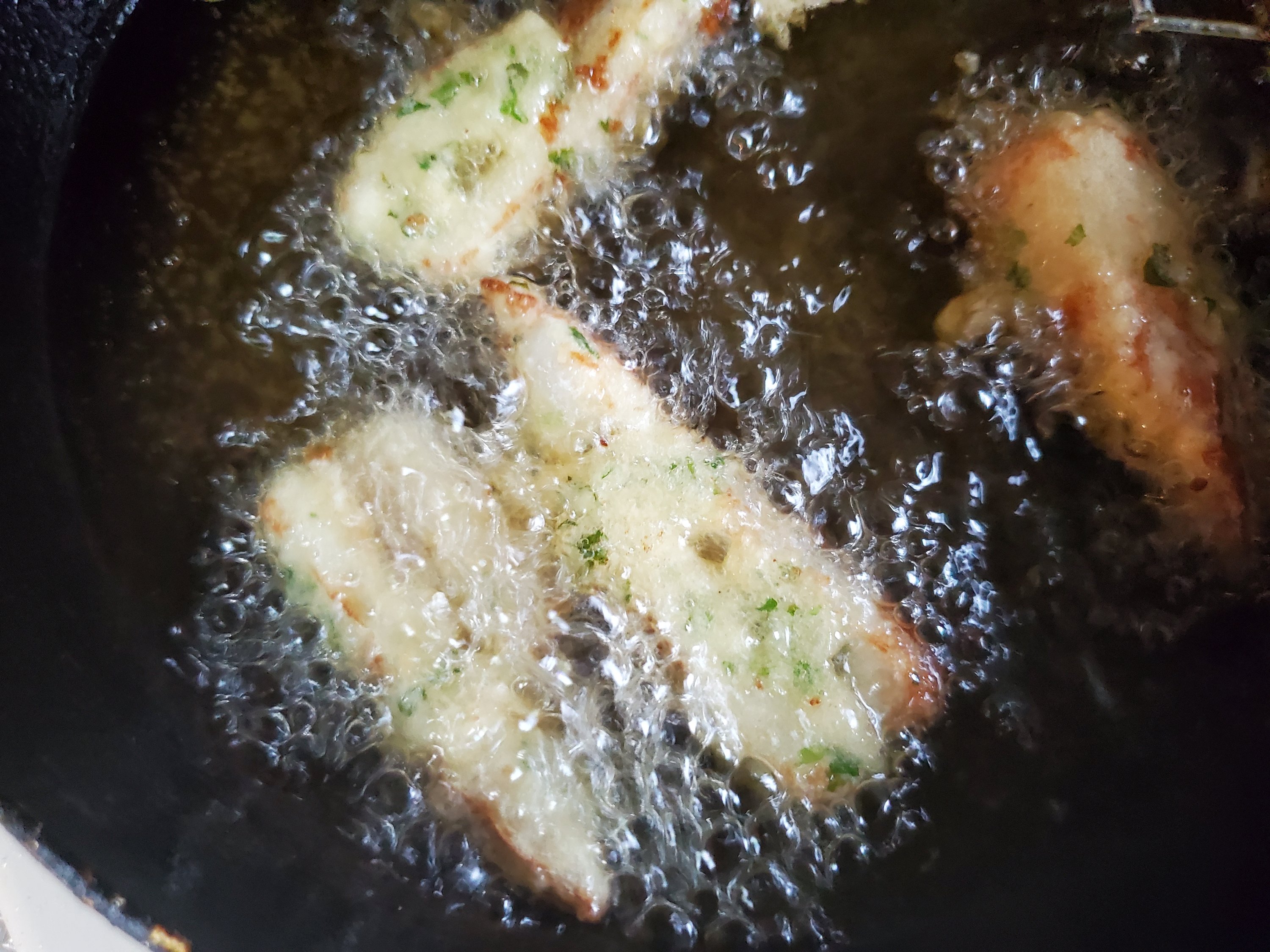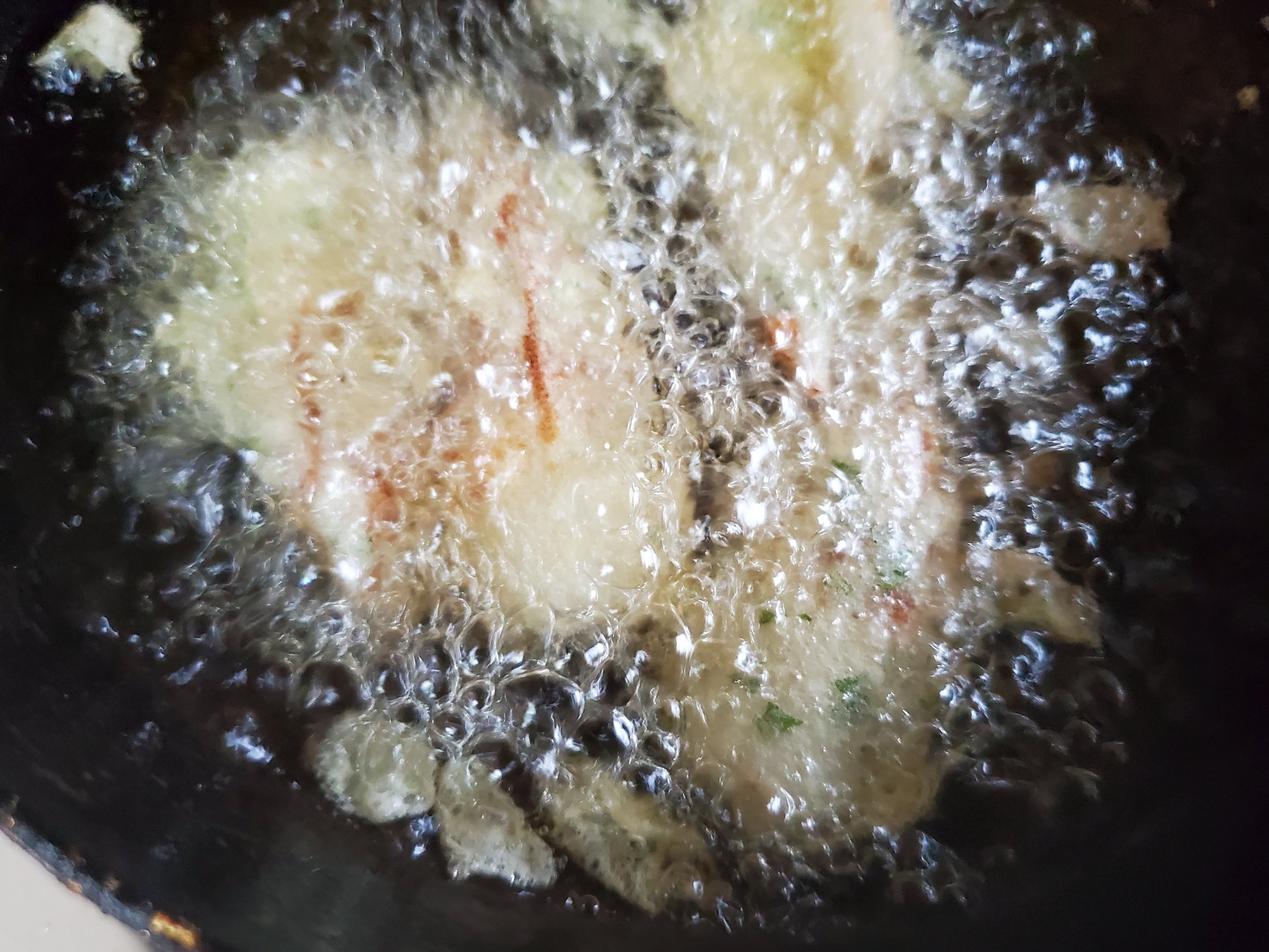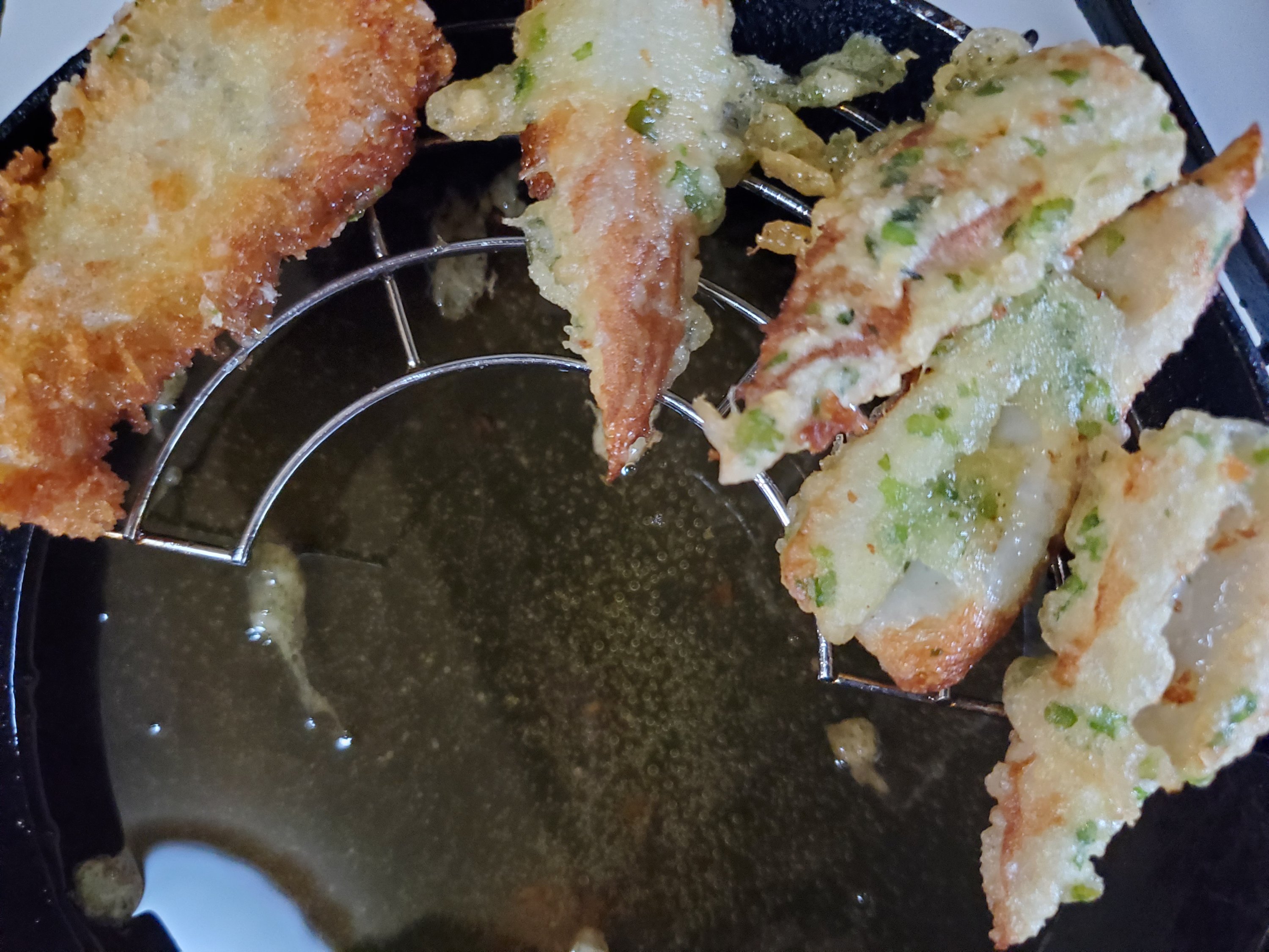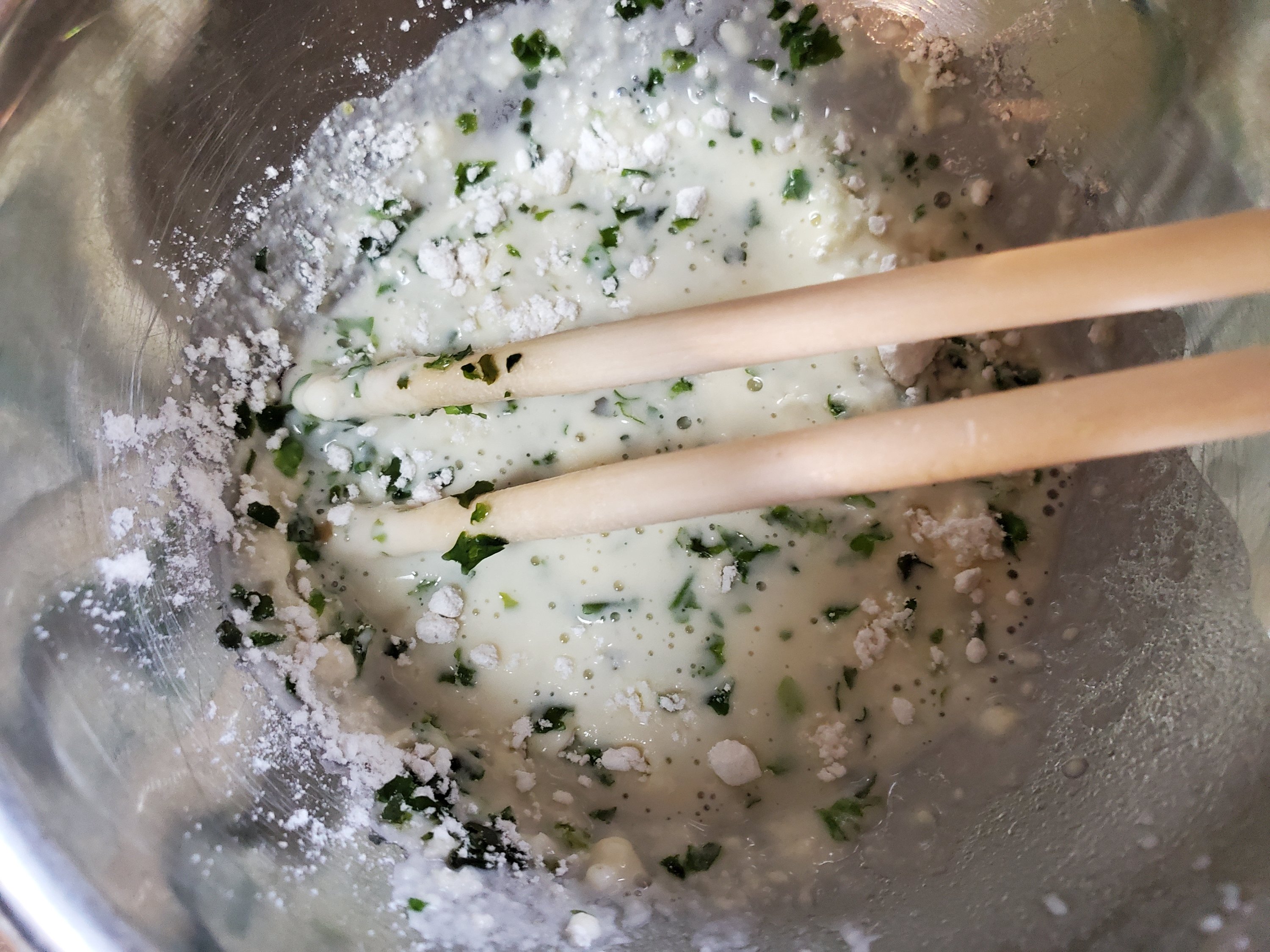 衣はてんぷら粉を水で溶いて、青のりを混ぜ込みます。